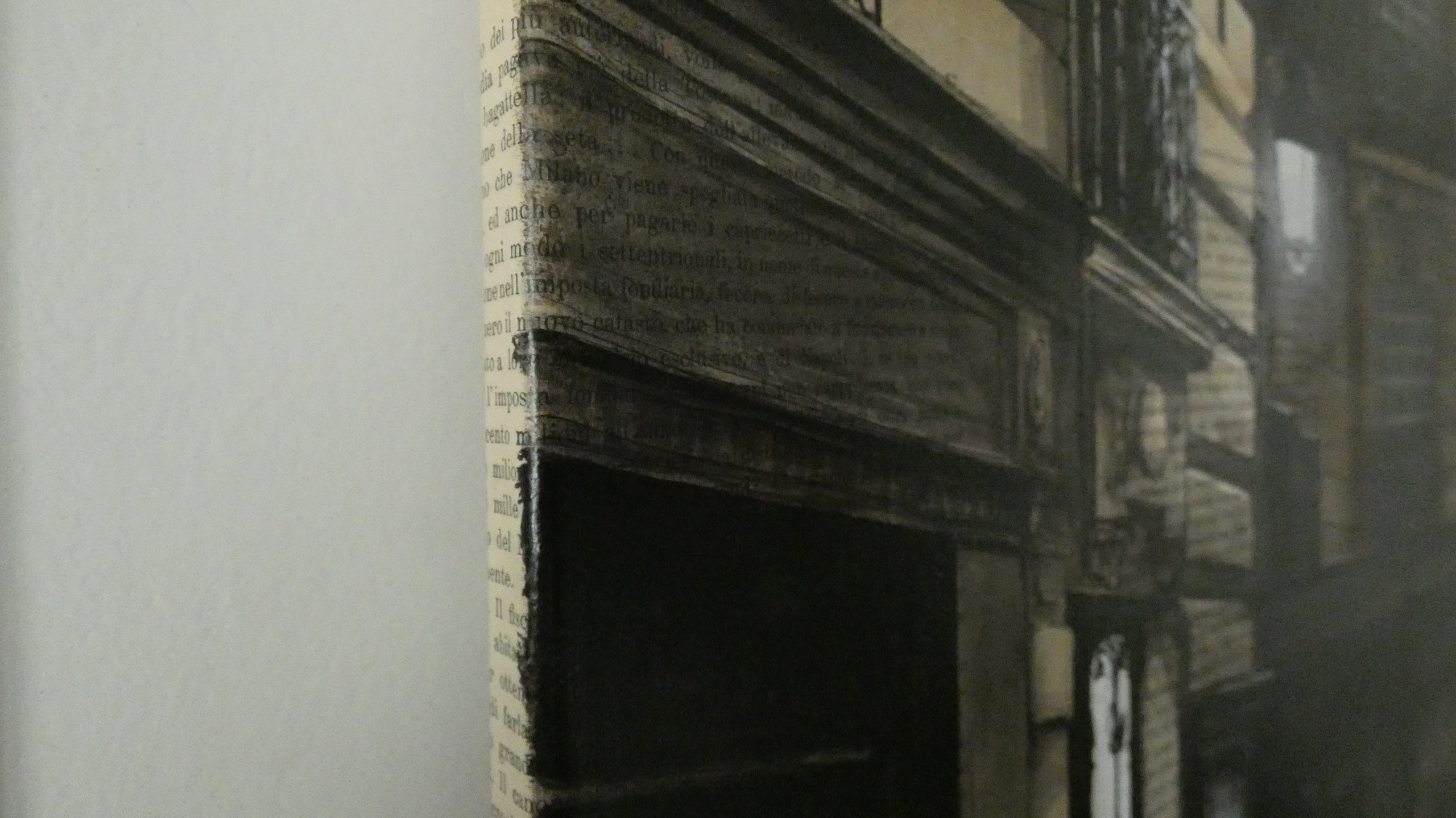 | Description | Ink and acrylic on old book pages mounted on canvas |