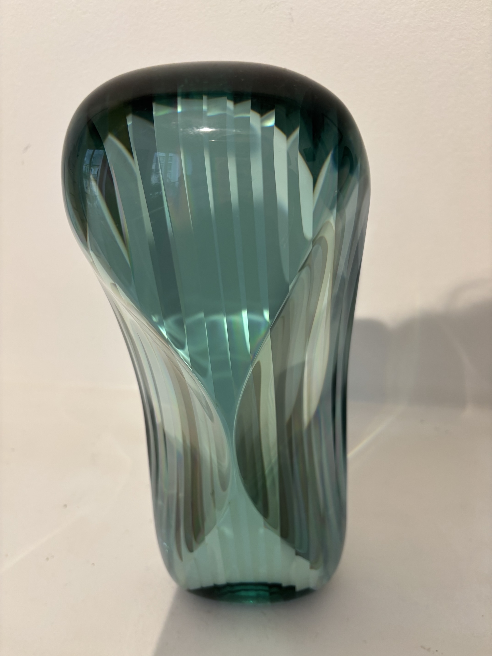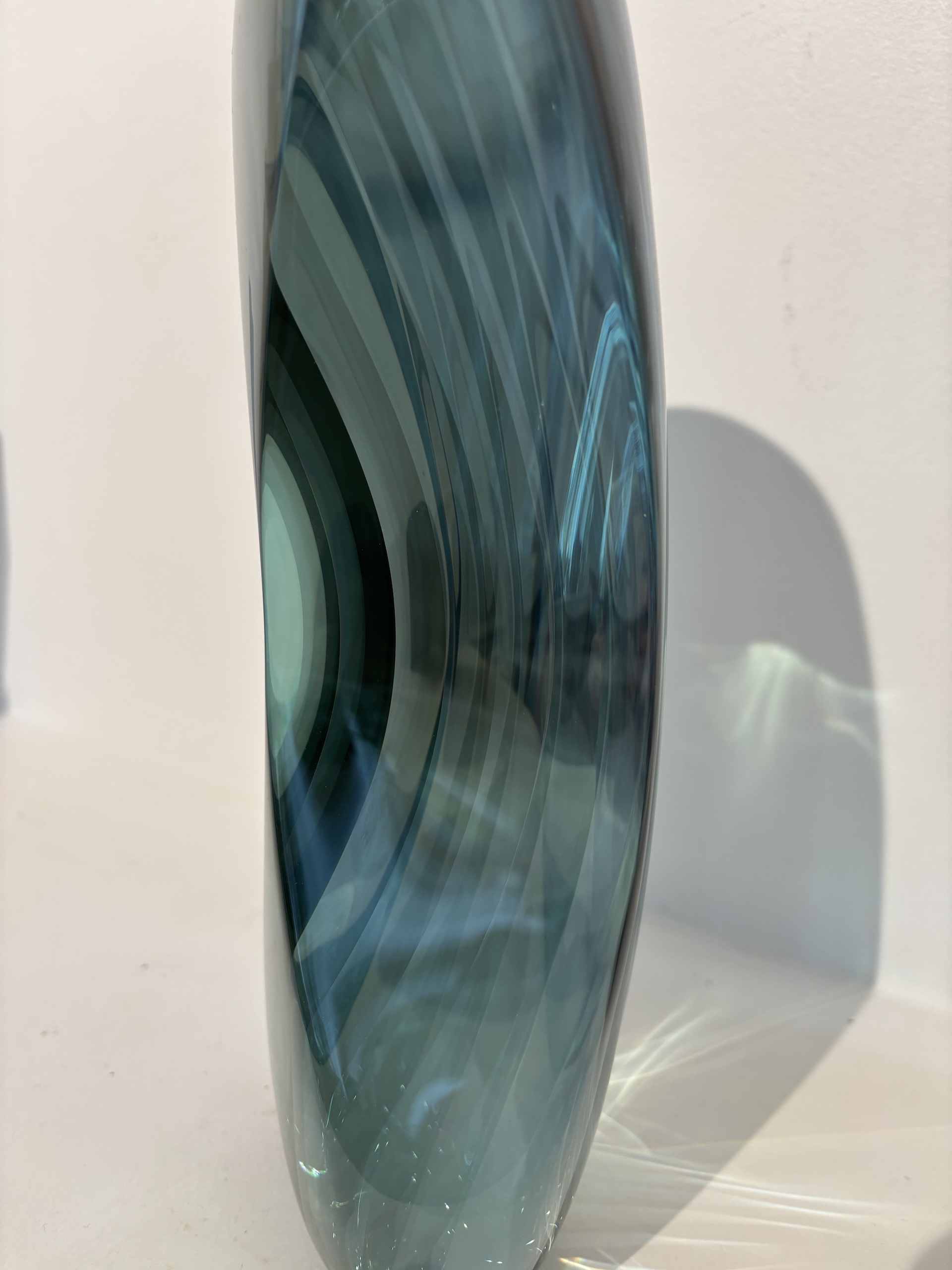 Toshio Iezumi ‘s sculpturing technique is long and complex. He starts by gluing glass sheets together, tinted green by the iron content, creating a deeper hued block of glass. He then uses an angle grinder, normally used for carving stone, to shape the sculpture. The next step is to remove the surface scratches with abrasive grinding grits. Finally, polishing with a felt buff gives the sculpture its transparency, and totally changes its appearance. The artist is looking for the perfect balance between shape (with grinding) and texture (with polishing), to bring out the artwork.