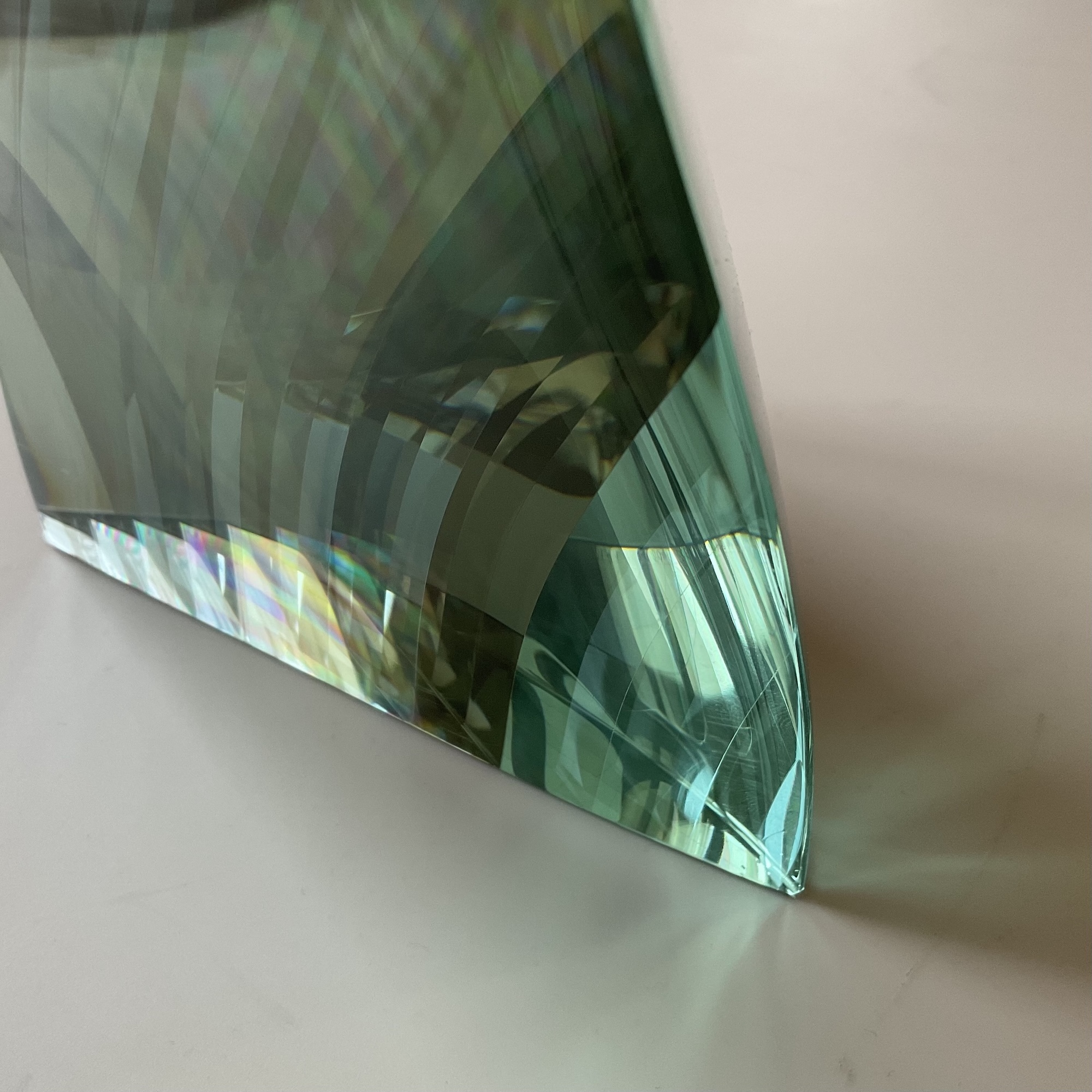 Toshio Iezumi ‘s sculpturing technique is long and complex. He starts by gluing glass sheets together, tinted green by the iron content, creating a deeper hued block of glass. He then uses an angle grinder, normally used for carving stone, to shape the sculpture. The next step is to remove the surface scratches with abrasive grinding grits. Finally, polishing with a felt buff gives the sculpture its transparency, and totally changes its appearance. The artist is looking for the perfect balance between shape (with grinding) and texture (with polishing), to bring out the artwork.