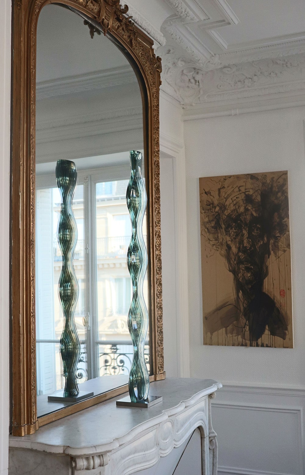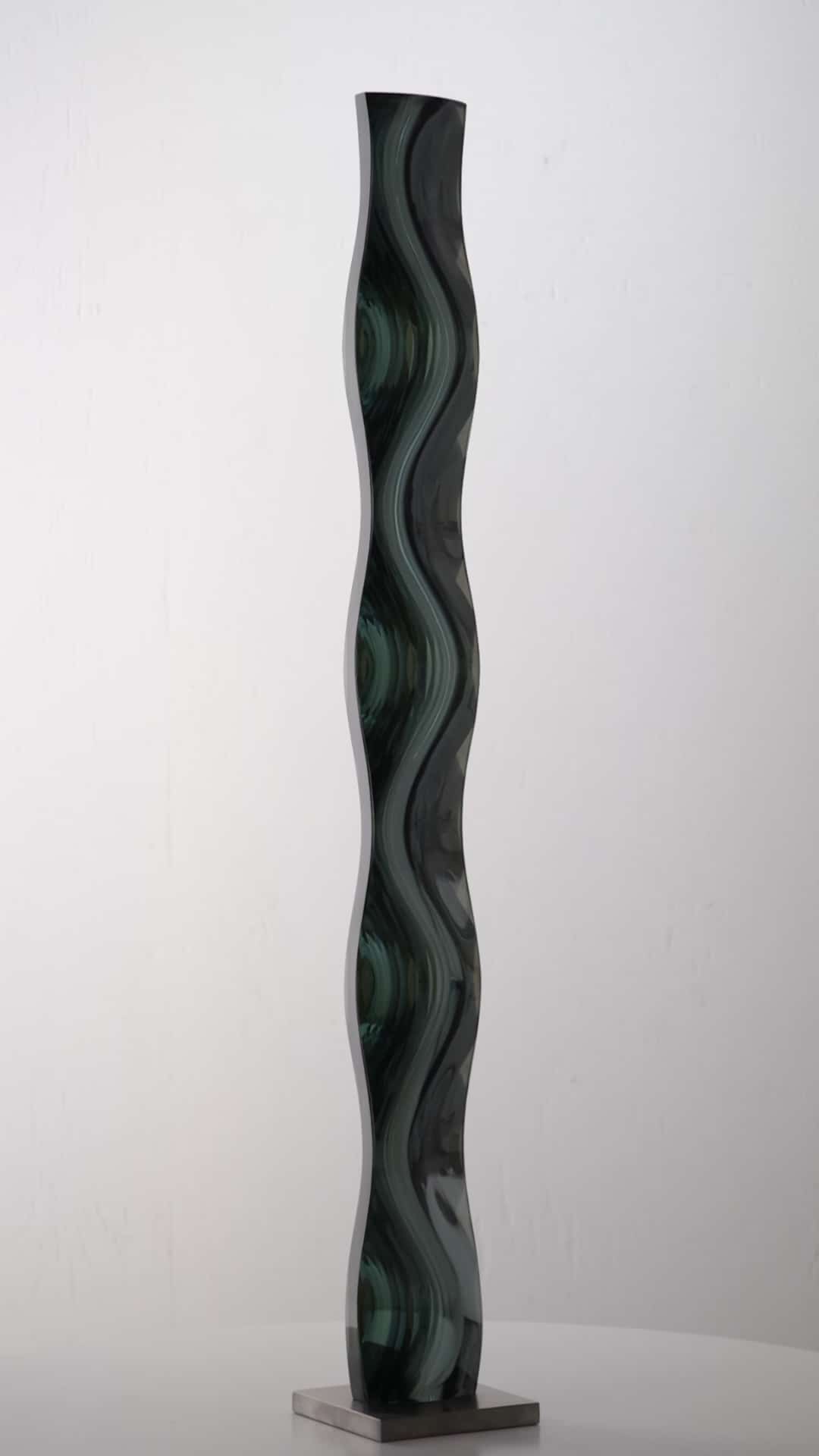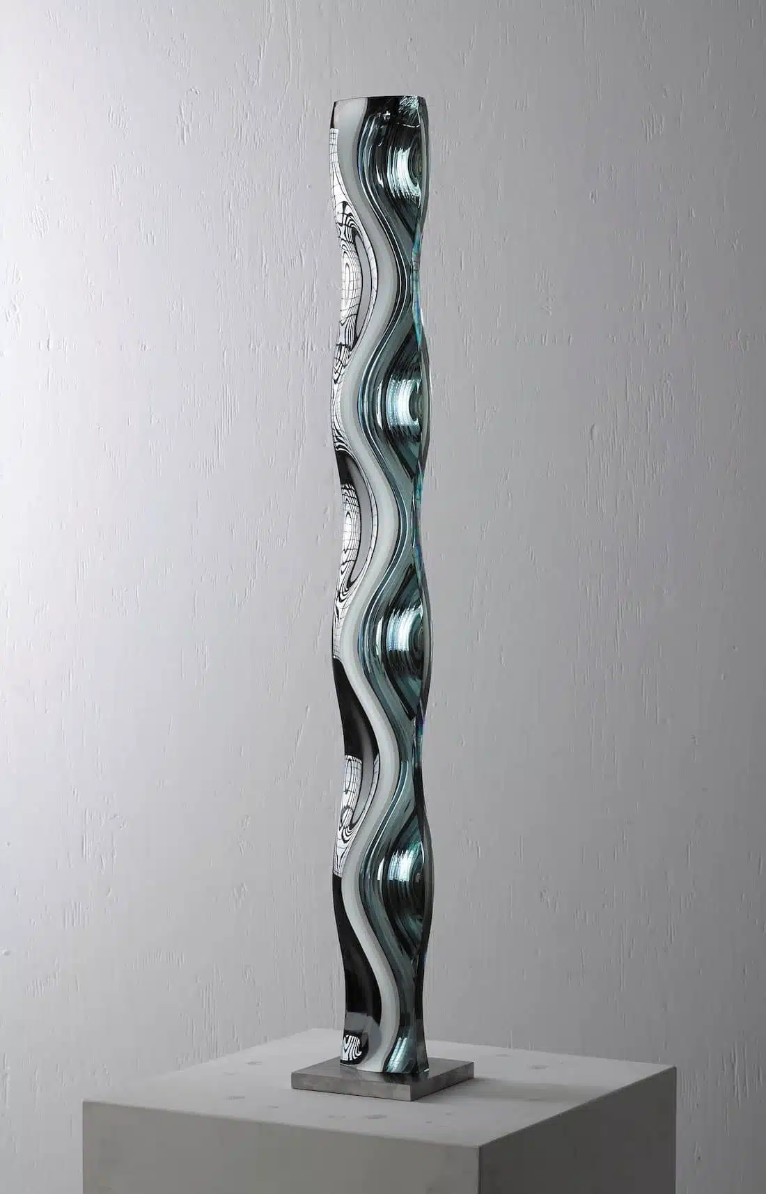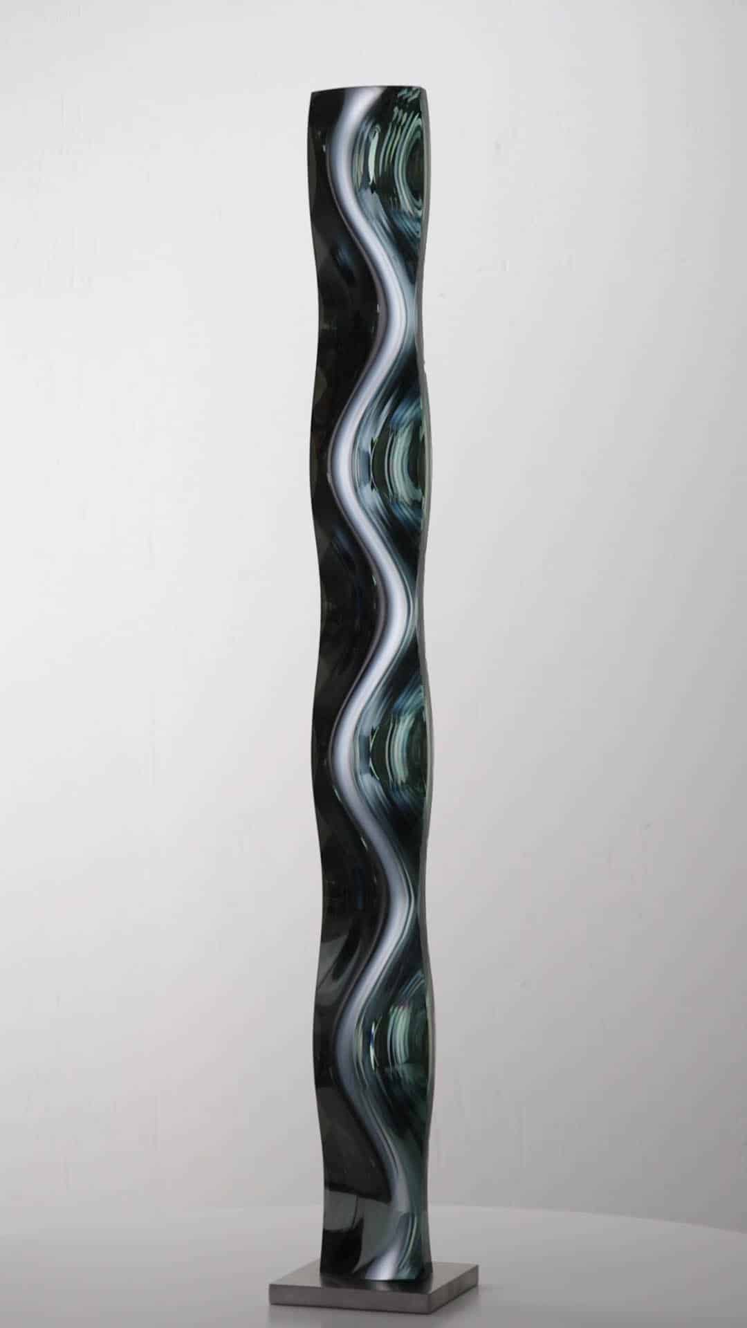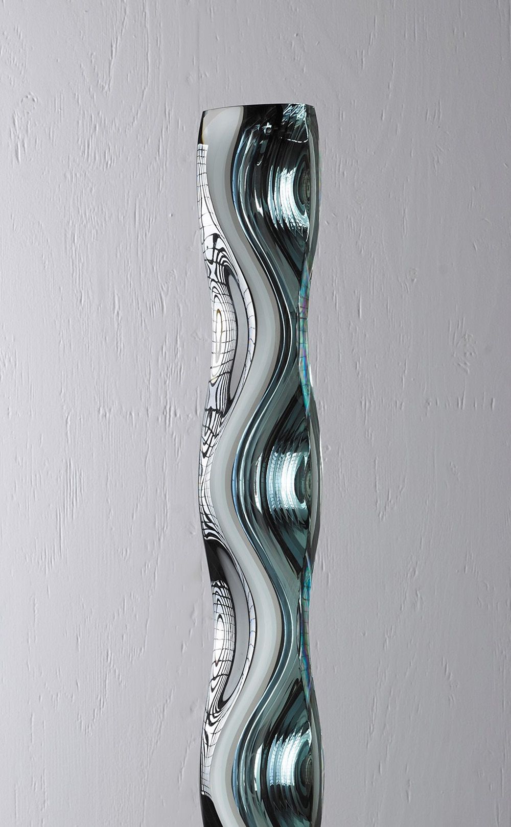 In the ‘Move’ series, which began in the 2000’s, the artist presented vertical sculptures standing with a powerful and delicate presence. For the series, Toshio Iezumi worked especially on the waves, alternating convex and concave forms to give the sculptures an effect of movement. The artist also uses a semi-transparent mirror, placed inside the artwork to further accentuate the reflections and light diffusion.
