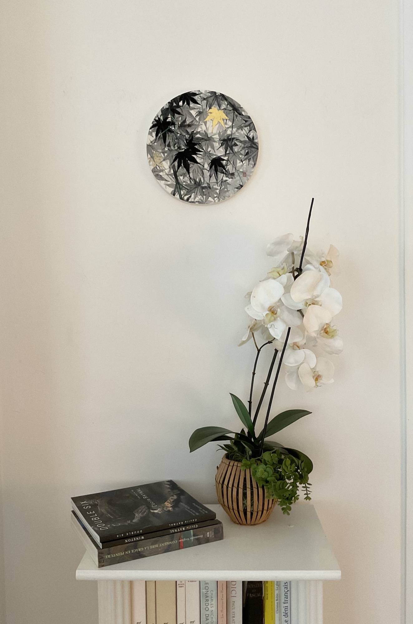 Through her paintings, the artist sublimates these places varying the seasons and times in her several depictions. Plum and cherry blossoms, pines, weeping willows, Lumi Mizutani places a lot of importance on nature and trees in her artworks. This series is characterized by the use of India ink combined with color and the use of gold, copper and silver leaves.