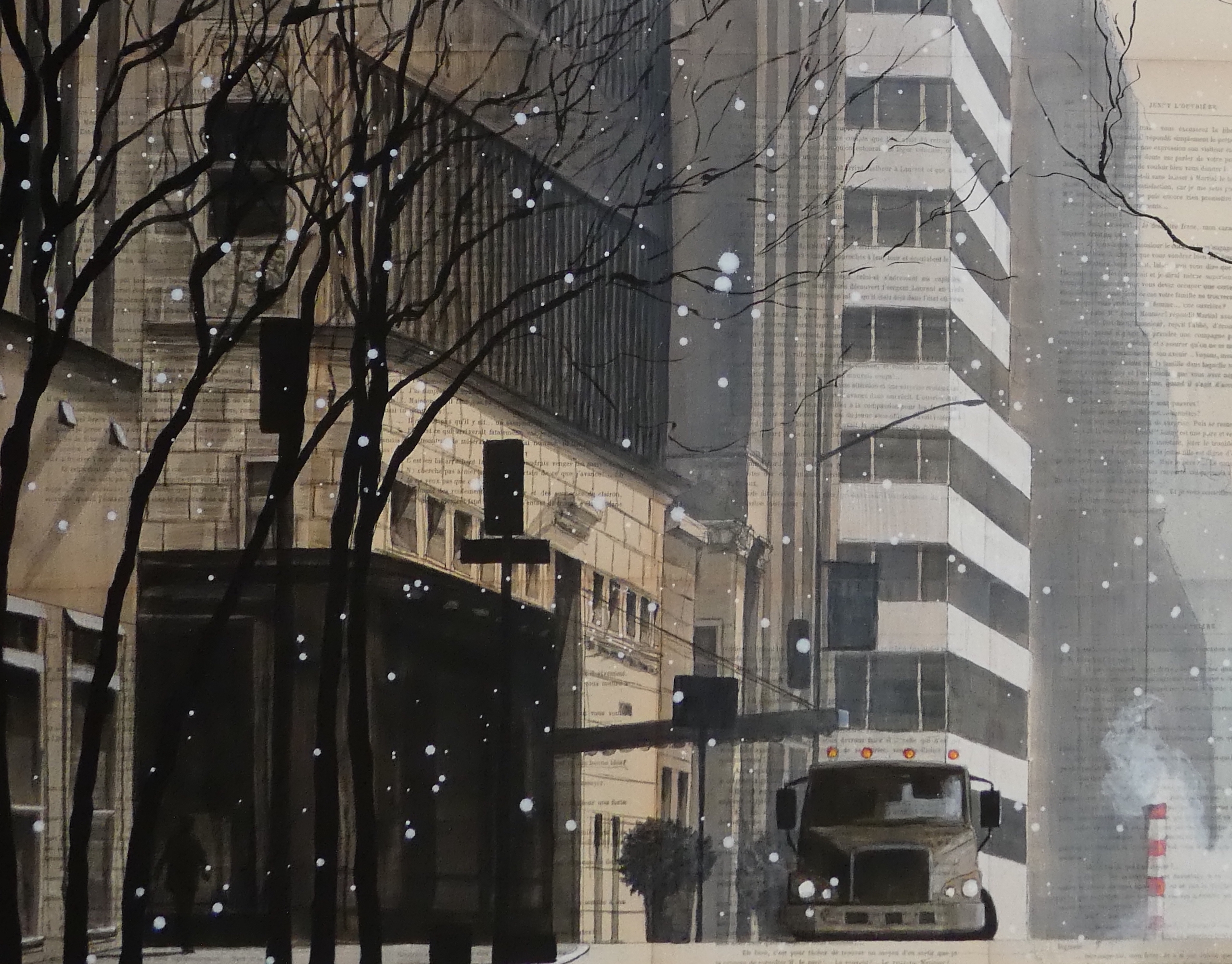 Megacities are the artist’s favorite subject. Through his paintings, Guillaume Chansarel attempts to capture the city’s graphic identity, as a photographer would press the shutter button on his camera. The uniqueness of the artist’s work lies in the realistic aspect of his work but also on the original use of an innovative support : pages of printed old books onto which he draws and then paints, telling a completely new story.