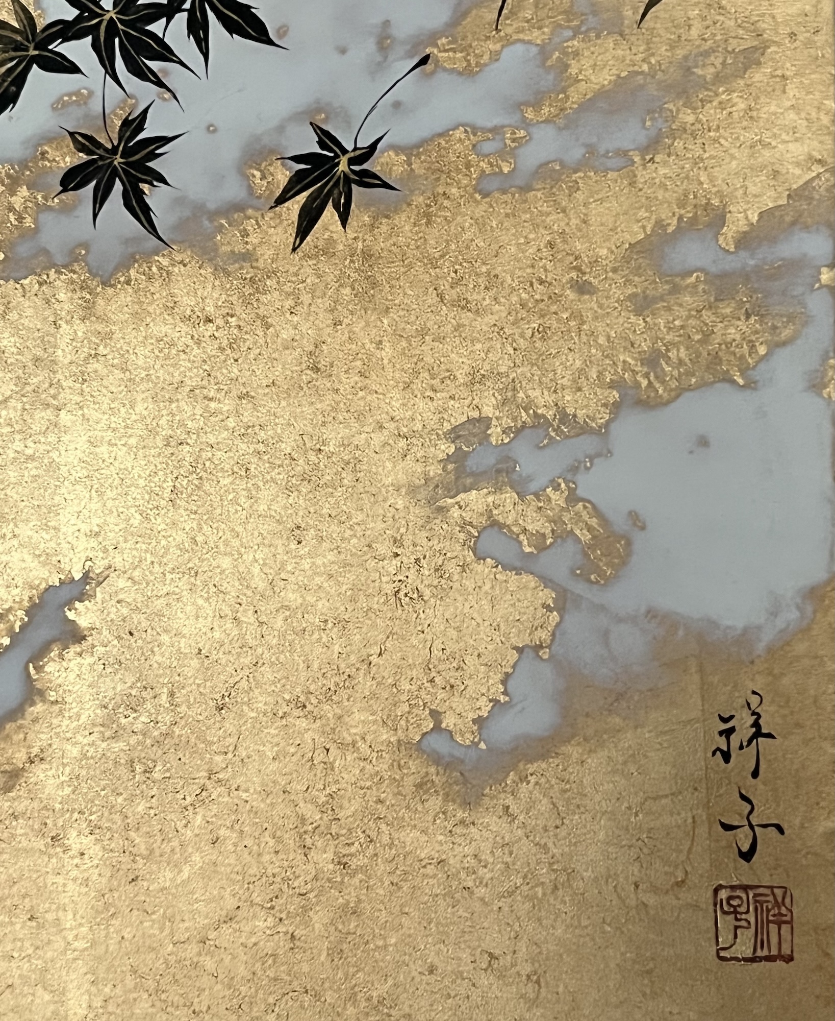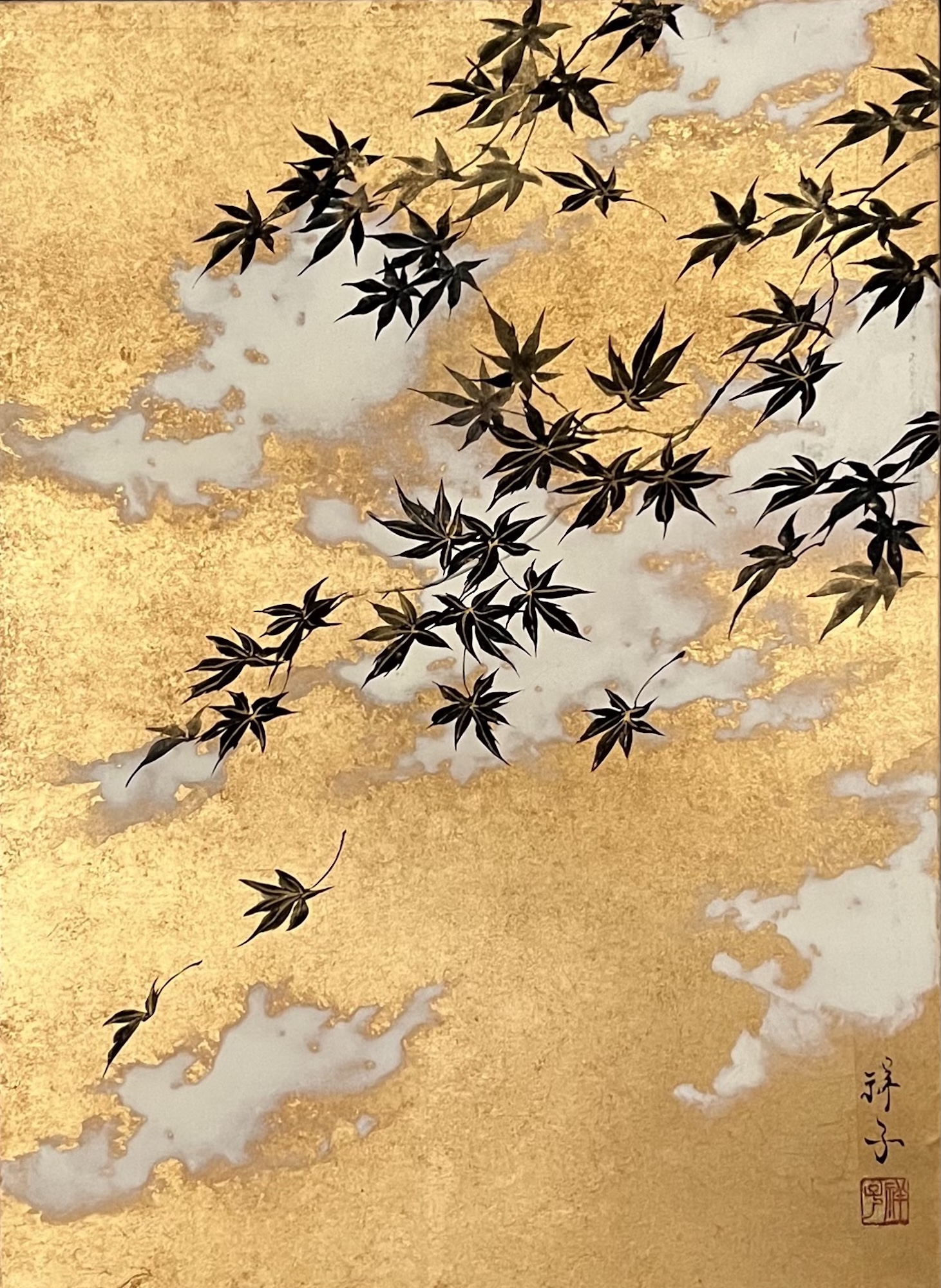 Melody of the Maple is a painting by Japanese artist Shoko Okumura created with pigments, Sumi ink and gold leaf on Japanese paper.