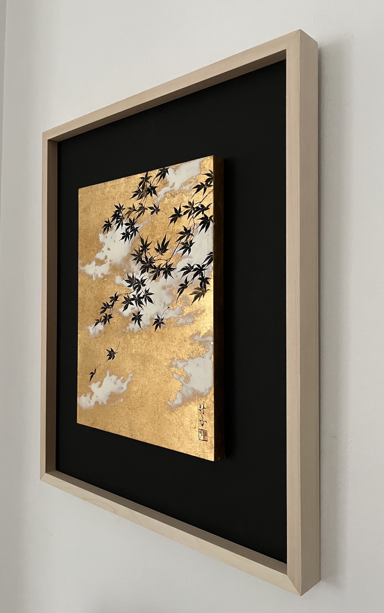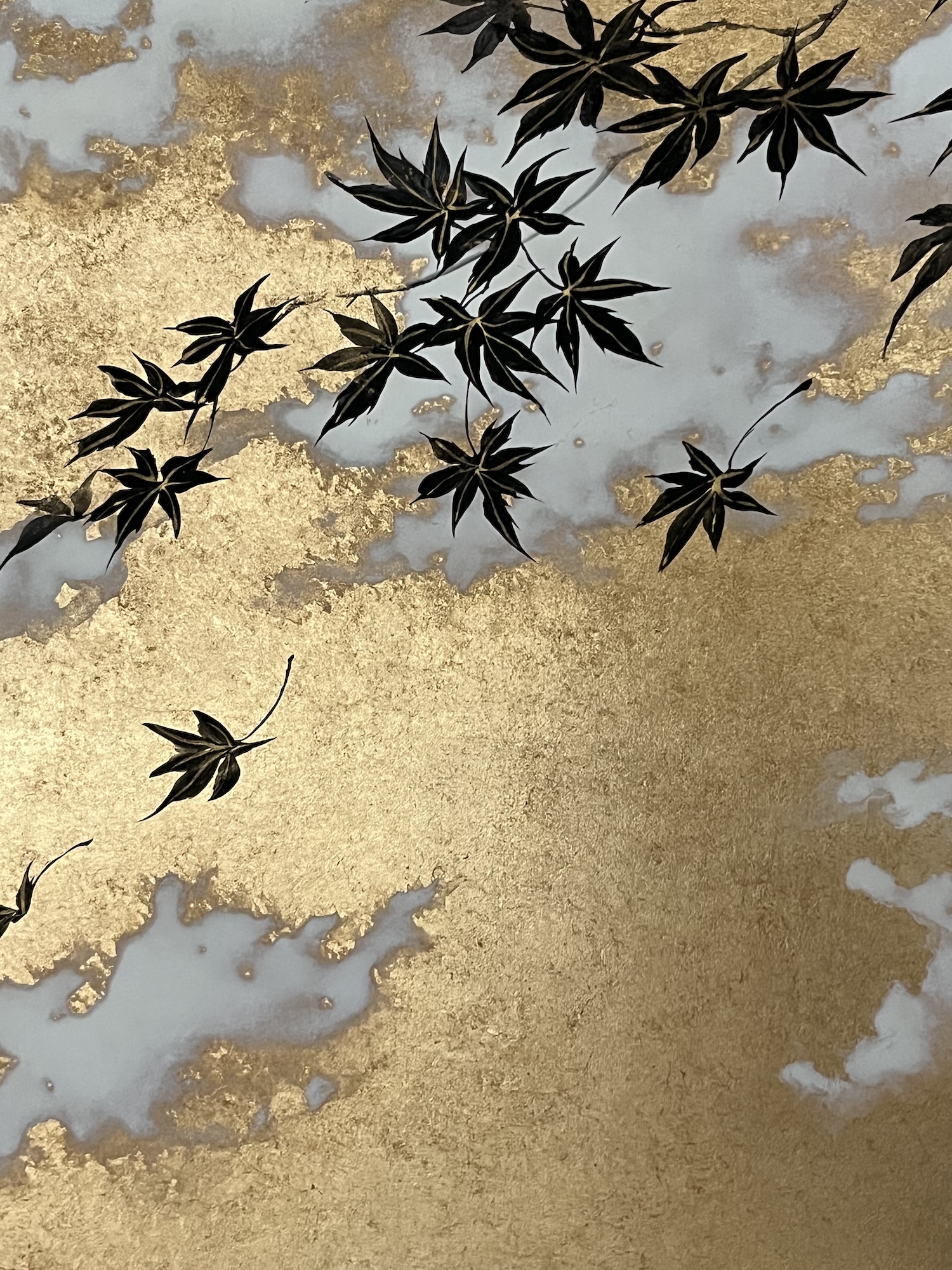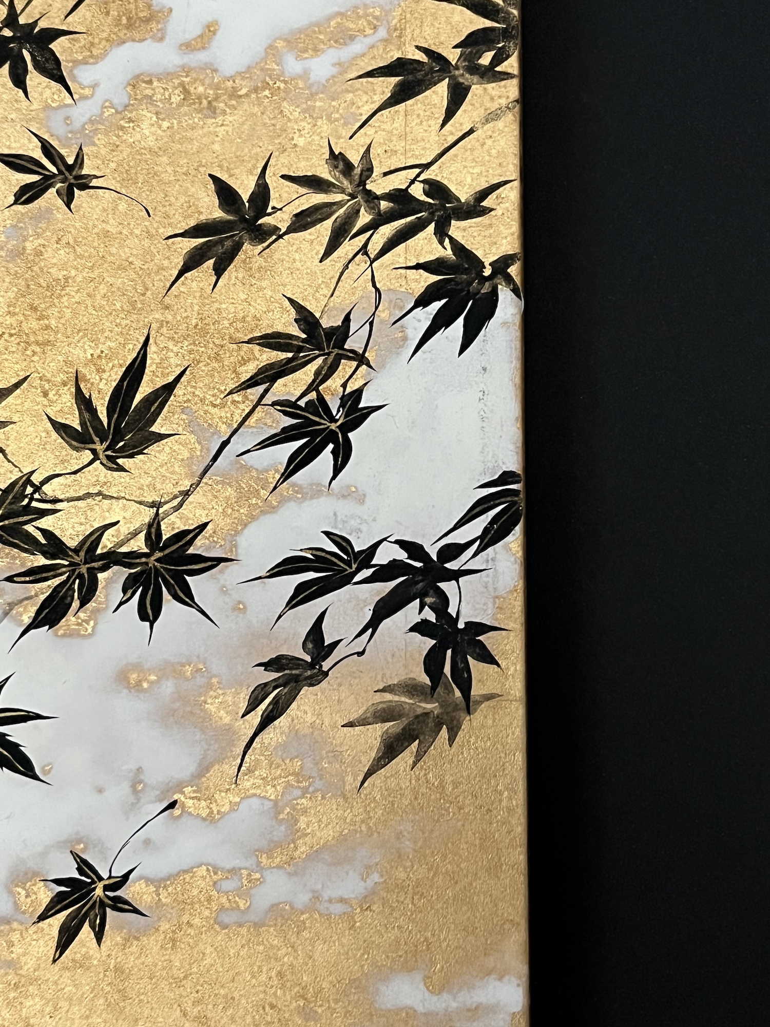 This work immerses the viewer in a brilliant and opulent space, dominated by the radiant sheen of a gold leaf background. The composition features elegant maple branches and leaves rendered in deep, contrasting Sumi ink, creating a striking dynamic against the golden field. Attention is drawn to the delicate, dark silhouettes of the maple leaves, which appear to be either descending gently or being carried by an unseen current. The artist uses pigments alongside the Sumi ink to give depth to the leaves and branches, while the expansive gold foil on Japanese paper provides a rich, textured surface that captures light.