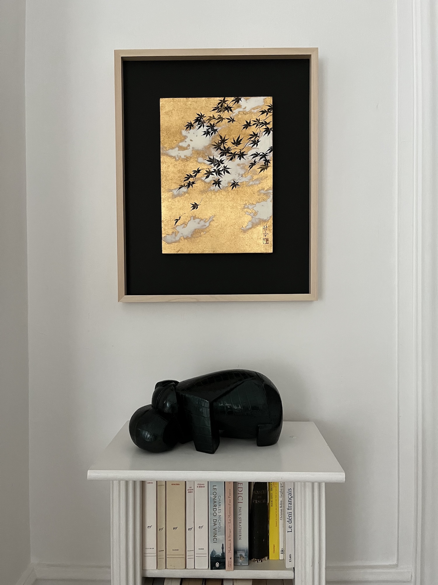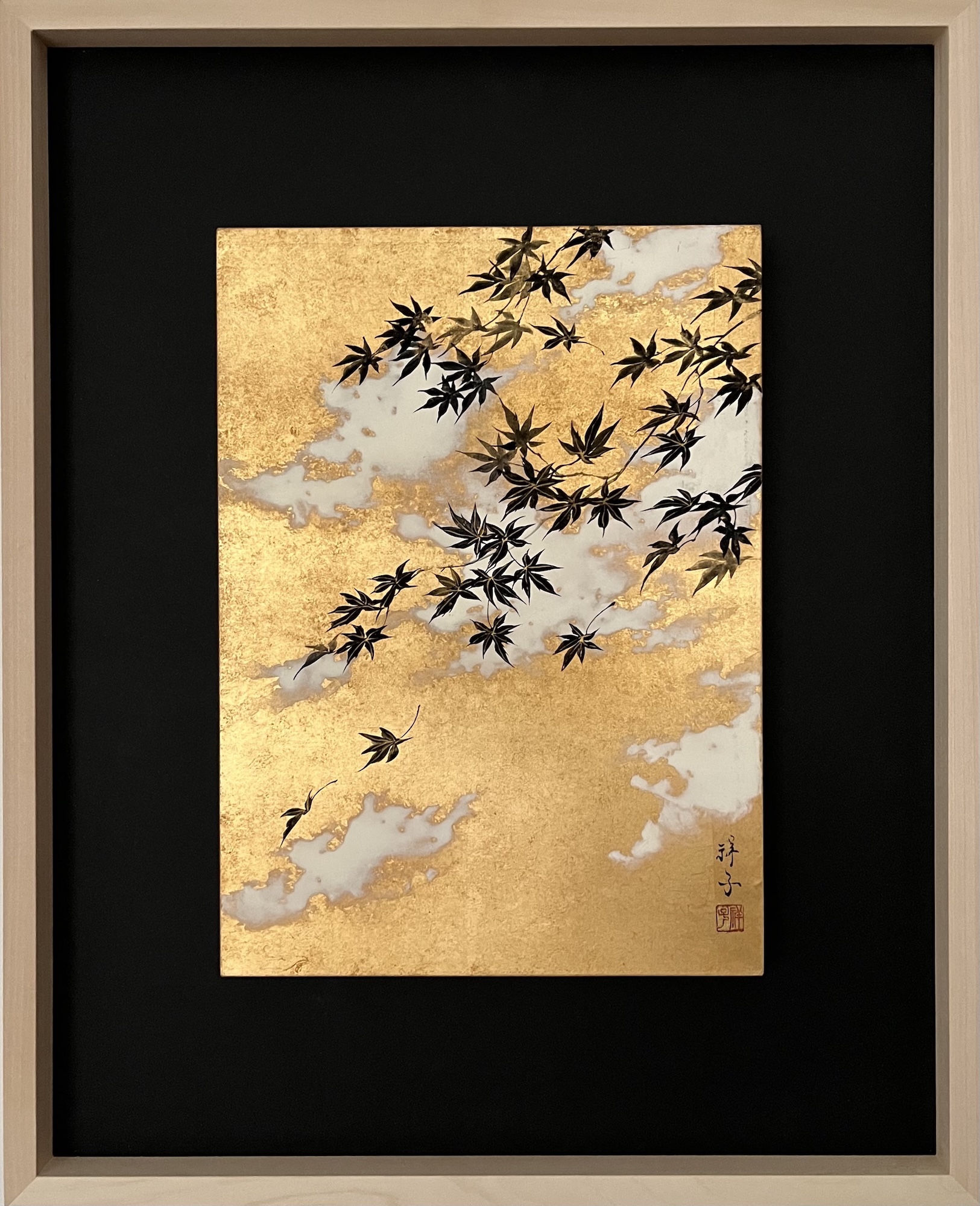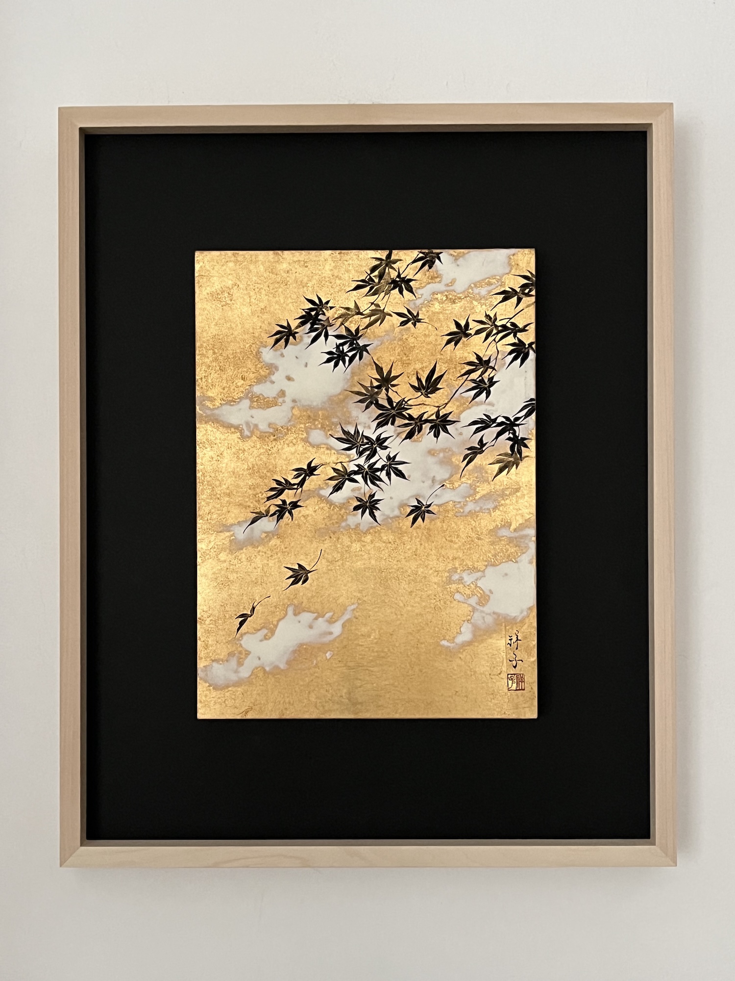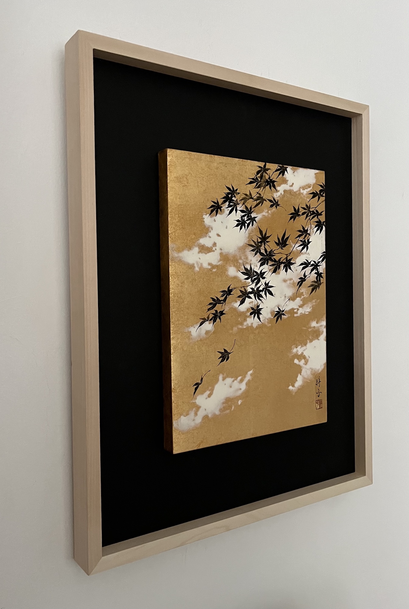 This work immerses the viewer in a brilliant and opulent space, dominated by the radiant sheen of a gold leaf background. The composition features elegant maple branches and leaves rendered in deep, contrasting Sumi ink, creating a striking dynamic against the golden field. Attention is drawn to the delicate, dark silhouettes of the maple leaves, which appear to be either descending gently or being carried by an unseen current. The artist uses pigments alongside the Sumi ink to give depth to the leaves and branches, while the expansive gold foil on Japanese paper provides a rich, textured surface that captures light.