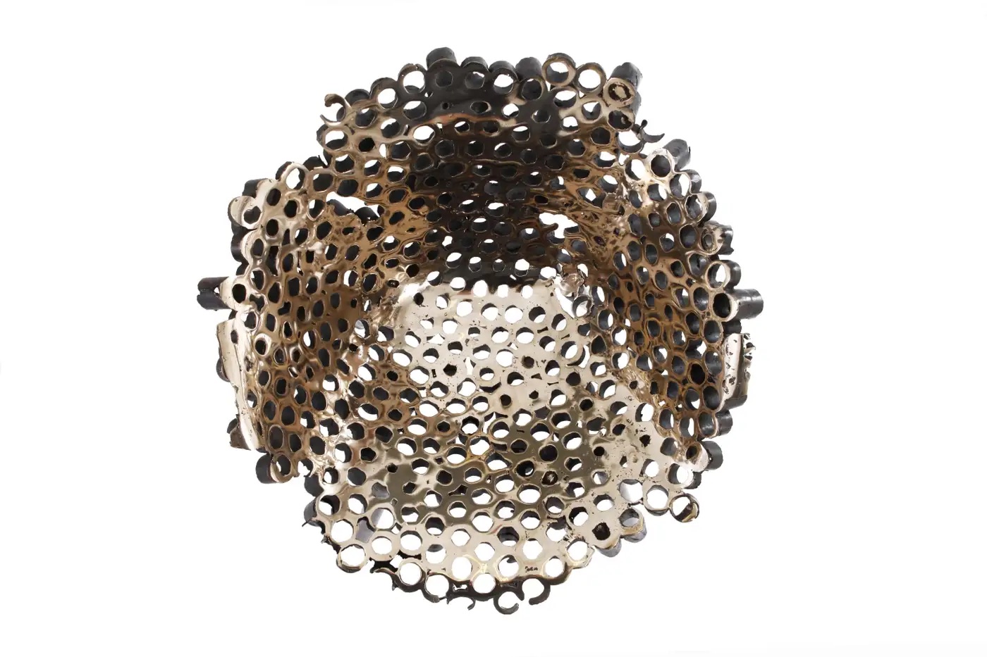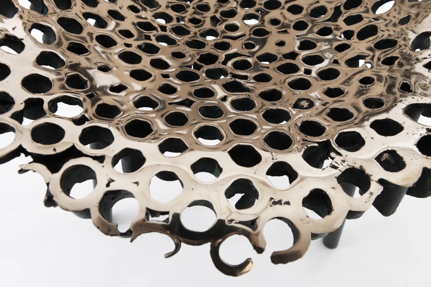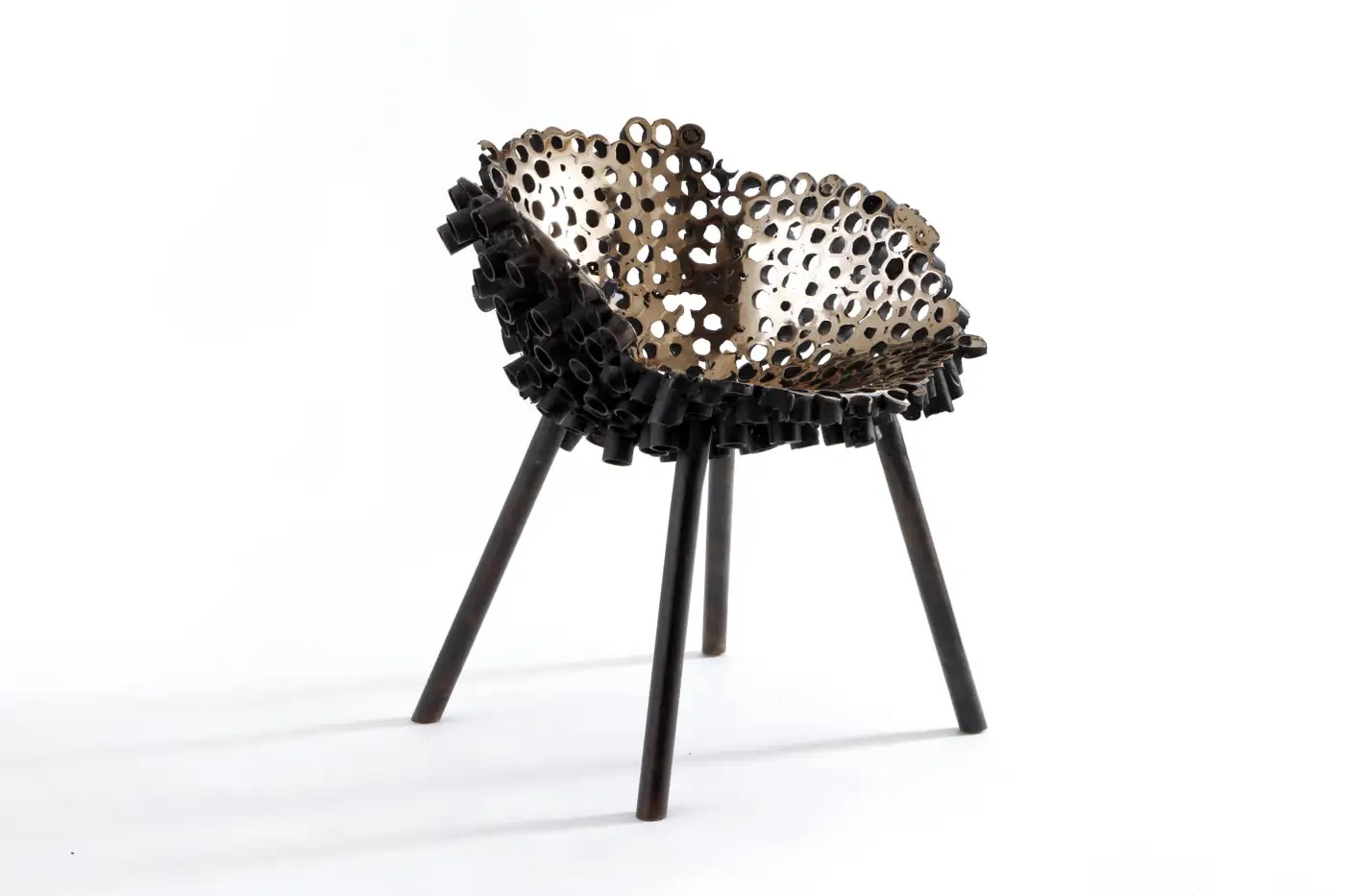 This chair is created using a ‘lost-plastic’ casting technique: a chair made from polypropylene tubes is encased in a thick ceramic shell and then melted out. The artist then pours molten bronze into the empty space that has formed and, once the metal has cooled and hardened, the ceramic shell is broken away. A work on the surface follows: the underside is left raw and patinated black while the seat is polished until it acquires a bright mirror finish. Every chair in the edition is unique because the ceramic mould must be broken to release the bronze, and therefore the entire process must be repeated for every new edition.