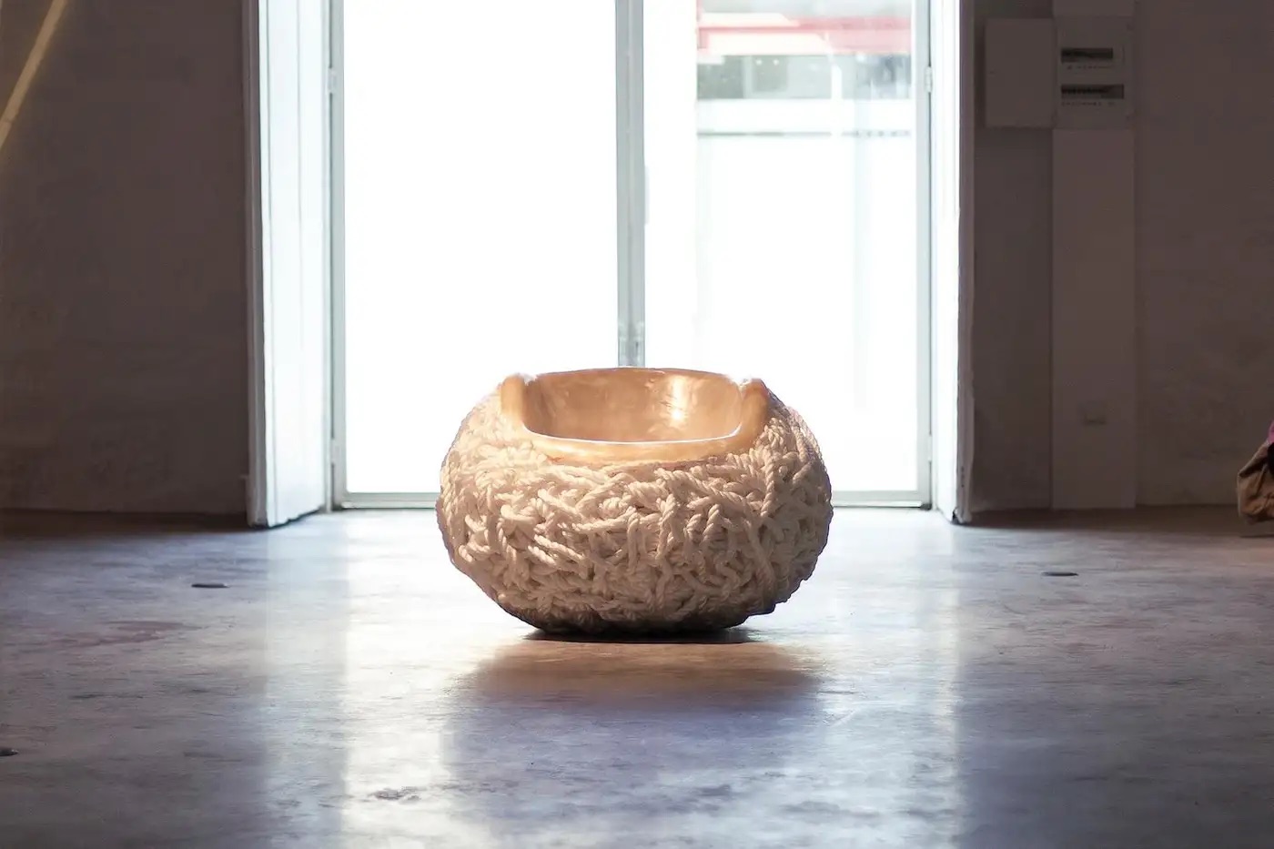 This chair is made entirely from polypropylene rope, no other material is added. The artist starts its creation by rolling up the rope around a ball – which is later removed, and then he presses a part of the rope ball on a heated metal seat-shaper former. The rope melts and, when it cools and subsequently hardens, the shape of the seat is created. Tom Price thus alters the structural and aesthetic qualities of the plastic material, giving rise to interesting contrasts in texture and form within the same object.