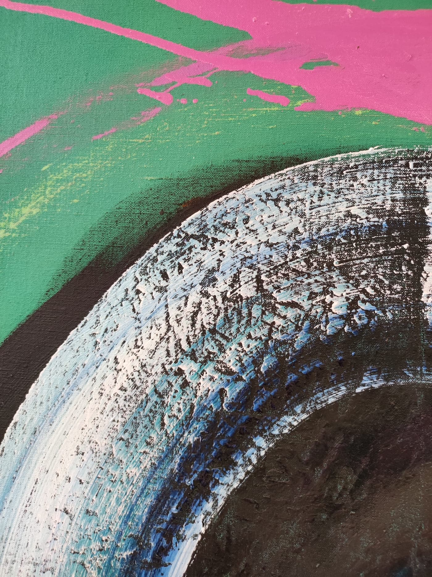 These ‘flowing’ colours (through the rapid brush stroke drawn over the canvas or paper) are placed over the flatter abstract ones of the background. Amongst the background colours, some suggest the world of bullfighting: the yellow of the arena sand, the pink, red or purple of the bullfighter’s cape…