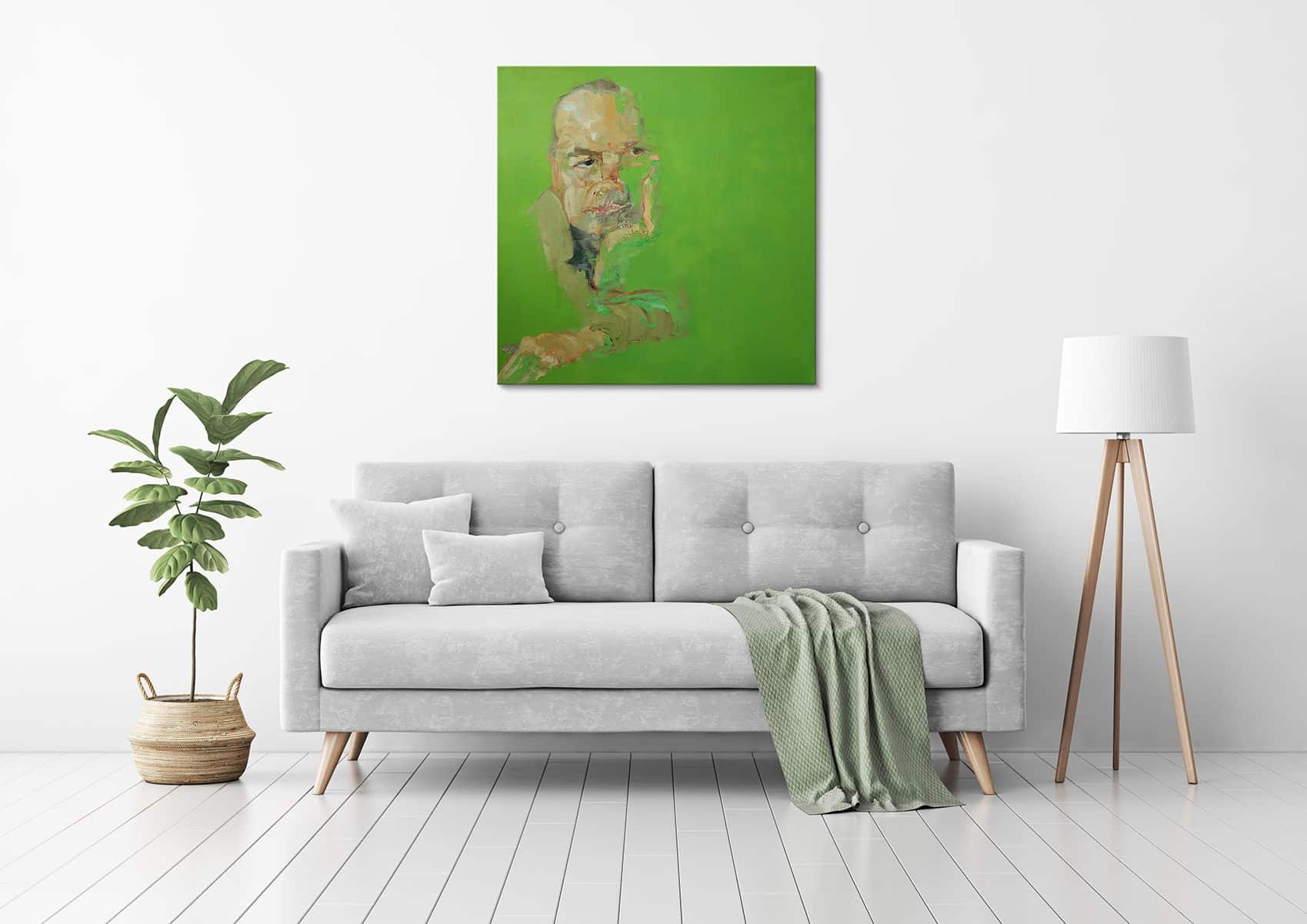 MODIANO is a portrait painting by French contemporary artist Christophe Dupety. This is a portrait of the French man of letters and Nobel Prize winner in literature, Patrick Modiano. The writer’s portrait stands out against a green background. It is not precisely painted, but in the manner of a brush sketch whose brush stokes can still be seen.