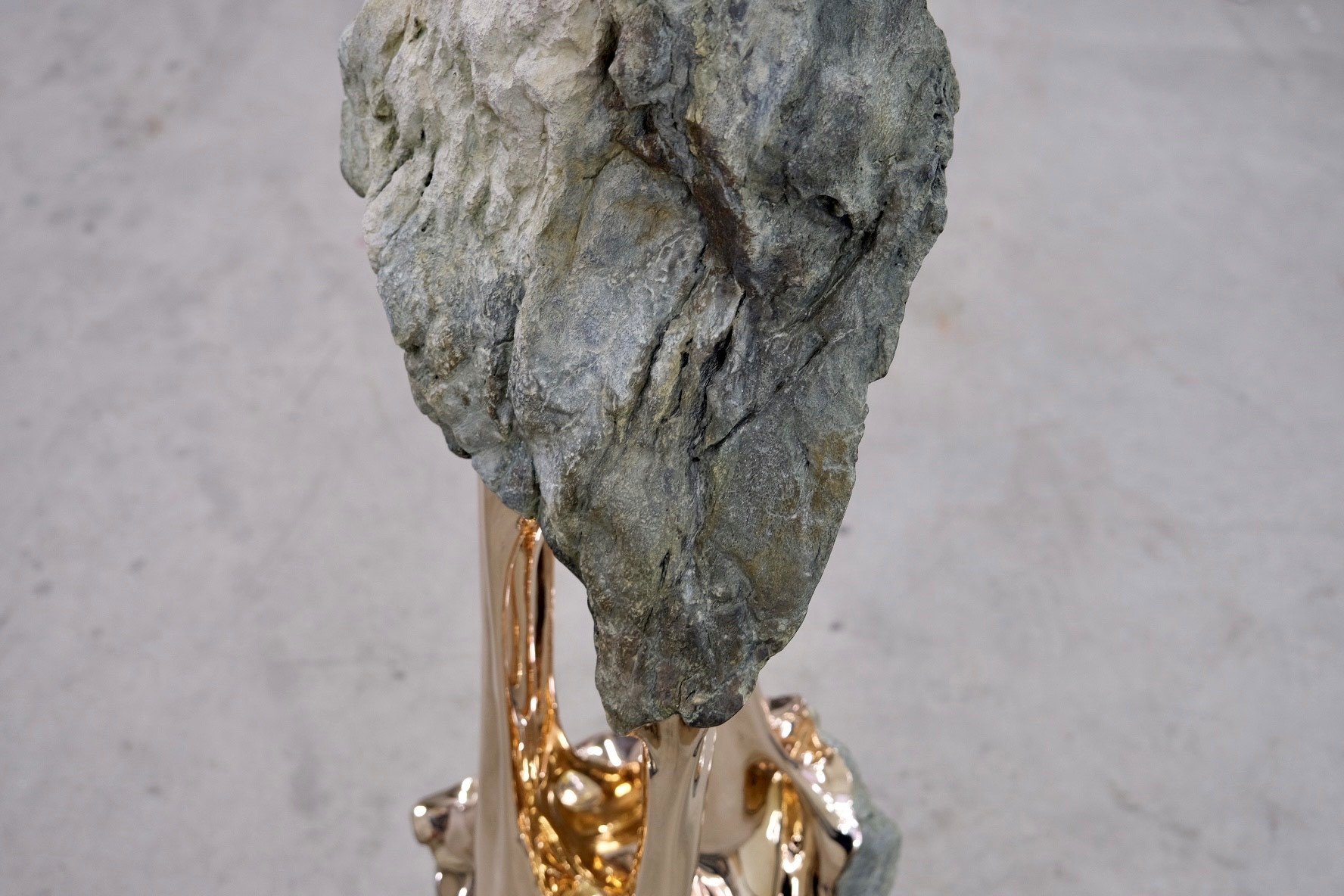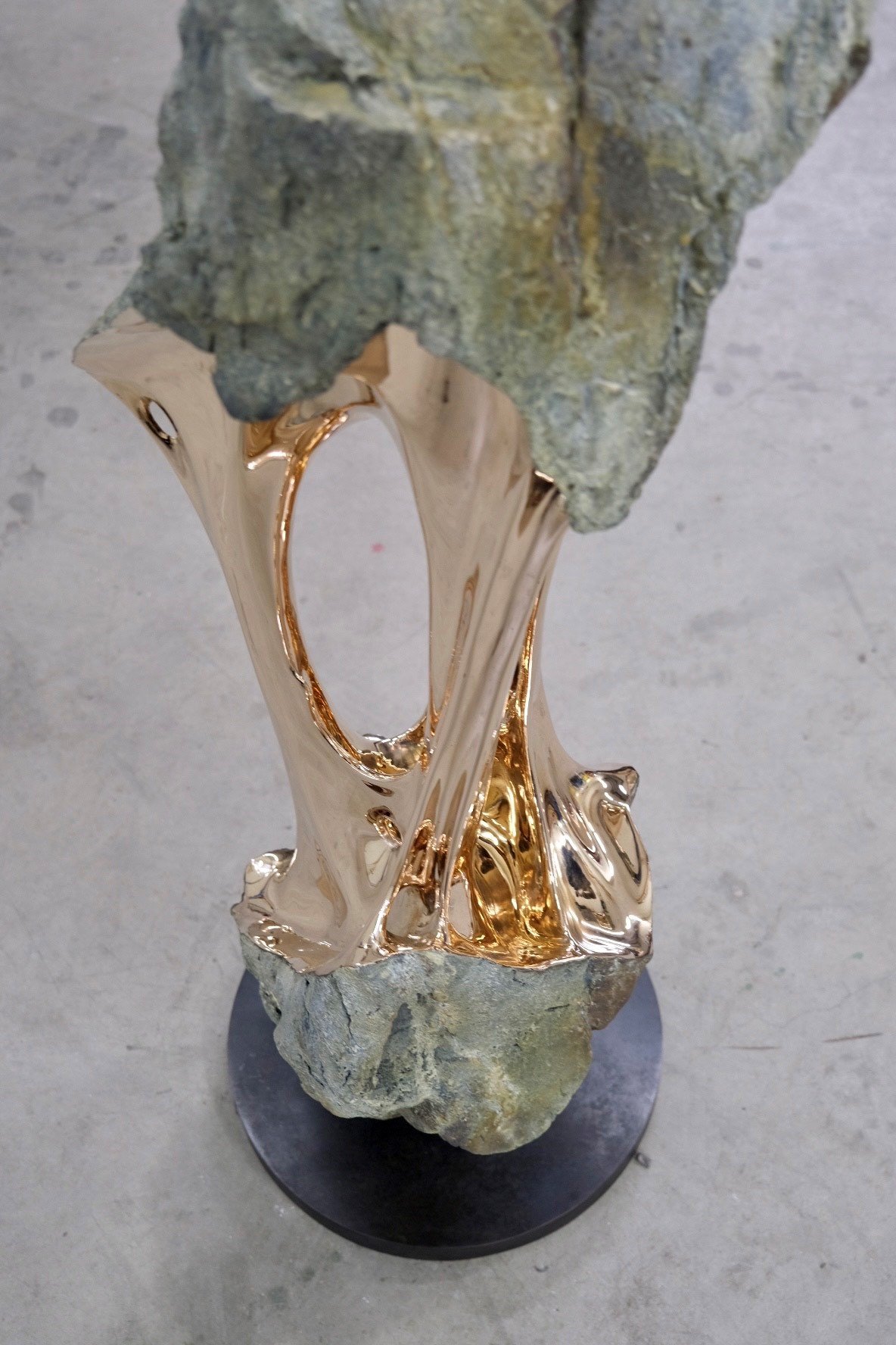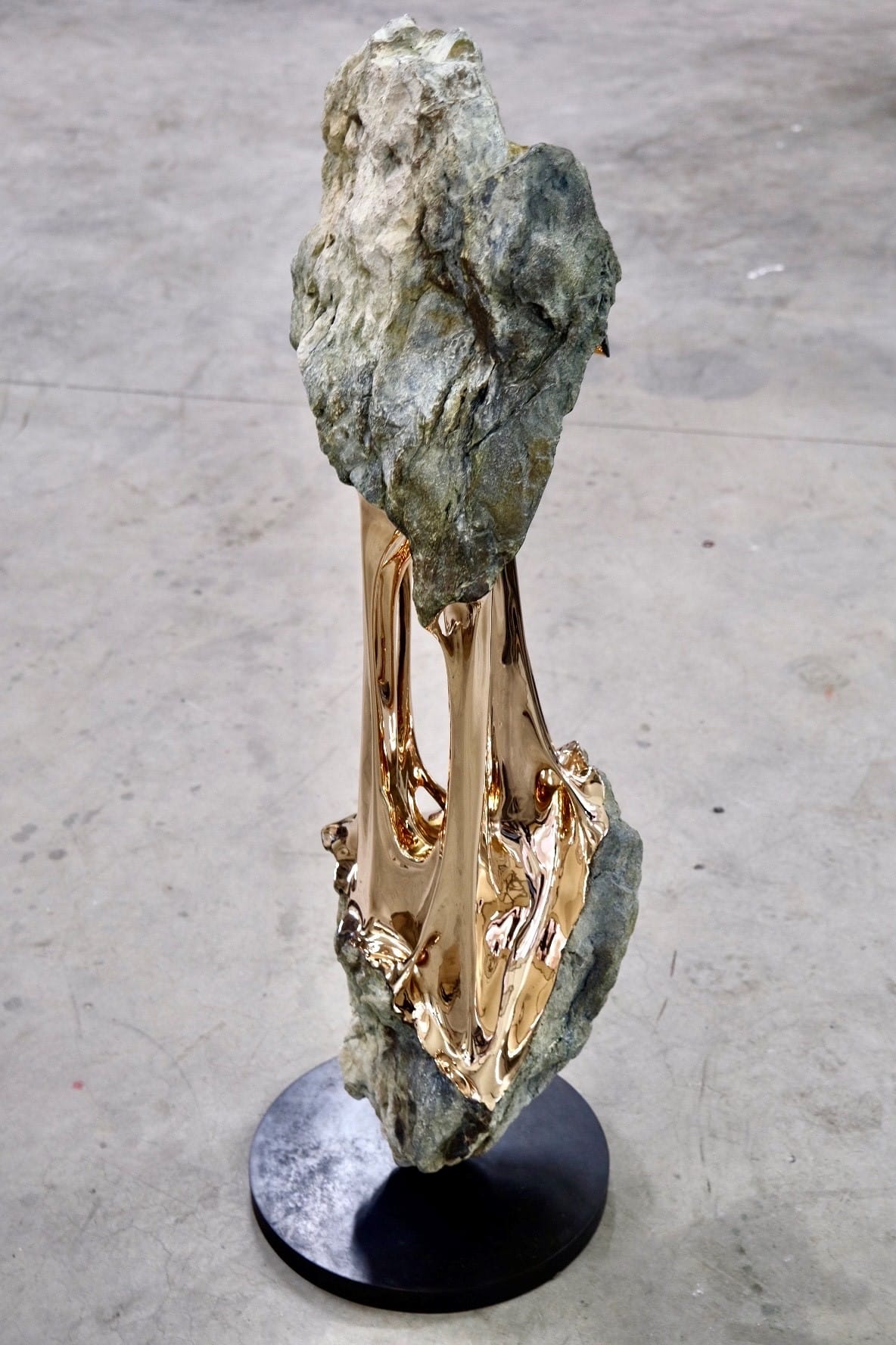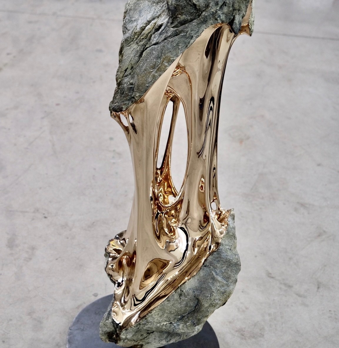 The Mountain and the River is a work by contemporary French artist Romain Langlois. The textures are obtained in the casting process and the colours through different patinas. The interior is polished so as to give the bronze this golden hue and glints of light. The title chosen by the artist suggests a natural landscape: that of a golden river that flows from the rocky and rough surface of a mountain.
