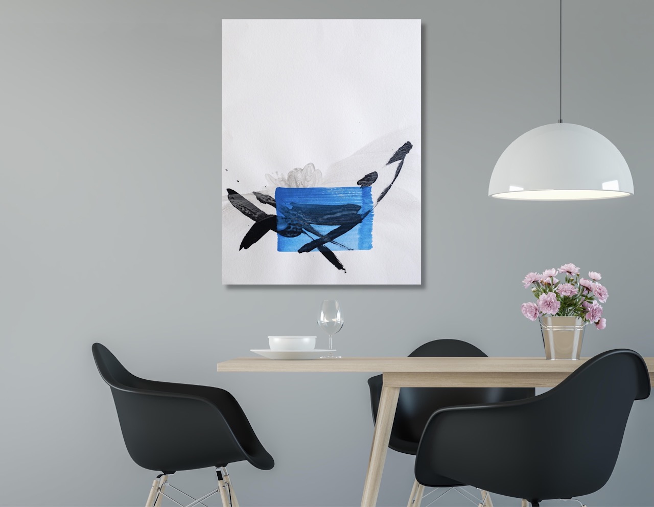 This artwork belongs to an abstract register and draws its influences from Japanese calligraphy. The brushstrokes, vigorous and yet elegant, are clearly visible and suggest the painter’s gestures. The black and white colors intersect on the paper, creating layers and transparencies. This painting, created with ink and acrylic, seems to spread a sort of energy and at the same time it invites to meditation.