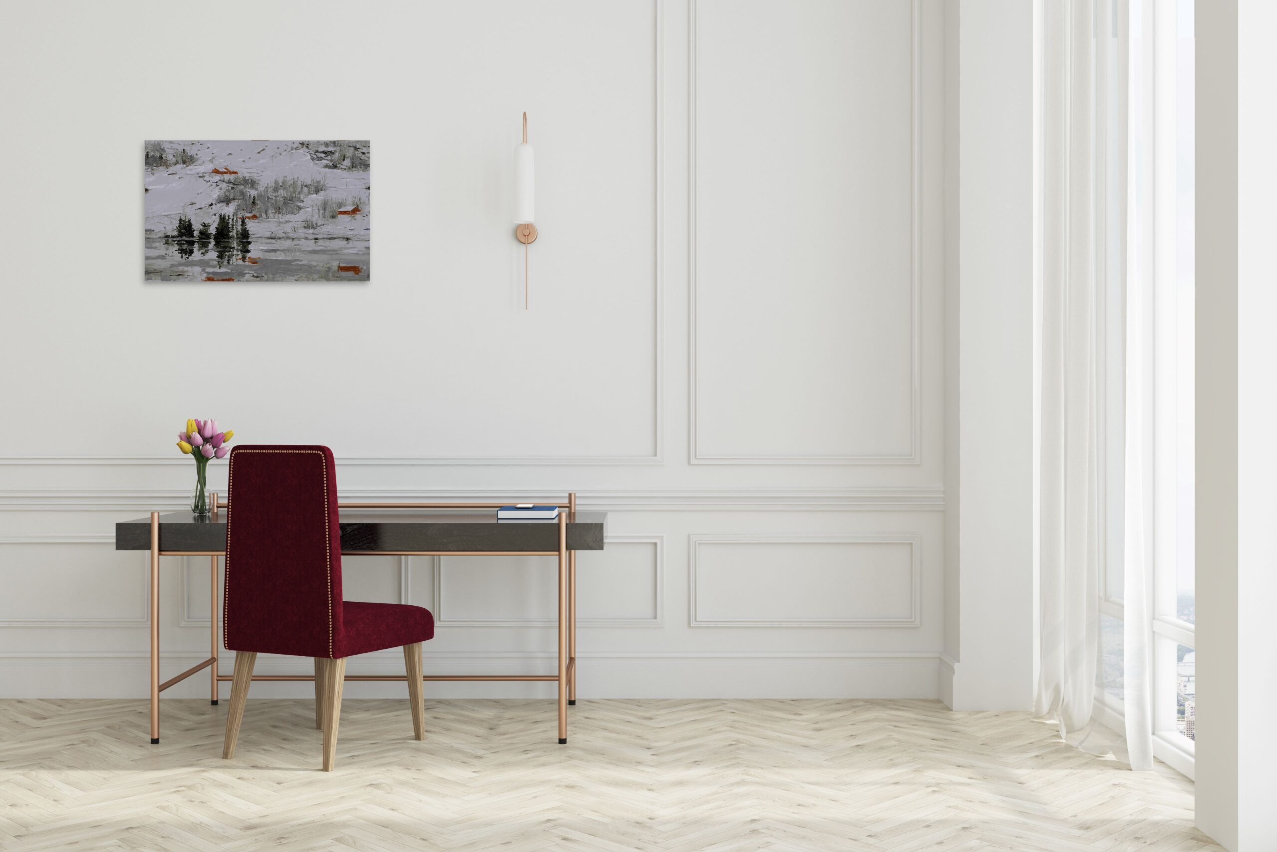 Narvik No. 2 taken from the “Norway” series is a painting by contemporary Spanish artist Calo Carratalá. This work portrays a snowy landscape typical for a nordic city like Narvik. A group of red houses are reflected in the waters of a lake or river. On the shore, a cluster of green pine trees rises. White is the dominant colour in this work.