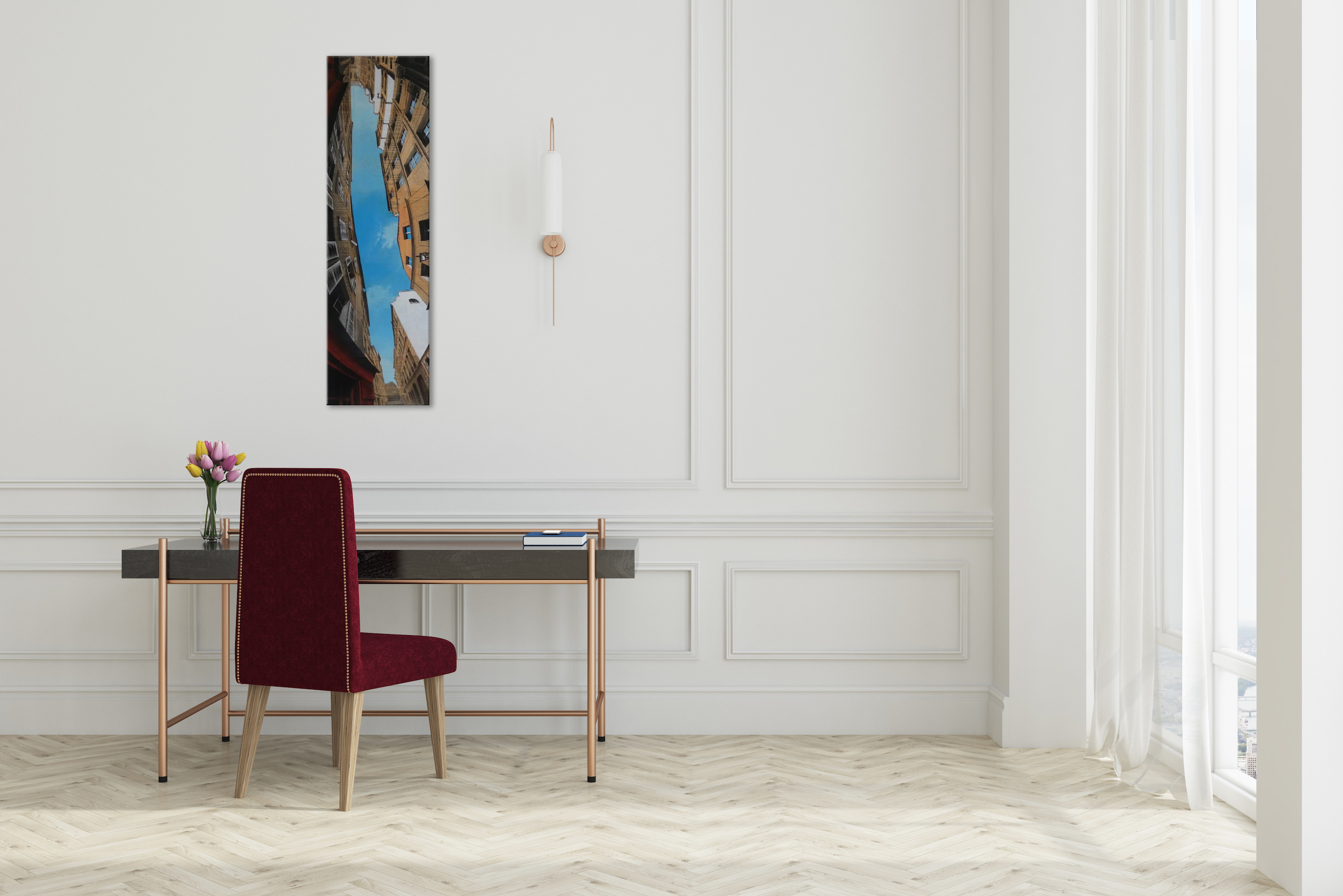After several years of painting the world’s megacities as faithfully as possible – the proportions, lights and perspectives – Guillaume Chansarel now has fun tearing up the rules with his new Reverso series first started in 2022. In these works, the viewer’s gaze is no longer lead by framing or construct; it wanders all over the canvas, bouncing around. The Reverso series plays with our senses: looking ahead and behind at the same time, raising our eyes to the sky even if the city seems to be at our feet, spinning, flying, twirling, even losing our balance. When tearing up the rules, you may as well go all the way: the paintings’ compositions have been done by the artist so that they can be viewed from every direction. Never upside down or the right way up, it is therefore up to individuals to put their own view onto these paintings.