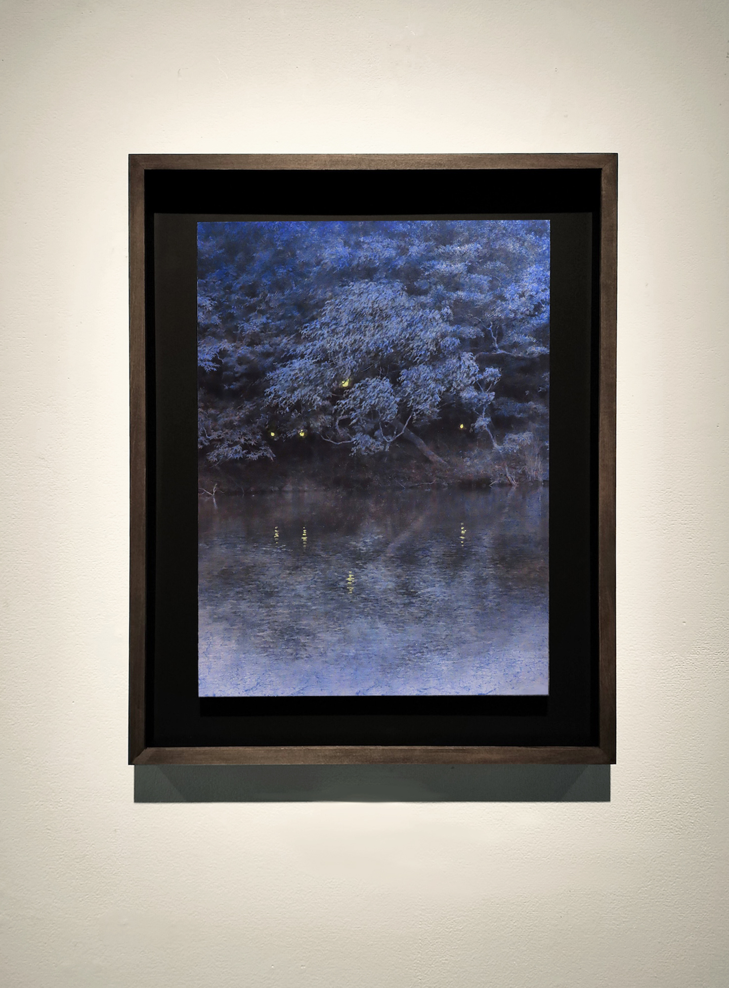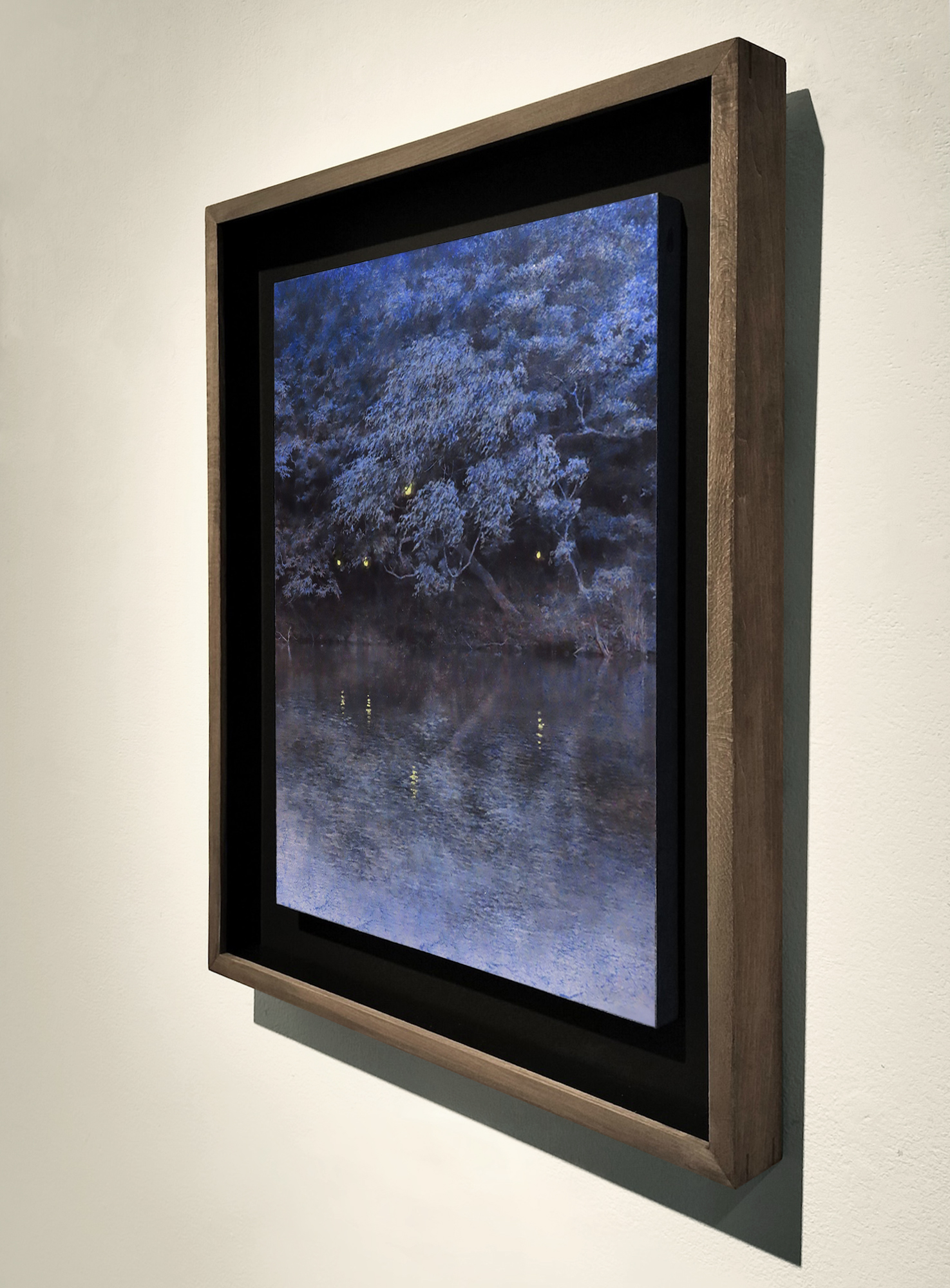 Nigthfall #44 is a painting by Japanese artist Shoko Okumura from the series Nightfall. The painting depicts trees and the quiet depth of the woods, where a soft glow emerges in contrast to the surrounding darkness.