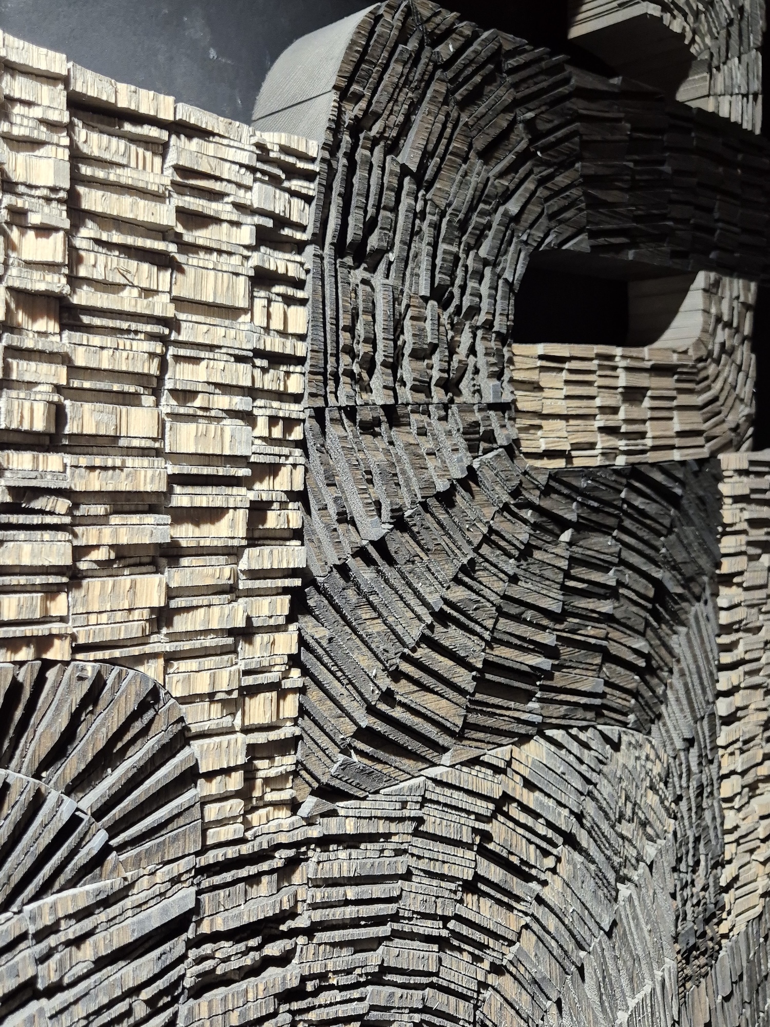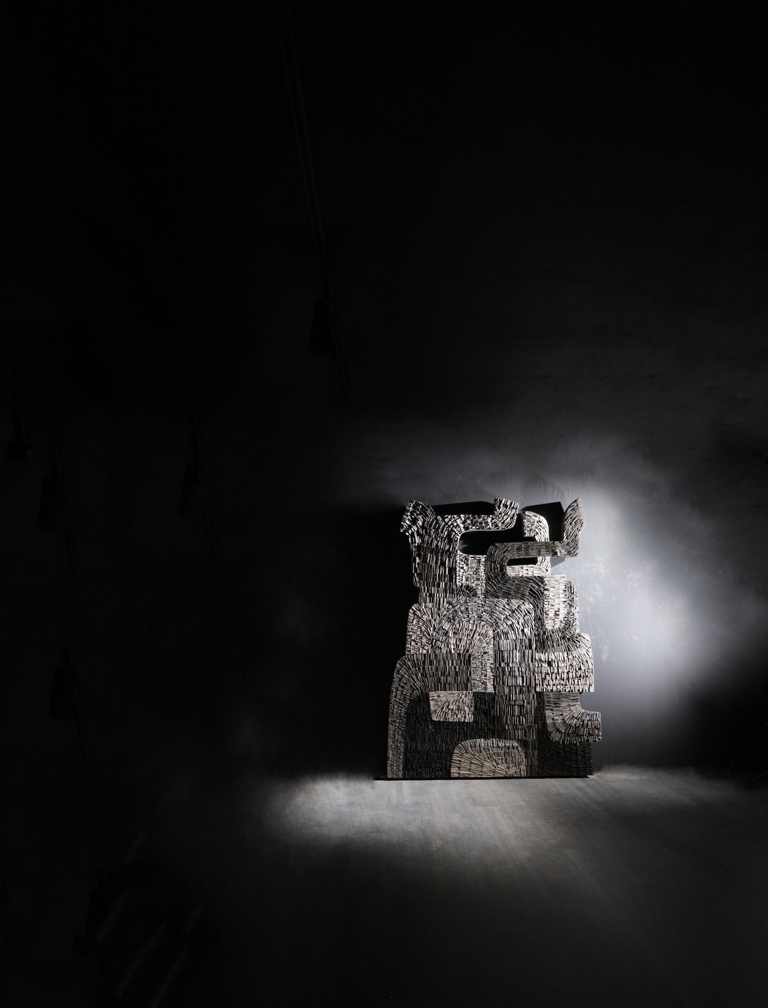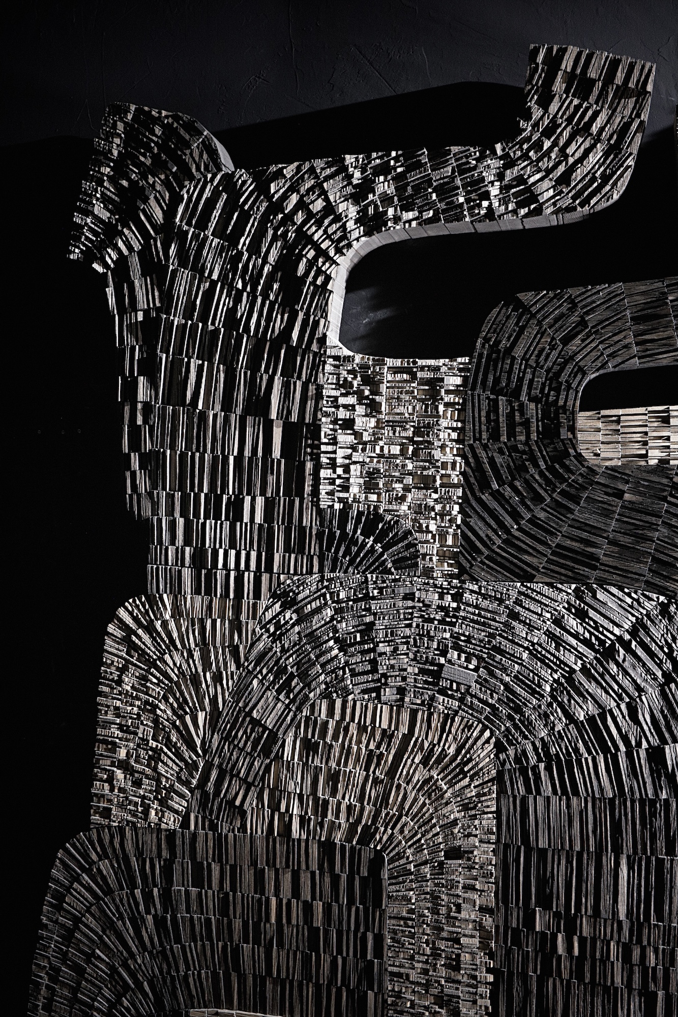 No.061222 is an abstract sculpture in wood by French sculptor Thierry Martenon. This large sculpture interweaves highly textured geometric forms to create a sense of rhythm and tension. The India ink is more or less diluted to differentiate the forms and enhance the contrasts.