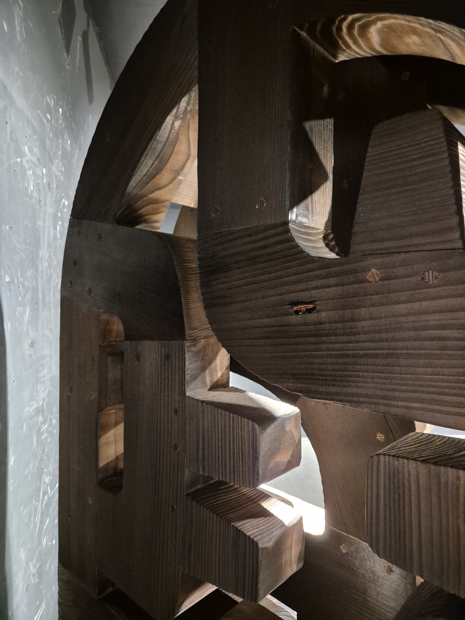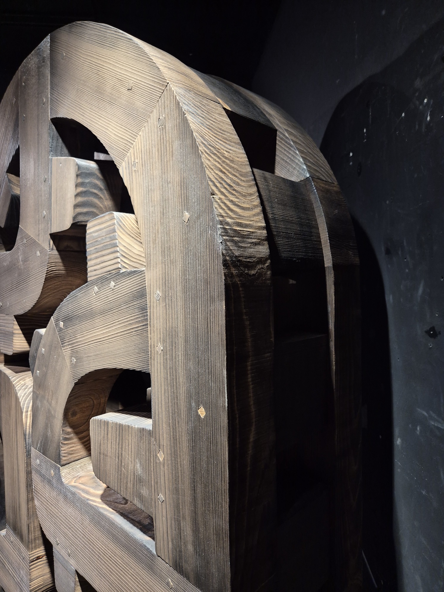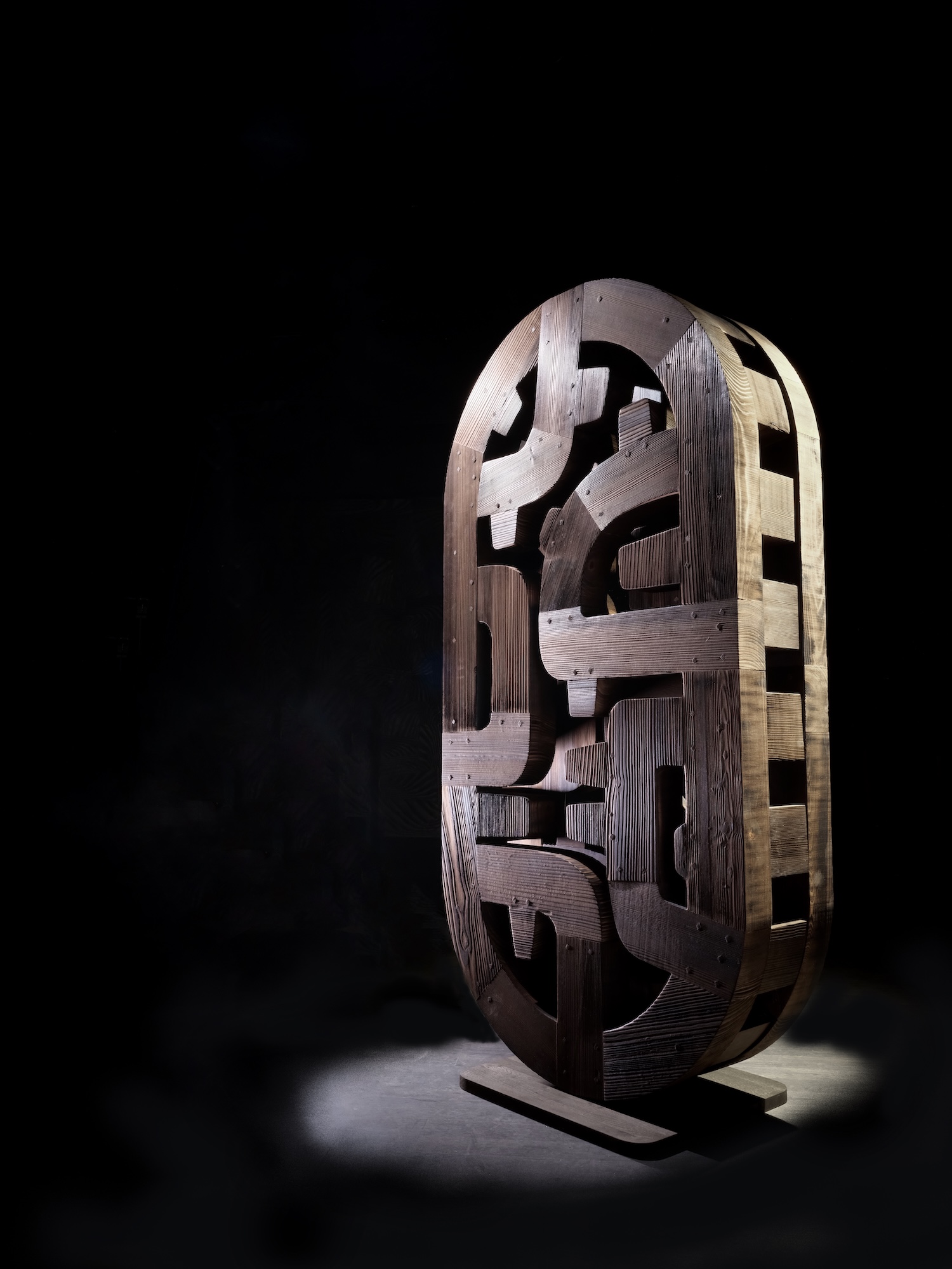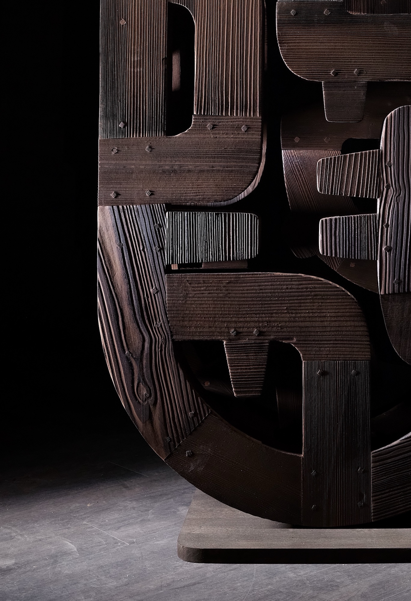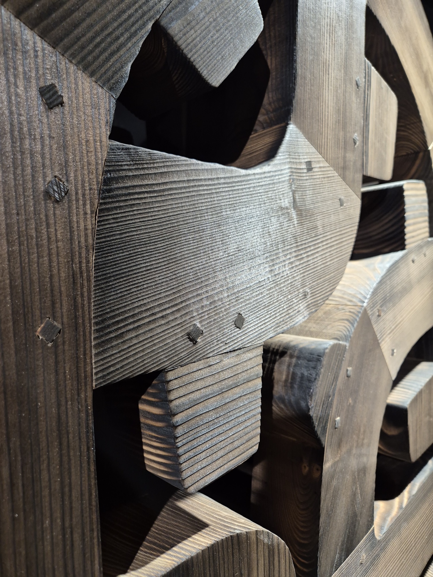 In this work, the artist burnt the surface of the wood with a blowtorch, purely for aesthetic reasons. He particularly appreciates this technique because it reveals an intense, silky black colour: “Burning the wood produces very deep blacks and this always reveals the texture of the wood, the deep nature of the wood“.