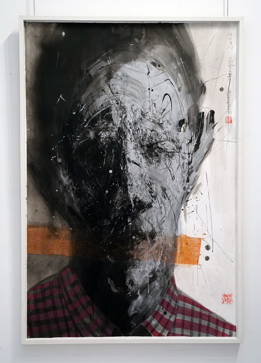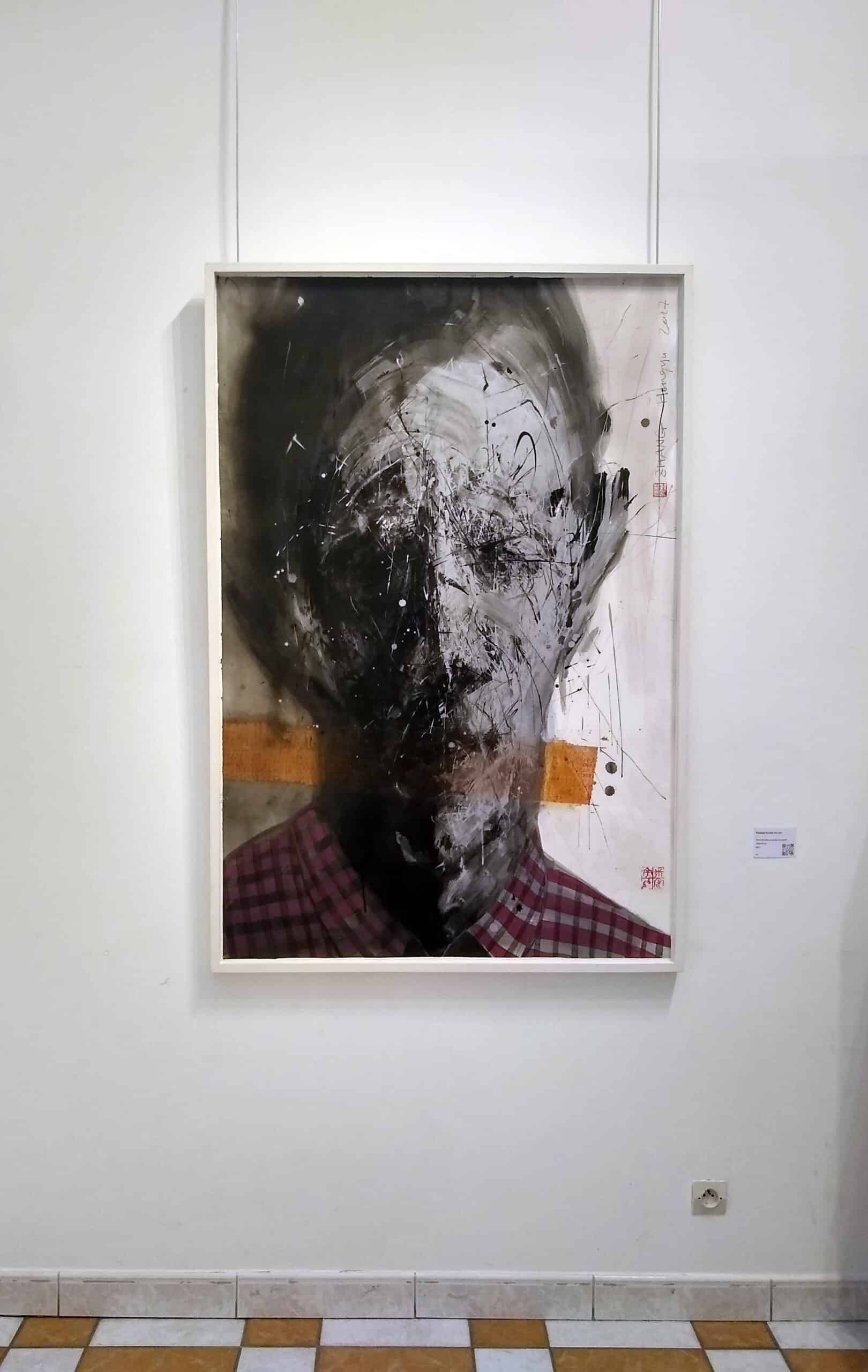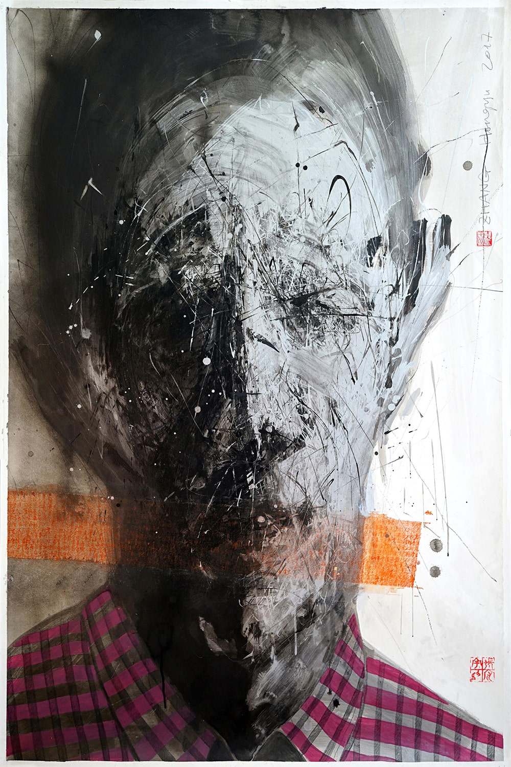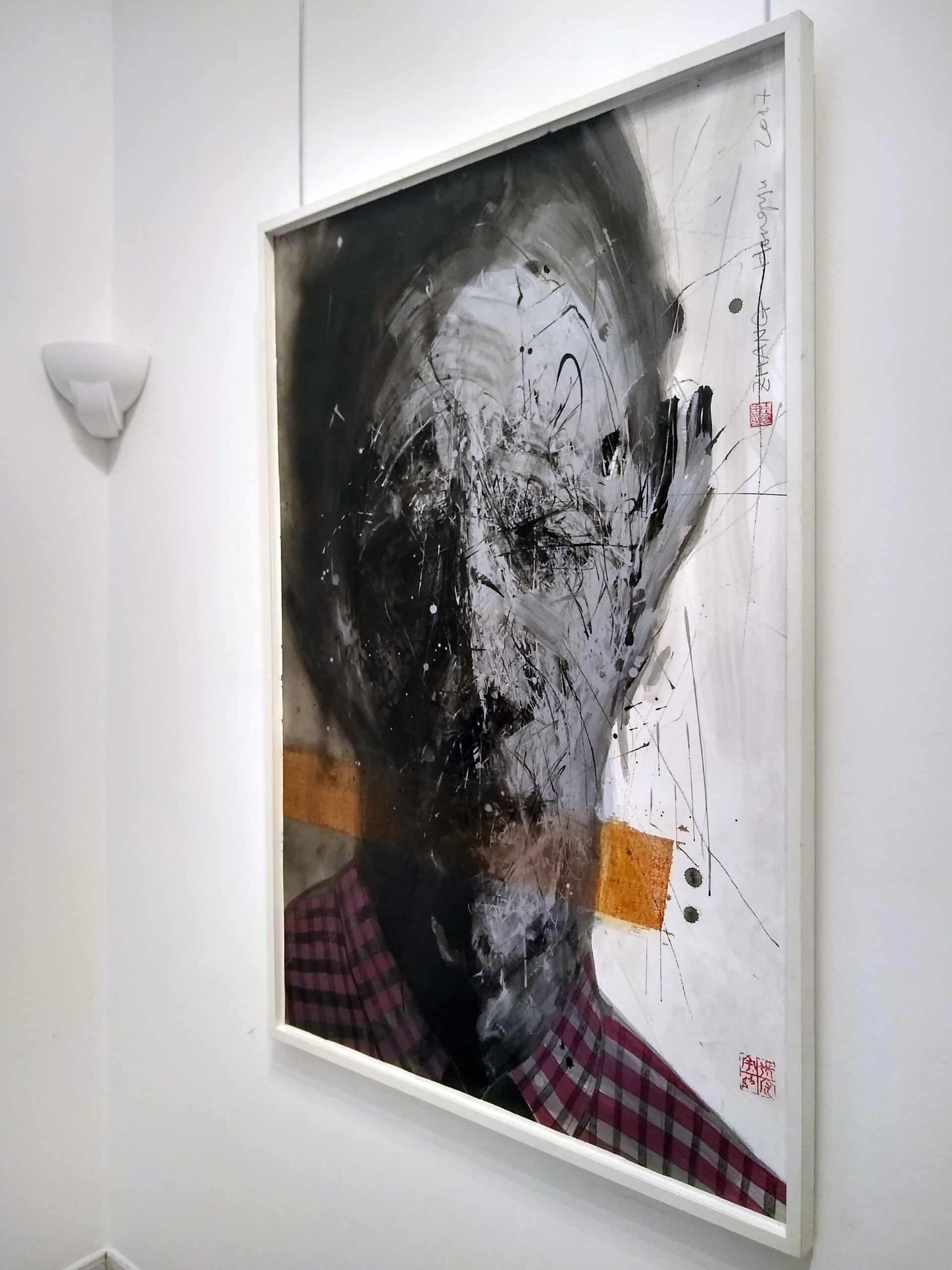 Hongyu Zhang’s painting has its roots in calligraphy and traditional Chinese painting and maintains a preference for Indian ink, which he uses today with different techniques to explore new creative styles. Dipping a thick brush into various ink dilutions for various shades of grey, he draws in the portrait’s outlines, colours the large areas and shapes the face playing with shadows and lights.