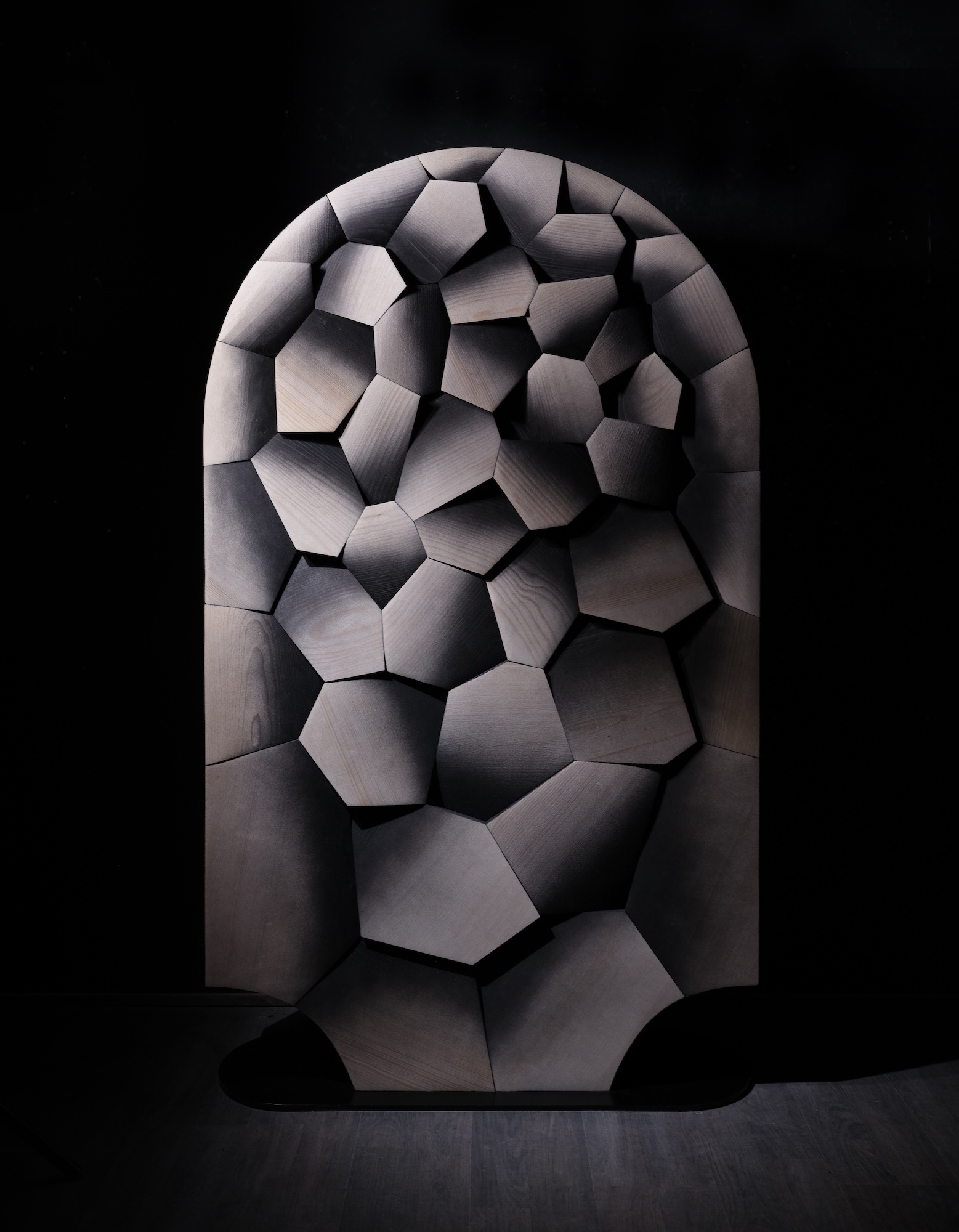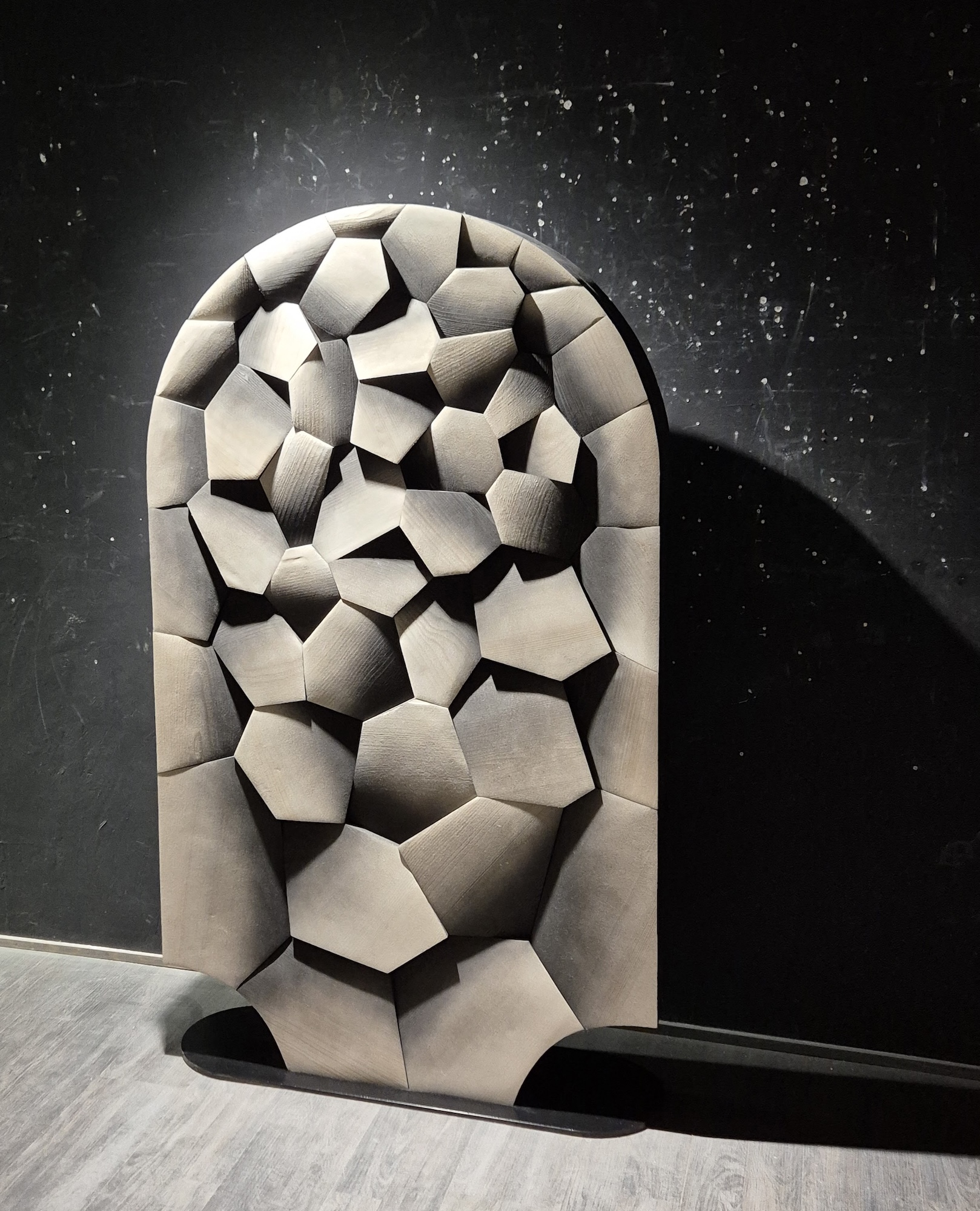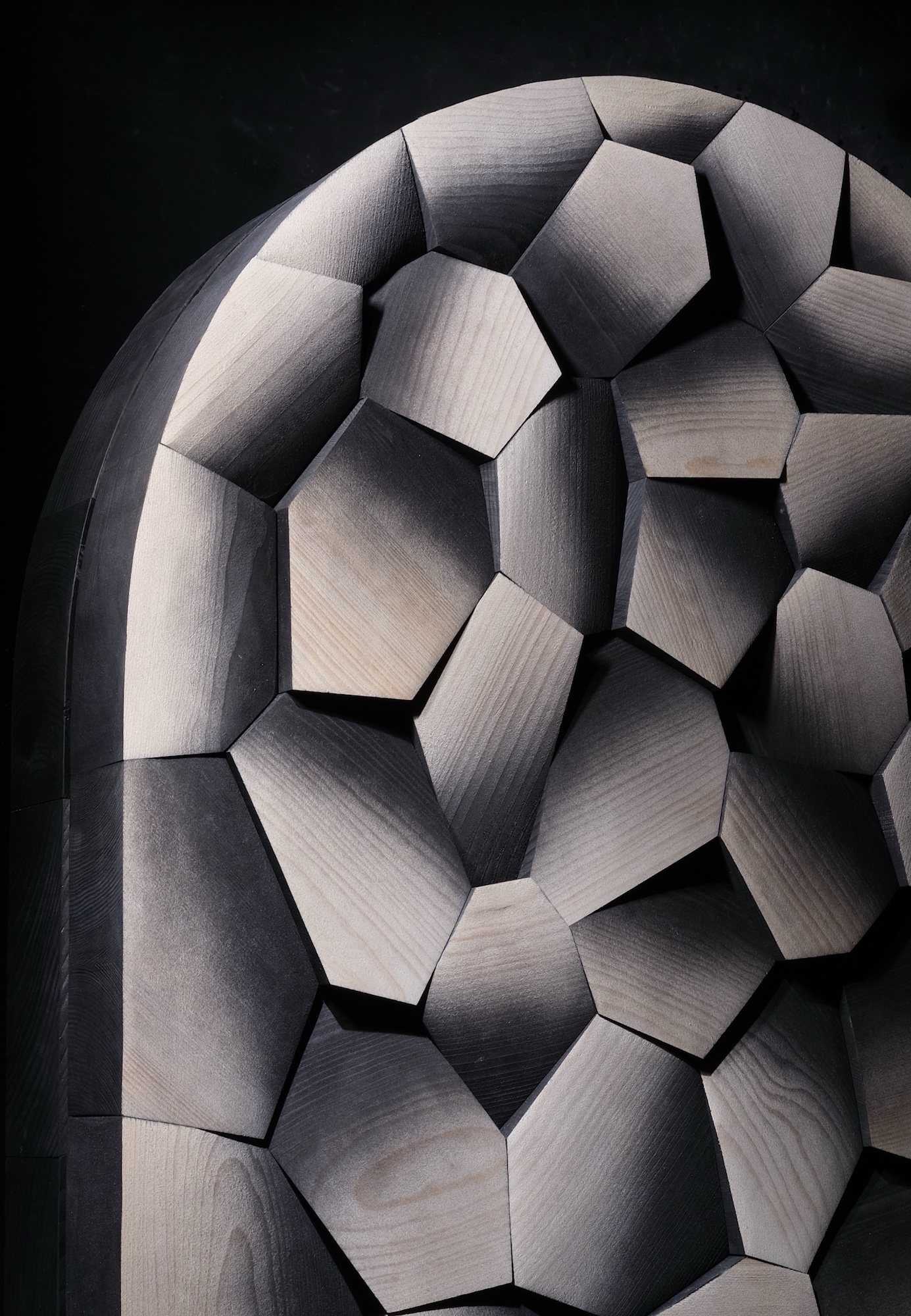 Once in the tranquillity of his workshop, Thierry Martenon carves his pieces using traditional woodworking tools, drawing on the expertise he has acquired through his cabinet-making experience. For the finishing touches, he explores a variety of unusual techniques such as brushing, burning, sandblasting and engraving, as well as applying Indian ink patinas and lacquers. The aim of this work is to create highly textured pieces capable of capturing the light, because, according to the artist: “It is the light that animates the piece of wood, it is the light that makes it vibrate“. A superb interplay of light and shadow enhances the wood, giving it a sense of movement.