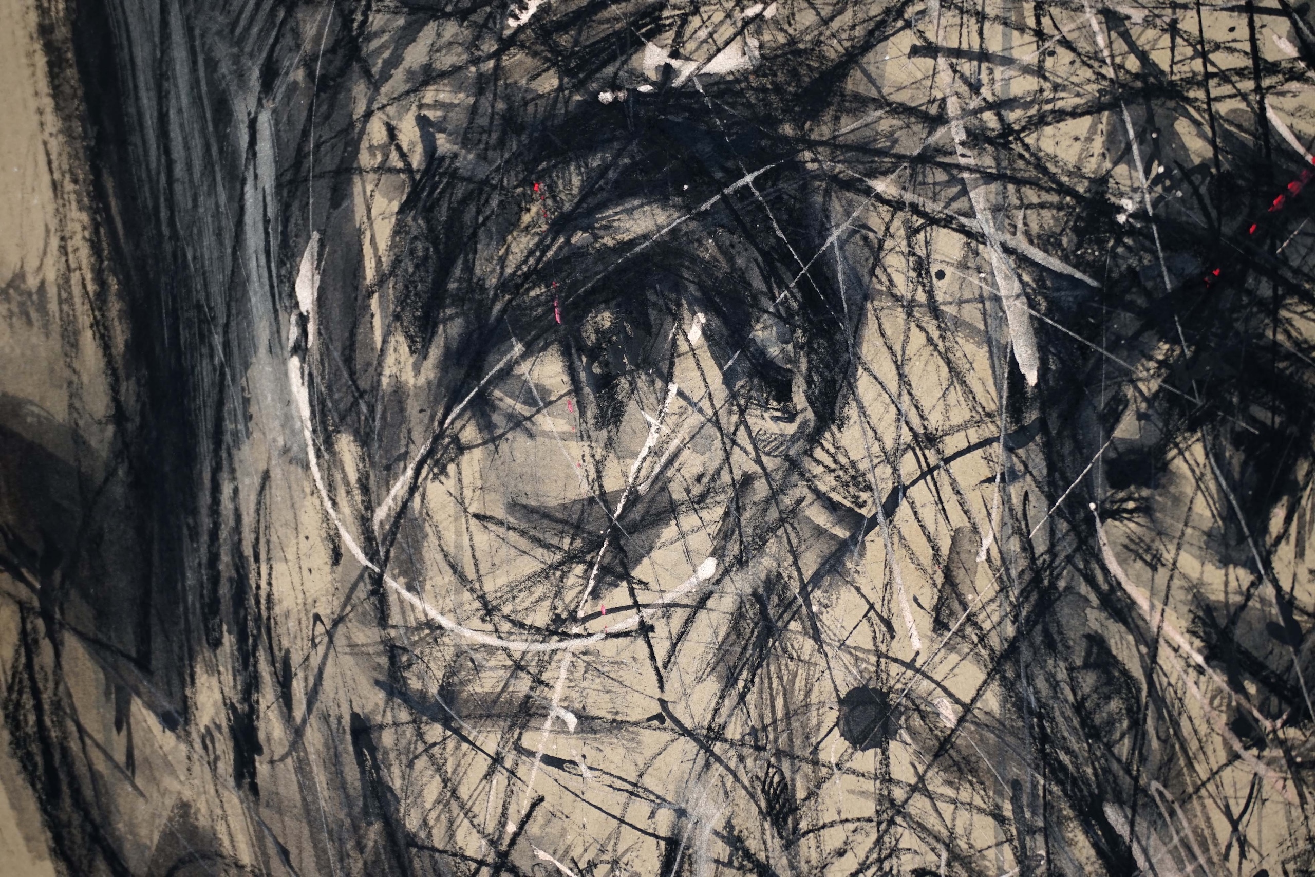 With a thick brush dipped in more or less diluted ink to obtain different tones of gray, the artist traces the contours of his portrait on the canvas, places the large masses and models the face by playing on the shadows and lights. The charcoal, applied in multiple nervous strokes, specifies the features of this face, just as a topographical map restores the relief of a landscape through the density of the lines.