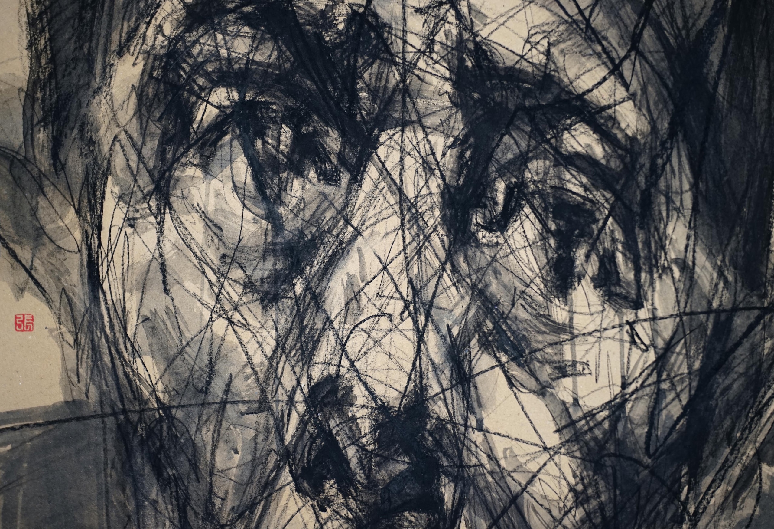 This portrait in Indian ink and charcoal on paper mounted on canvas demonstrates the influence of calligraphy and Chinese painting on this artist.