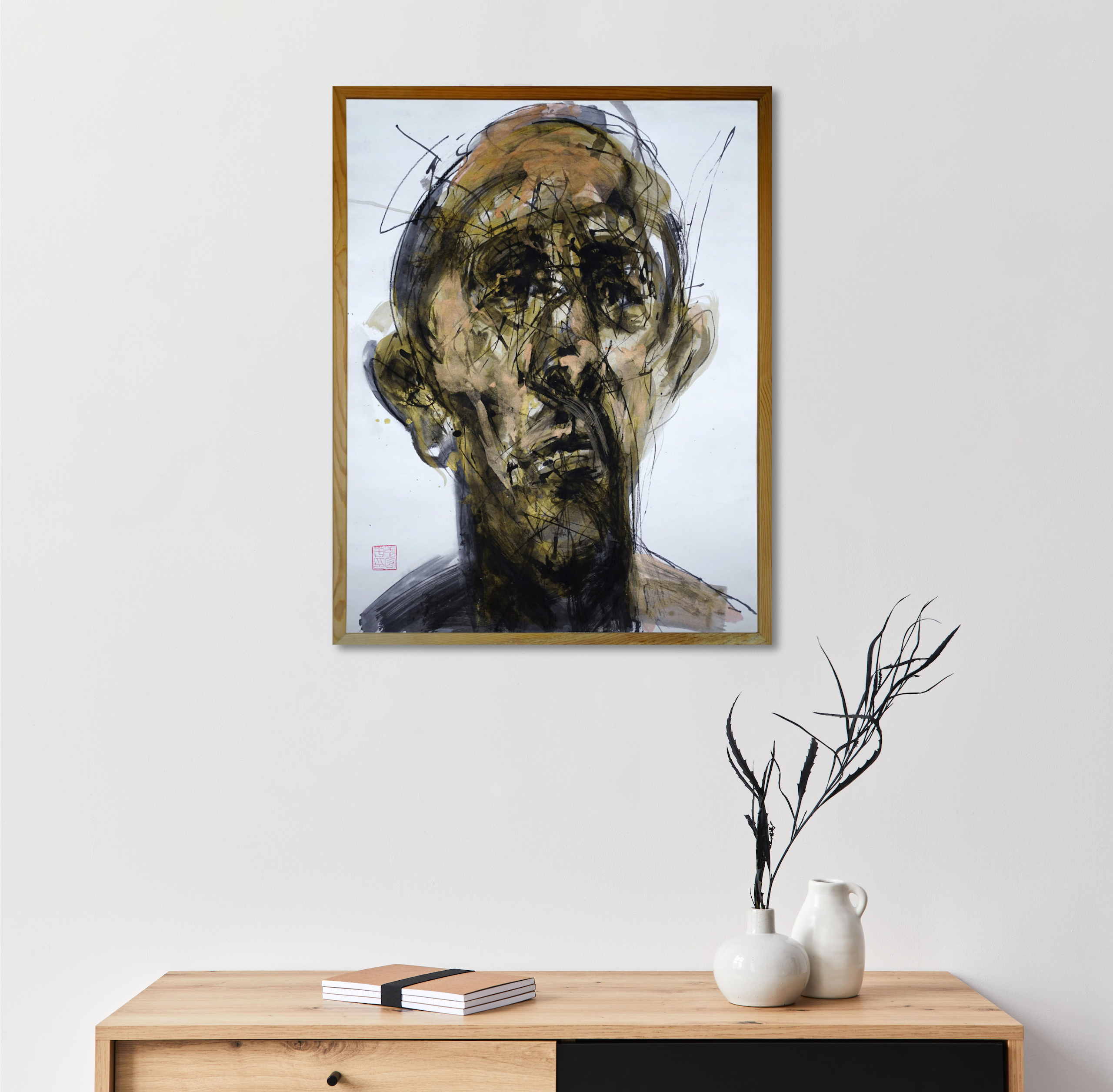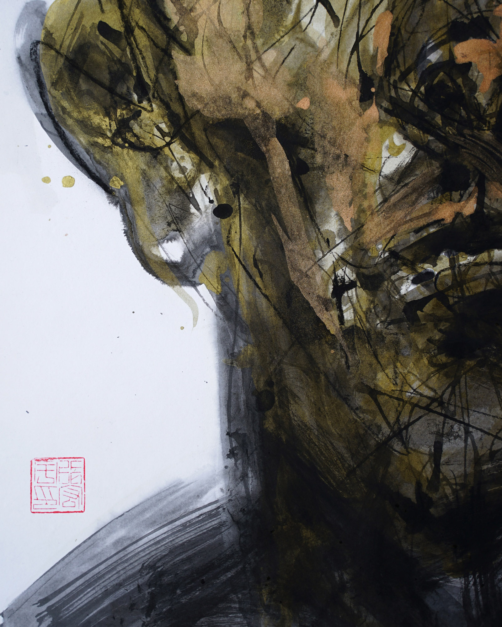 Hongyu Zhang’s painting has its roots in calligraphy and traditional Chinese painting and maintains a preference for Indian ink, which he uses today with different techniques to explore new creative styles. Dipping a thick brush into various ink dilutions for various shades of brown, he draws in the portrait’s outlines, colours the large areas and shapes the face playing with shadows and lights.