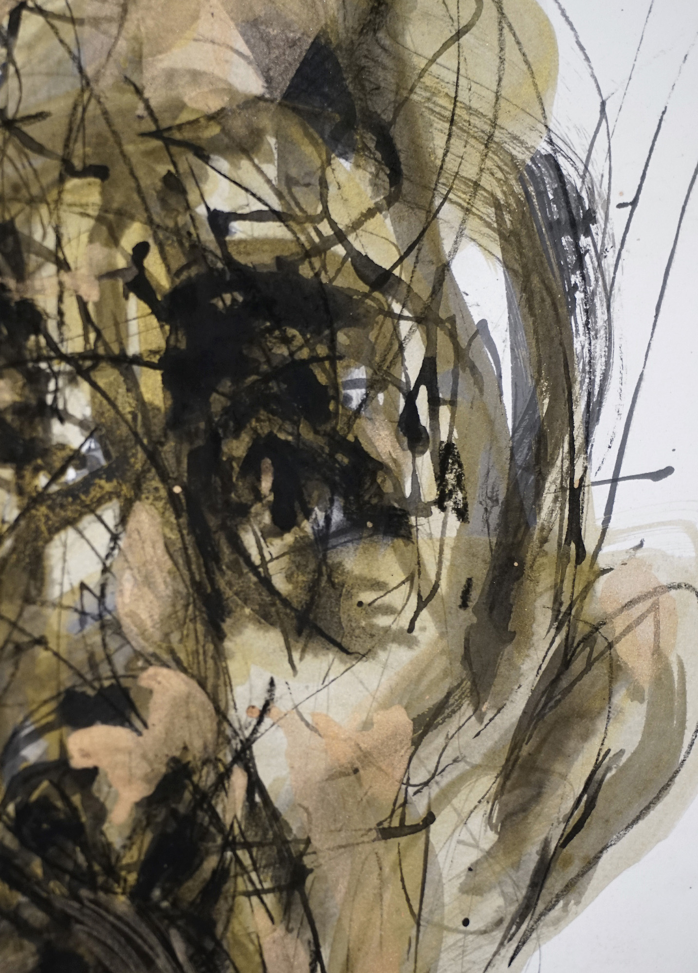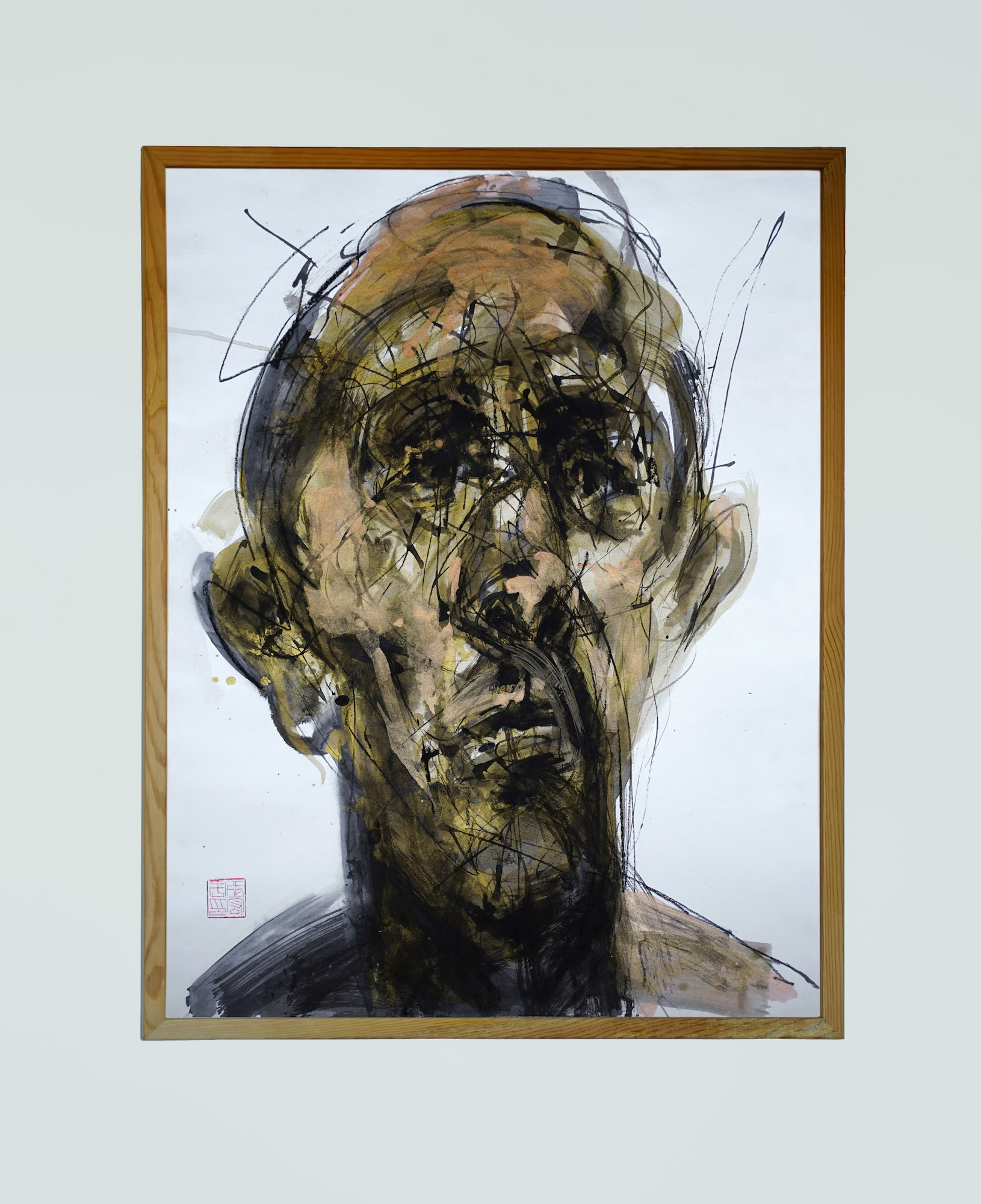 Lines constitute the fundamental unit of his portraits: “I work with lines” he says. “When I paint a portrait, I draw each line and each brushstroke using the principles of calligraphy. Each line has a life, and all together – with their strength, movement and rhythm, they make up an energetic space.” This energetic space magnetically draws and holds us, inviting us to decipher this nervous writing that seems to have been invented to describe the depths of the soul.