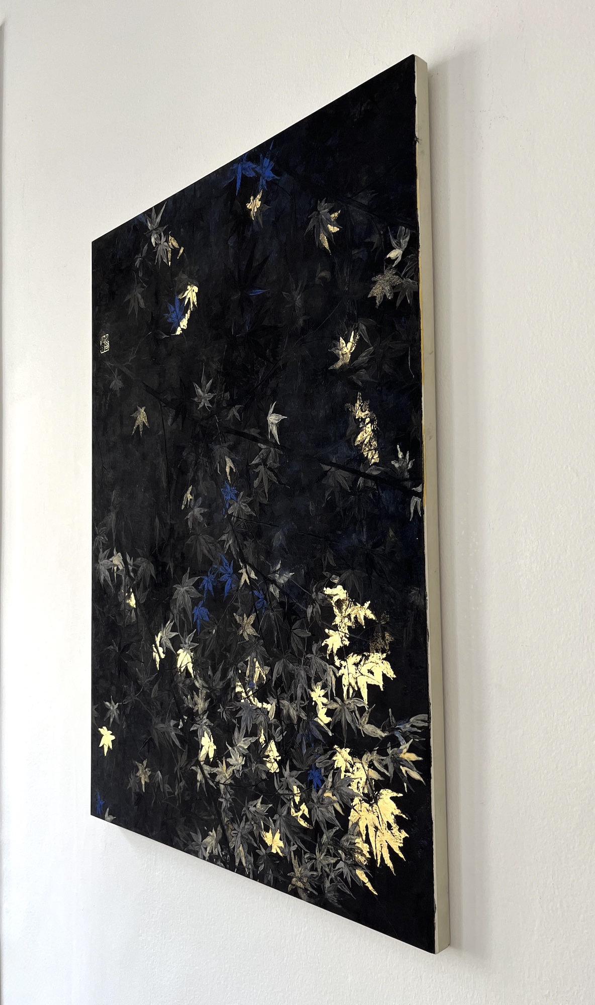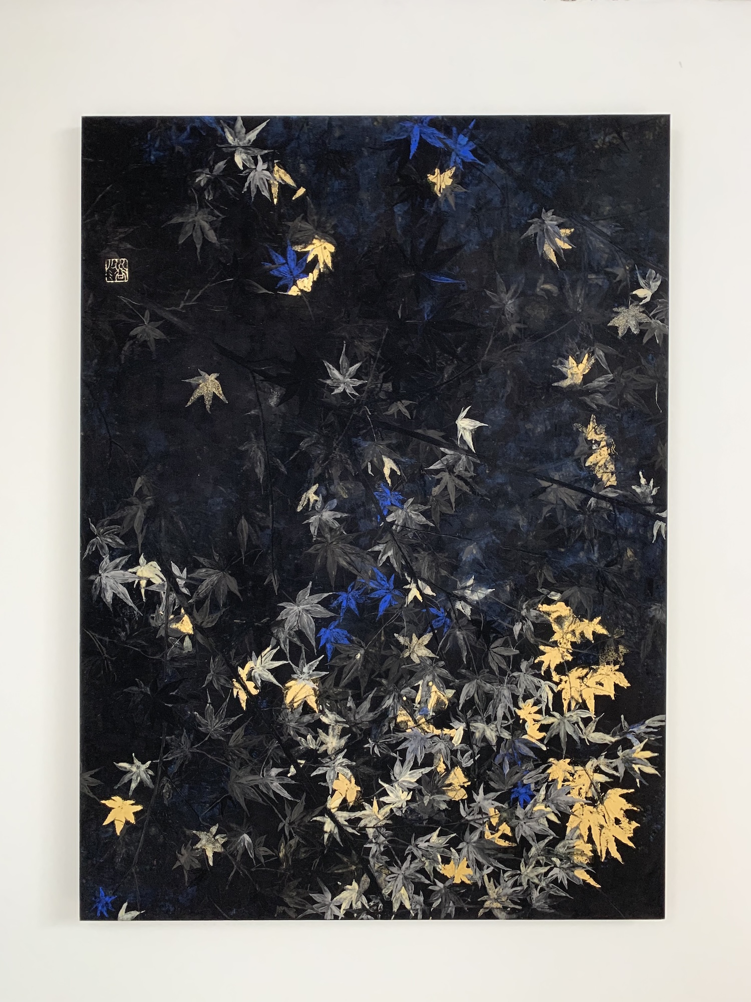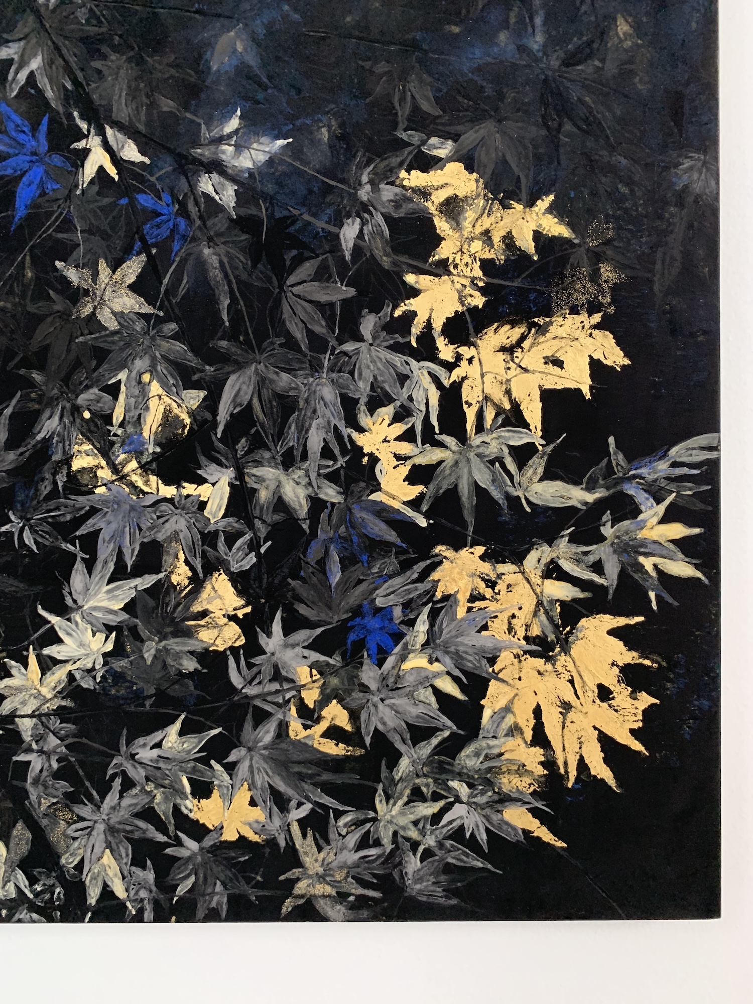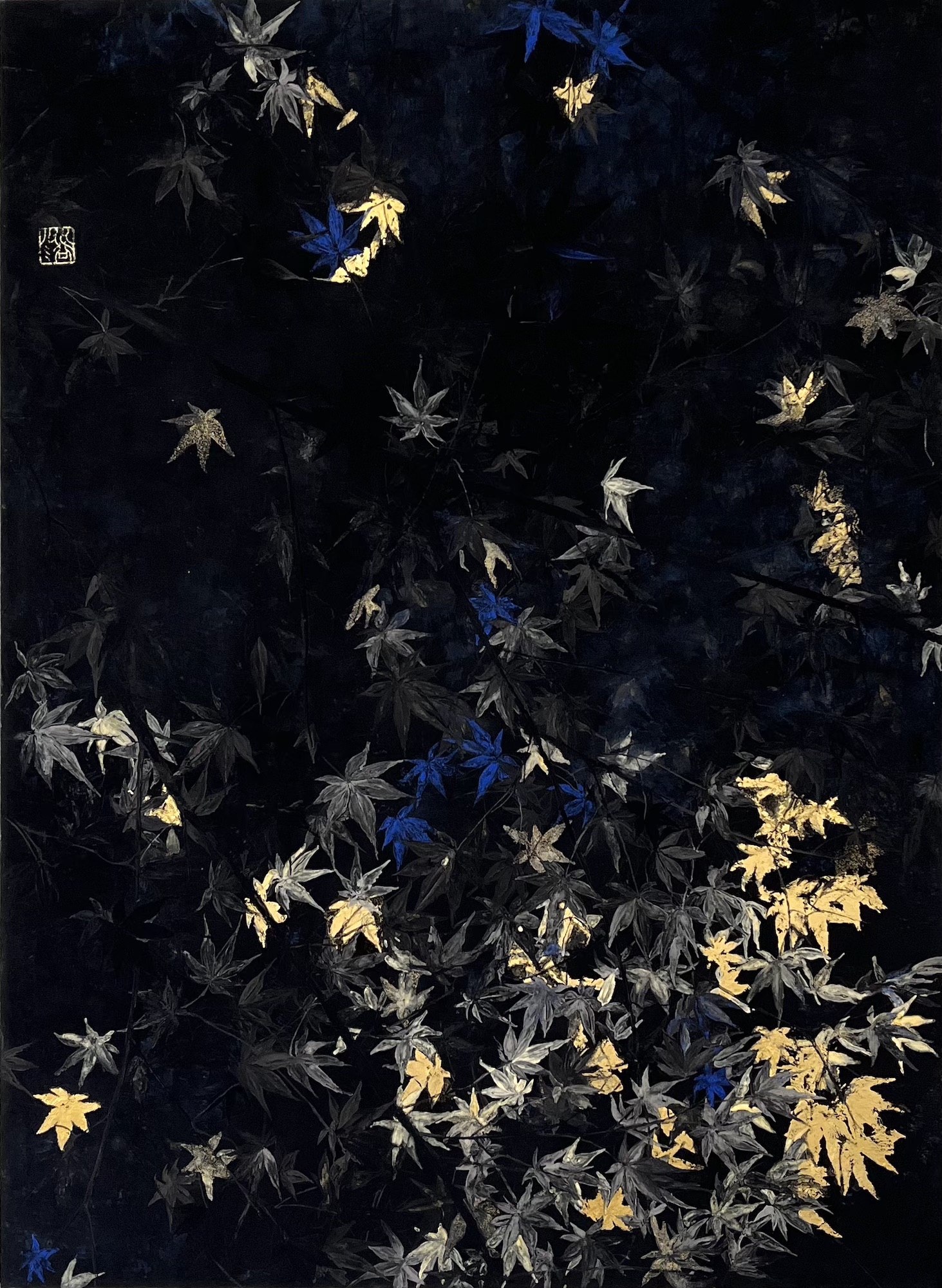 Nocturn VI is a painting by contemporary Franco-Japanese artist Lumi Mizutani made with Japanese pigments and gold leaves. With a delicate and poetic artistic vision, the painting depicts maple leaves, some cleverly illuminated by golden reflections and others highlighted by a bright blue colour.