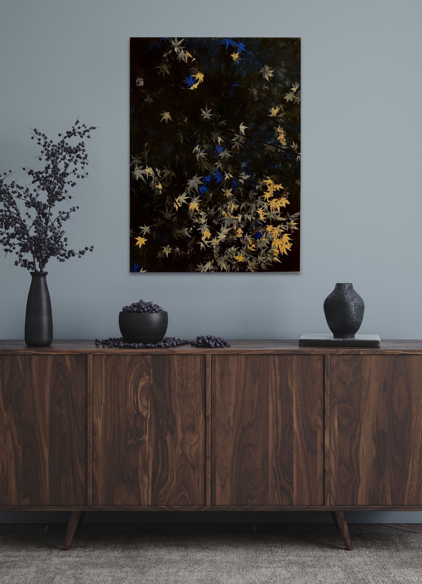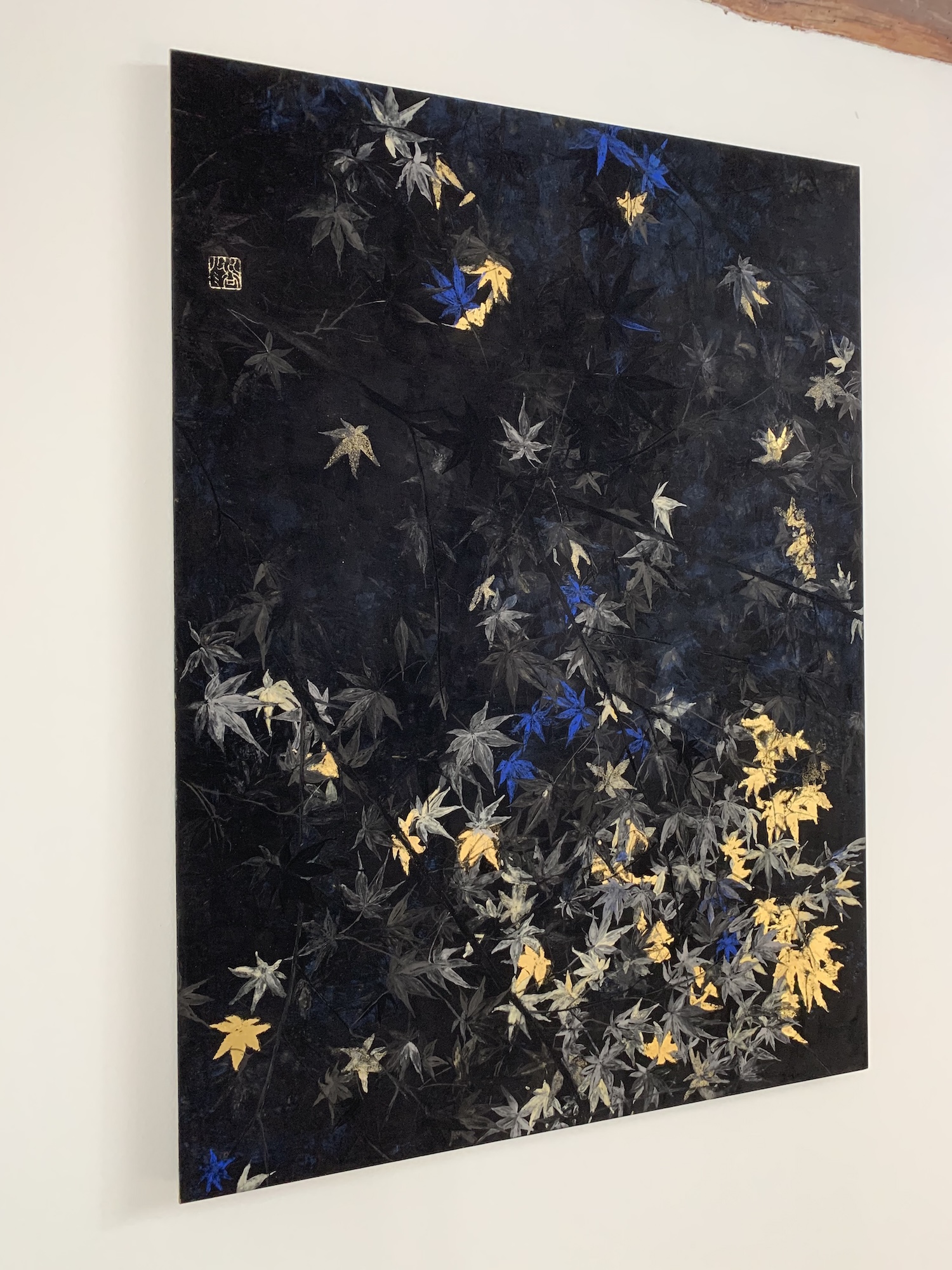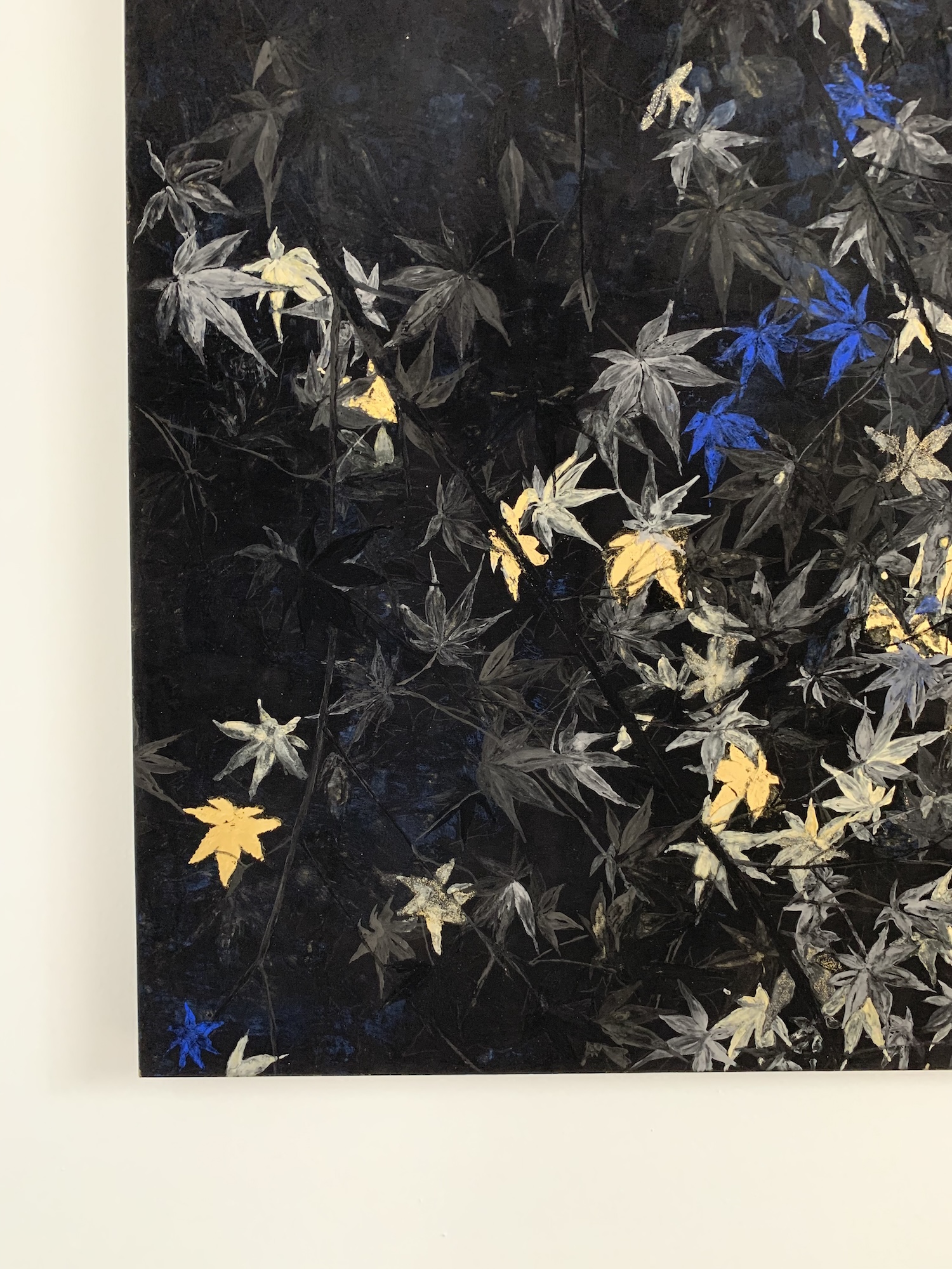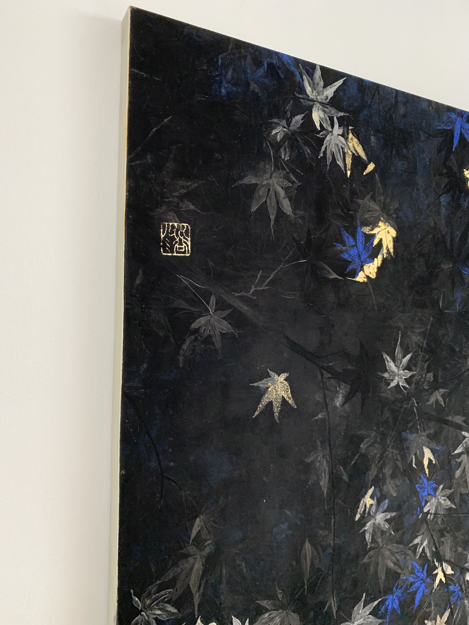 Nocturn VI is a painting by contemporary Franco-Japanese artist Lumi Mizutani made with Japanese pigments and gold leaves. With a delicate and poetic artistic vision, the painting depicts maple leaves, some cleverly illuminated by golden reflections and others highlighted by a bright blue colour.