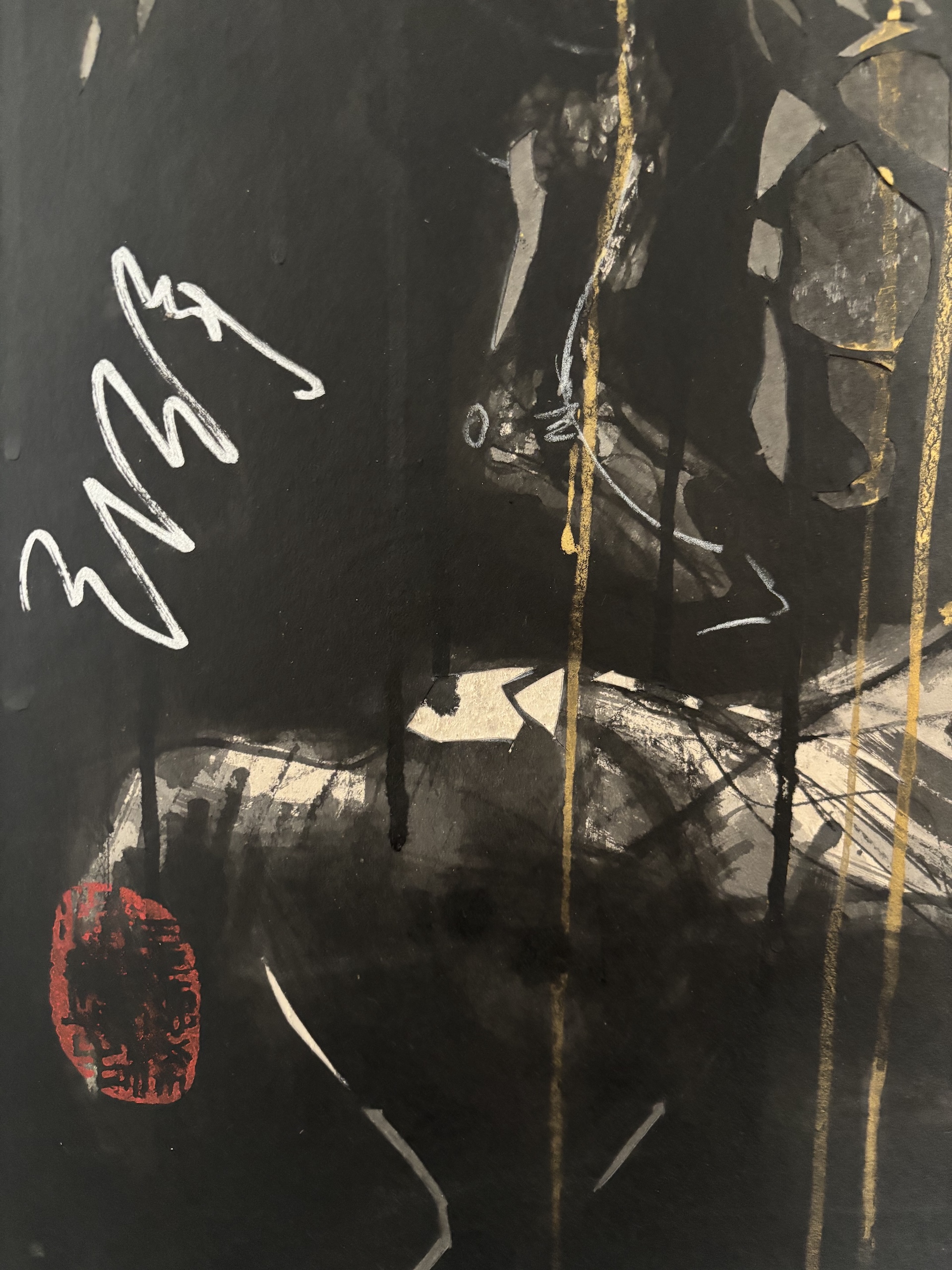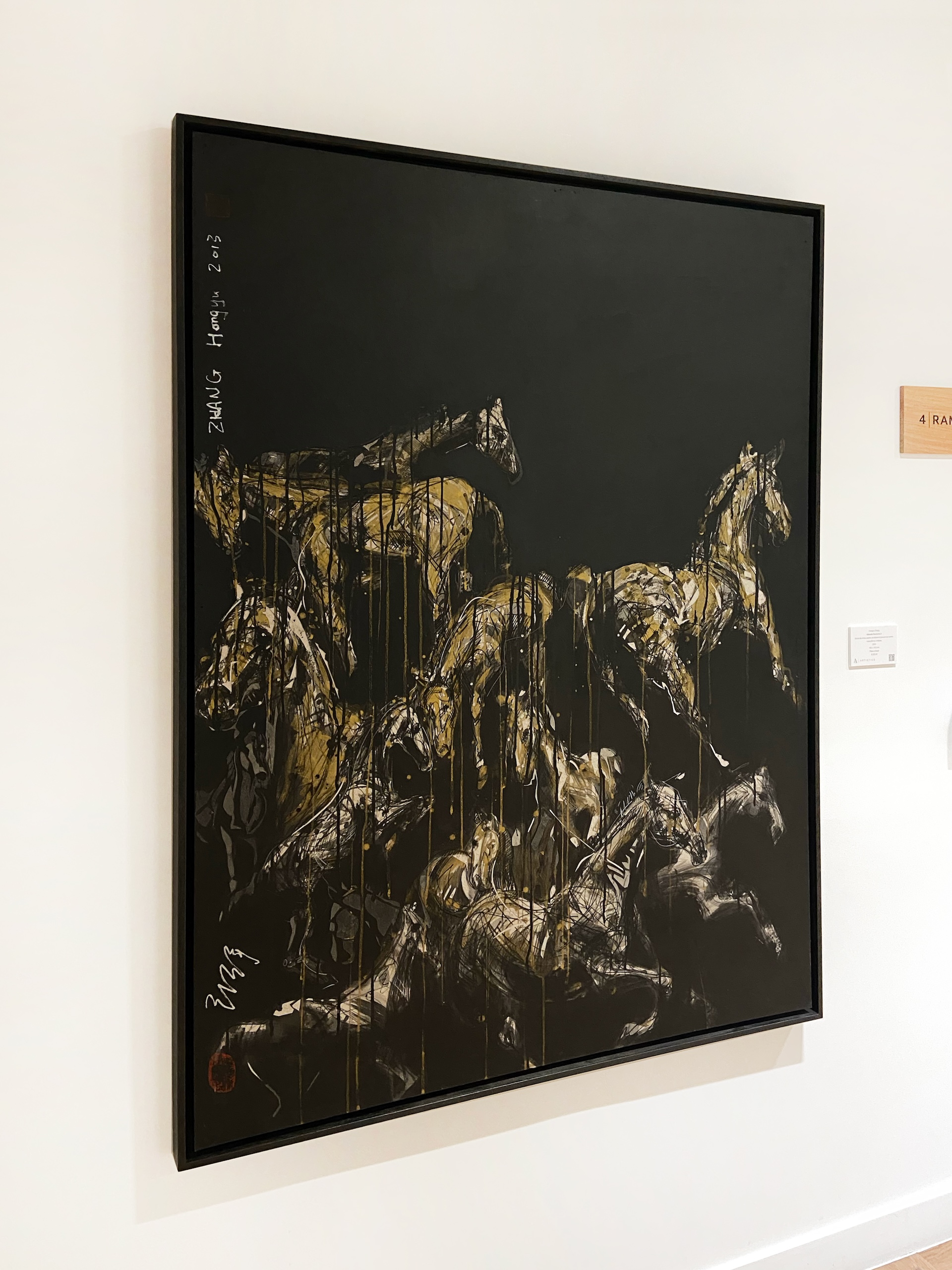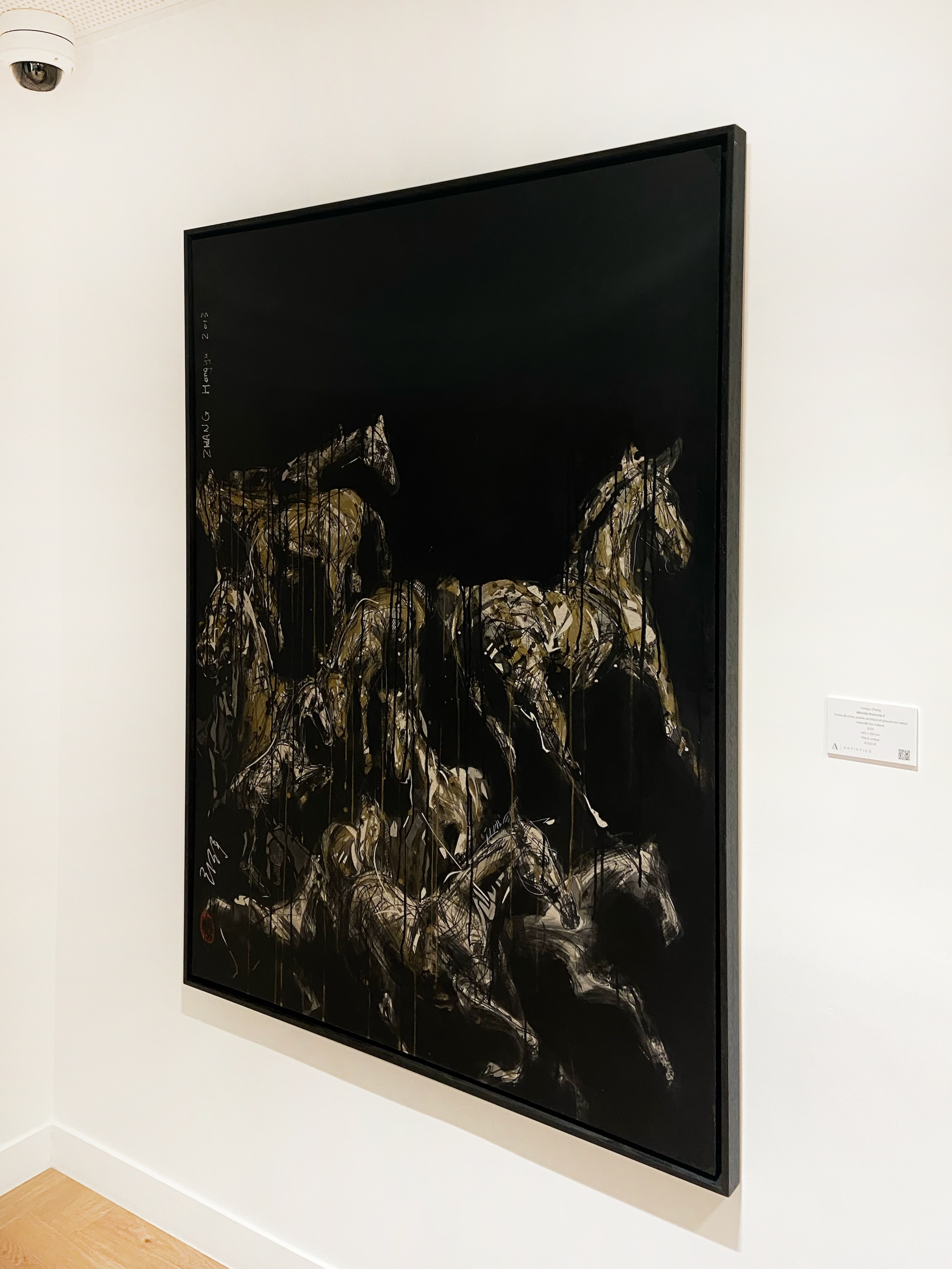 With a great minimal use of colour and an impressive technical brilliance, Hongyu Zhang manages to capture the fleeting beauty of this apparition. Through engraving, he sketches out the silhouette of the beast, carving out the canvas surface (a cardboard panel). This method – a legacy from his traditional Chinese calligraphy training – is the fundamental part of his art: he uses it to give both energy and elegance to the galloping horses. The artist then applies colour using different techniques: ink, pastel and acrylic paint. The artist also uses a silverly ink with shiny reflections.