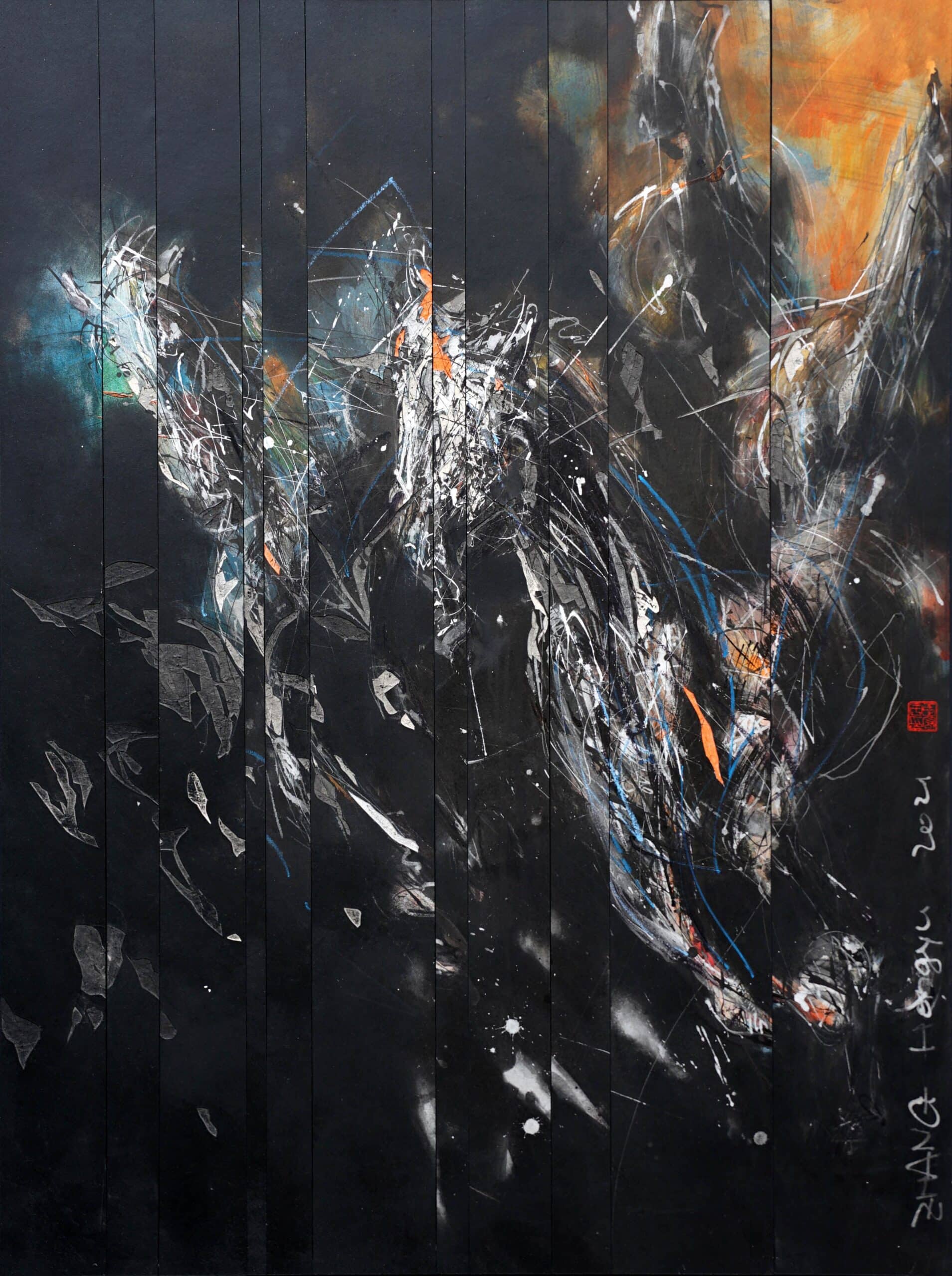 With a great minimal use of colour and an impressive technical brilliance, Hongyu Zhang manages to capture the fleeting beauty of this apparition. Through engraving, he sketches out the silhouette of the beast, carving out the canvas surface (a cardboard panel). This method – a legacy from his traditional Chinese calligraphy training – is the fundamental part of his art: he uses it to give both energy and elegance to the galloping horses. The artist then applies colour using different techniques: ink, pastel and acrylic paint. Blue lifts out the lines and certain volumes. These nervous stokes contrast with the darkness of the background, accentuating the dramatic atmosphere of this contemporary artwork. The artist also uses a silverly ink with shiny reflections.