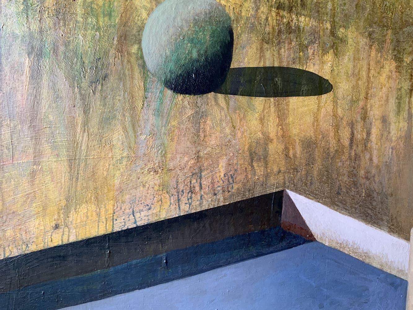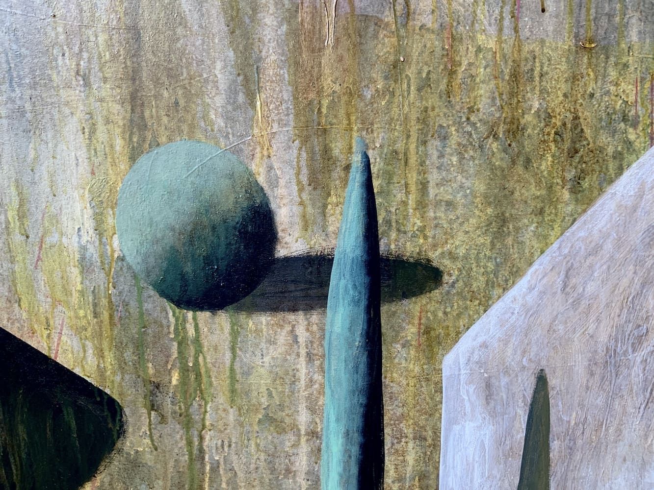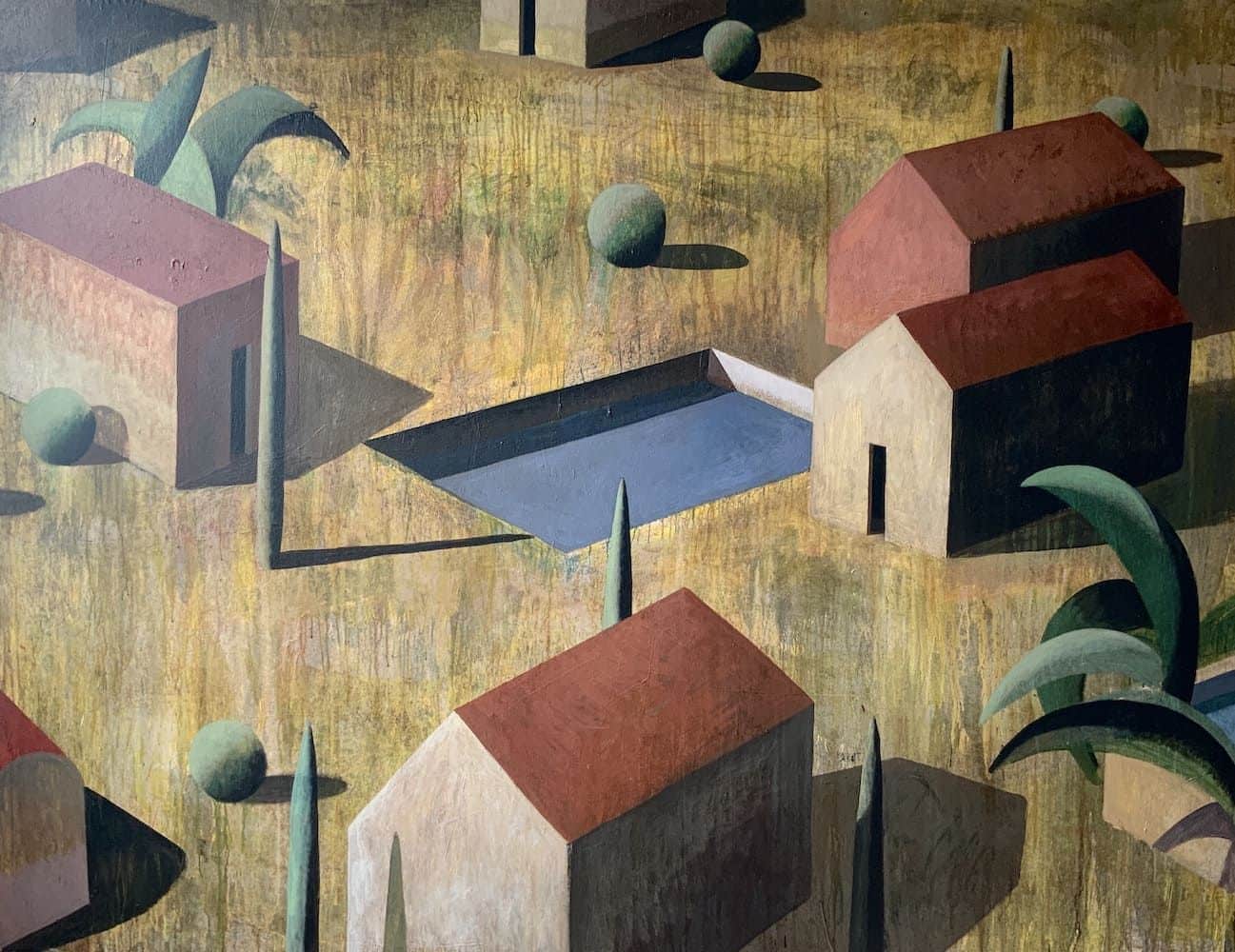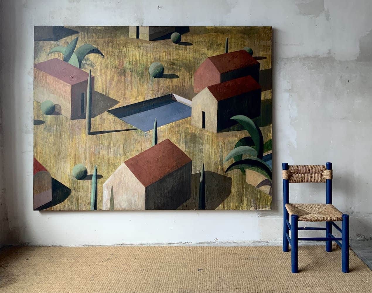 In these paintings, the artist establishes a conversation between architecture and landscape in a figurative work boasting geometric shapes and an enigmatic atmosphere. The landscapes and the simplicity of the forms (near abstract) make for a very theatrical view of architecture.