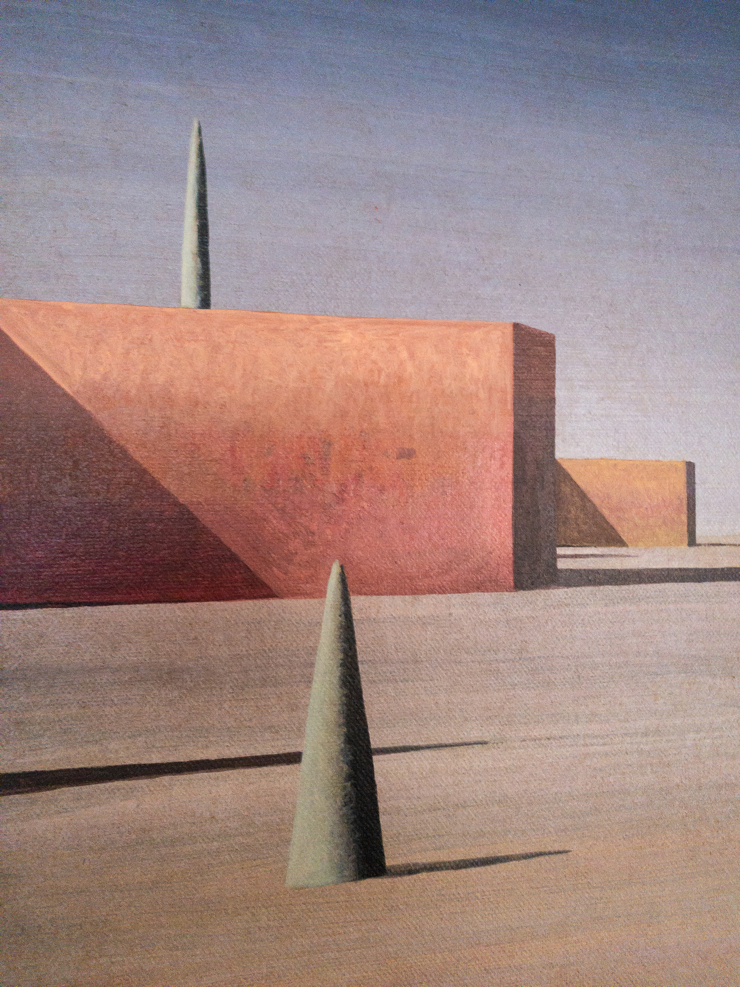 In these paintings, the artist establishes a conversation between architecture and landscape in a figurative work boasting geometric shapes and an enigmatic atmosphere. The landscapes and the simplicity of the forms (nearly abstract) make for a very theatrical view of architecture.