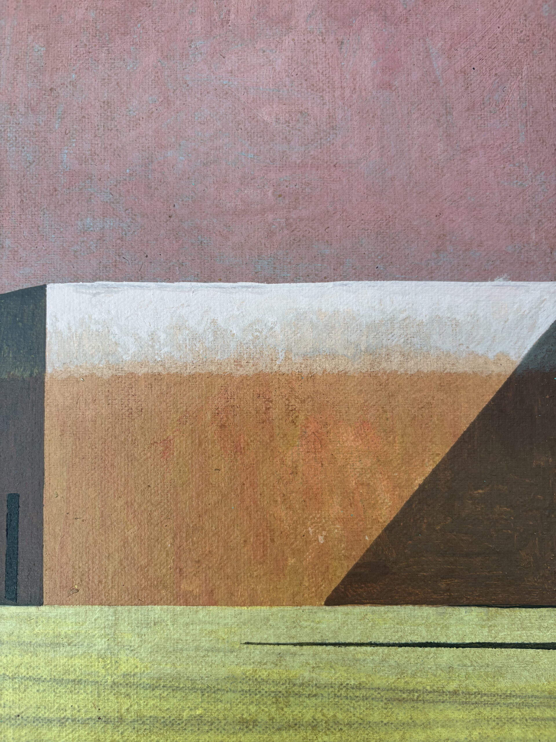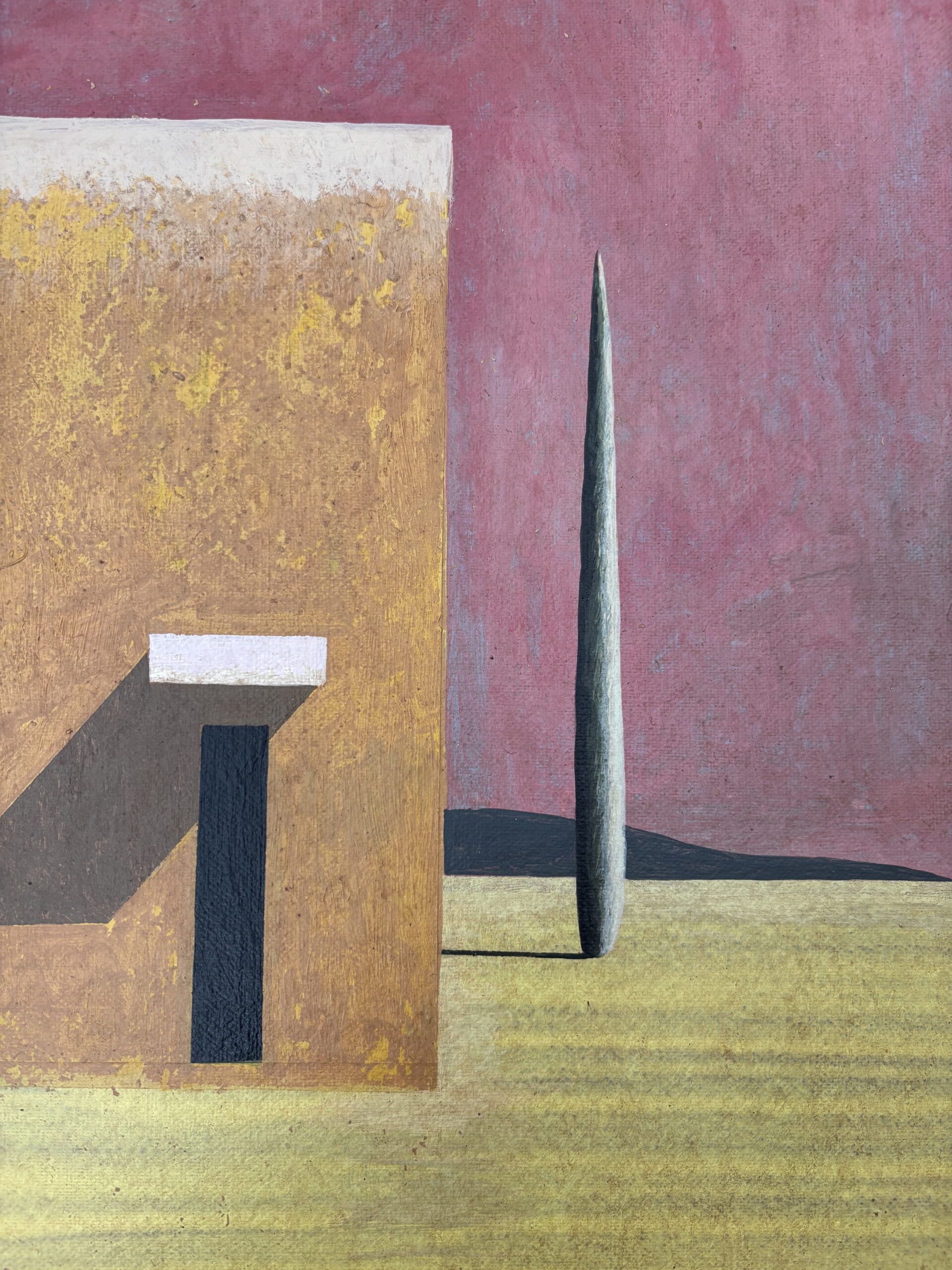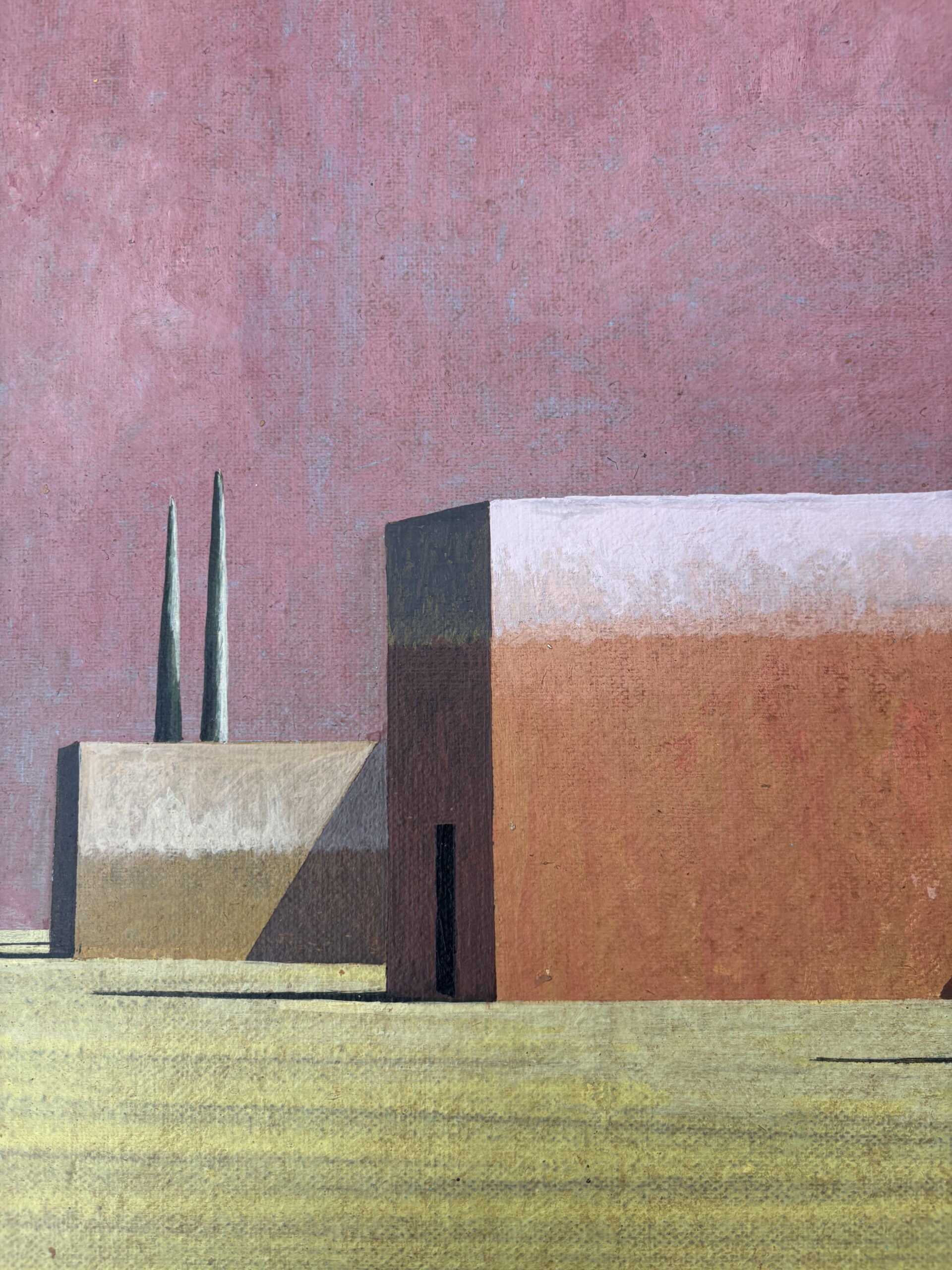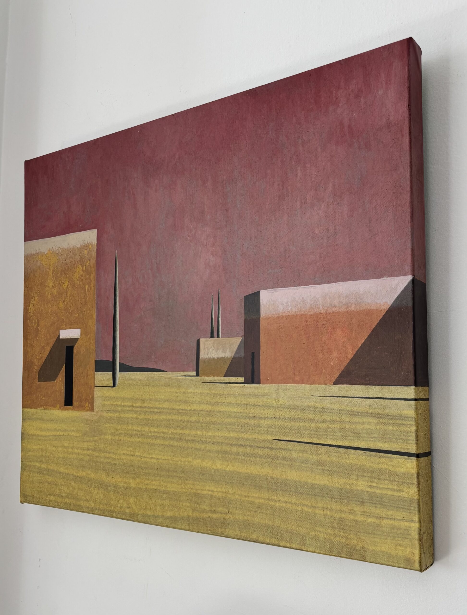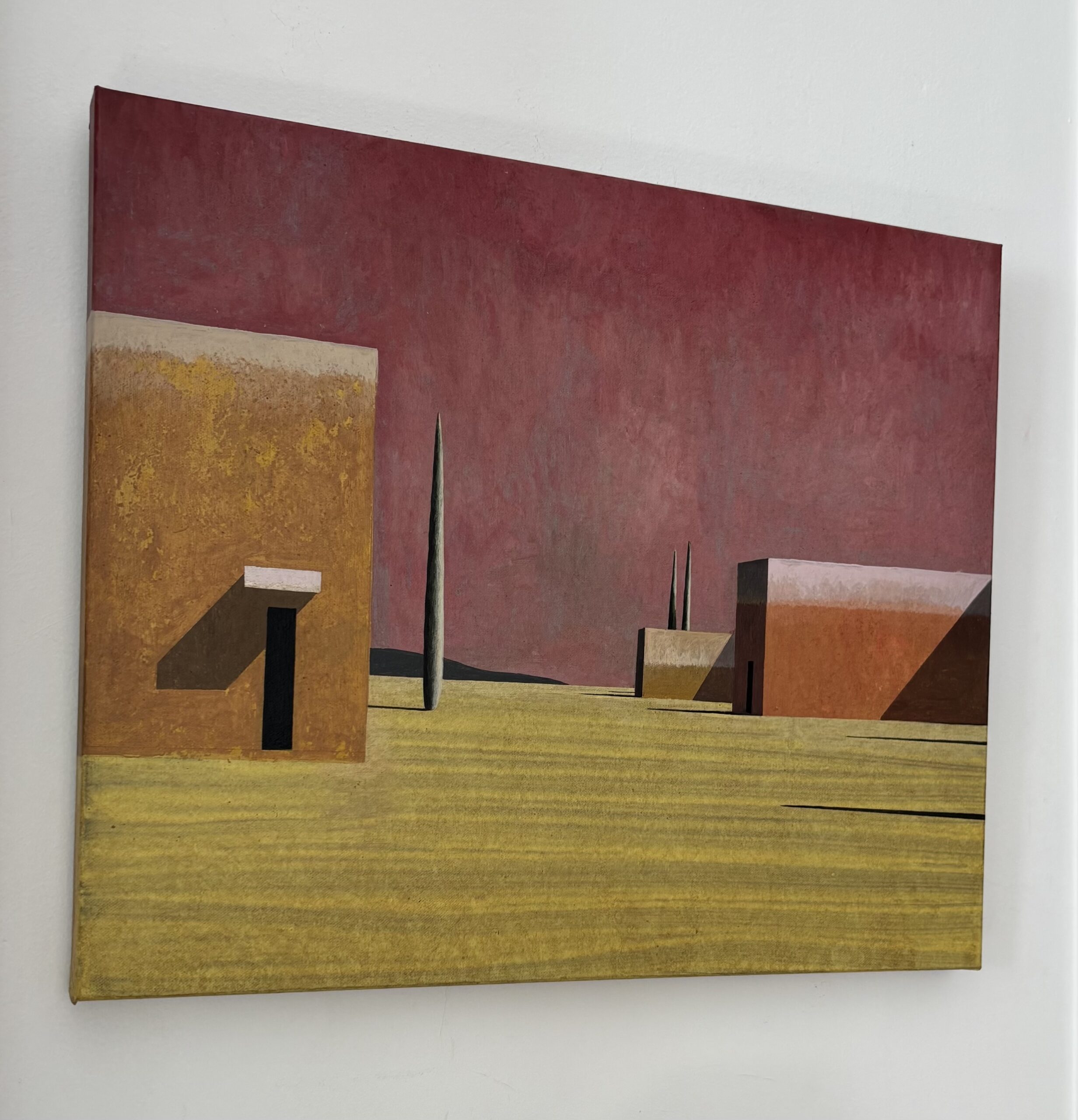 In this artwork Enrich demonstrates a characteristic interplay between built structures and natural scenery, unveiling a figurative composition marked by bold geometric forms and a decidedly mysterious mood. The visual structure is primarily composed of block-like, geometric architectural shapes and a single tall, tapering conical form against a wide, vibrant red background and a flat, striated yellow foreground, evoking a sense of monumental, quiet emptiness. The illumination and presentation of these stripped-down elements, with strong cast shadows, create a distinctly dramatic perspective on architecture.