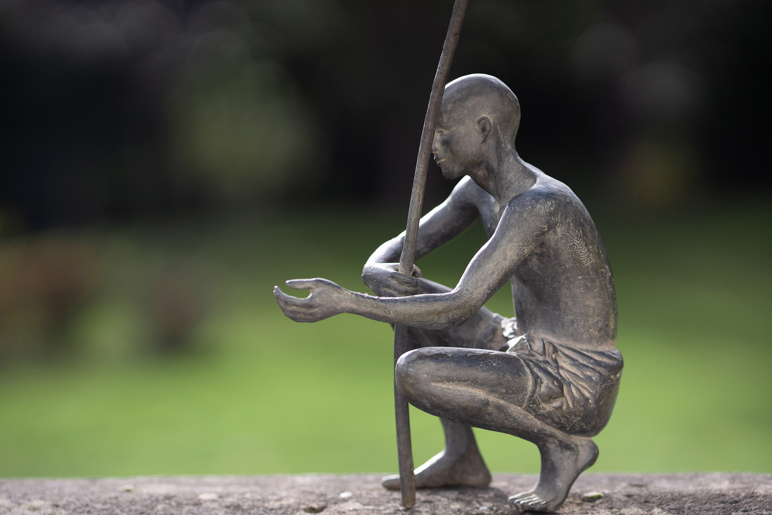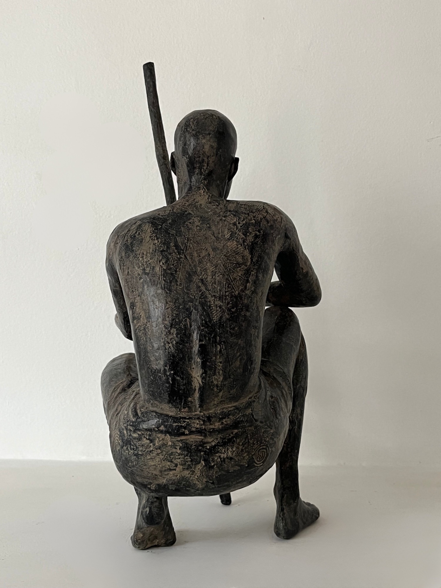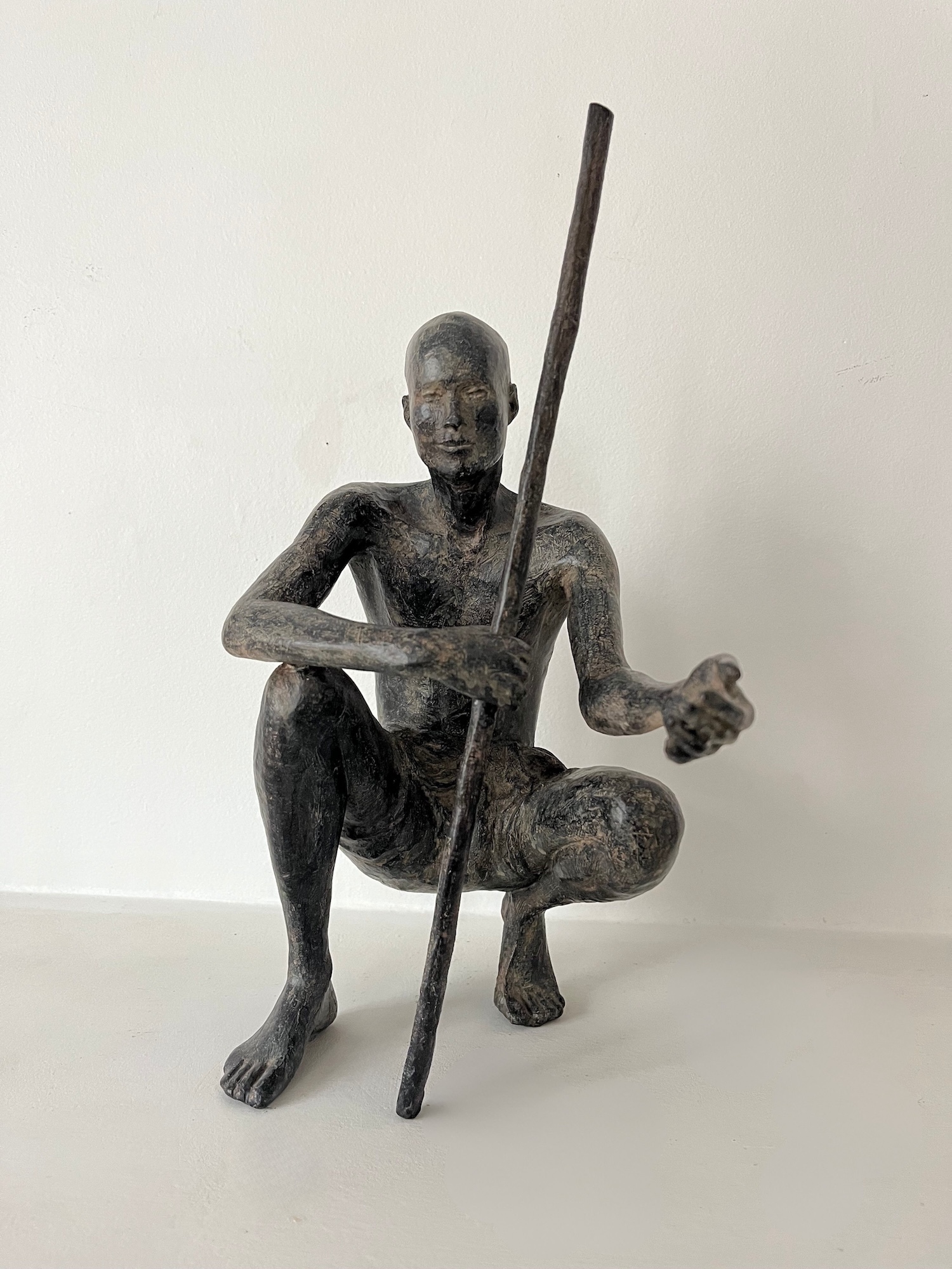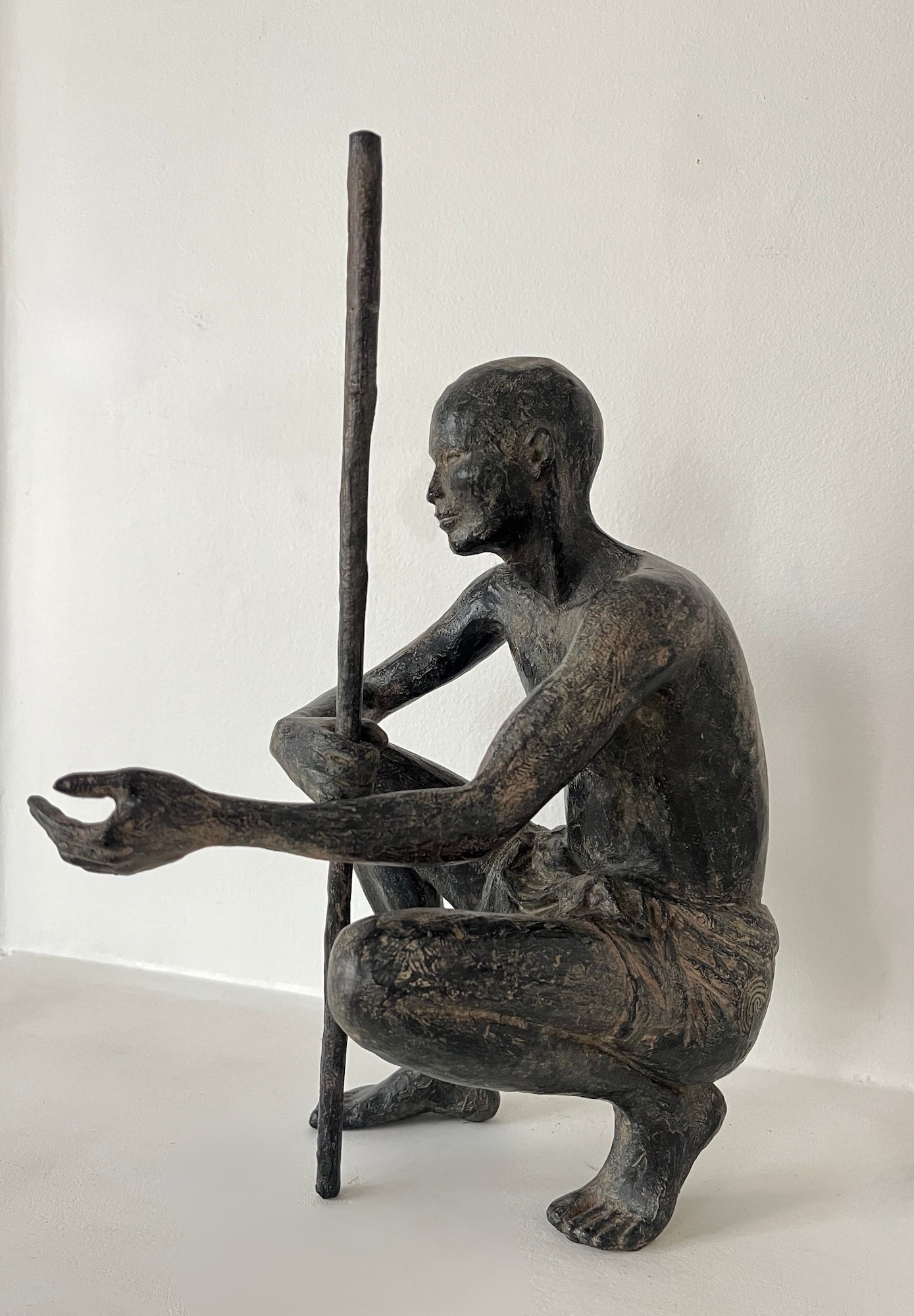 Palabres (Small) is an artwork by French contemporary sculptor Marine de Soos. This bronze sculpture is from the “Figures” series. This figurative artwork represents a young man crouching, bare-chested and bare foot. He is holding a stick in one arm and extending the other as a sign of friendship. In Africa the « palaver » is a meeting practice during which the community of the village strengthen the social bonds and solve the litigations as well. The artist gets her inspiration from real or imaginary scenes. This bronze large-scale sculpture could be placed in an outside setting.