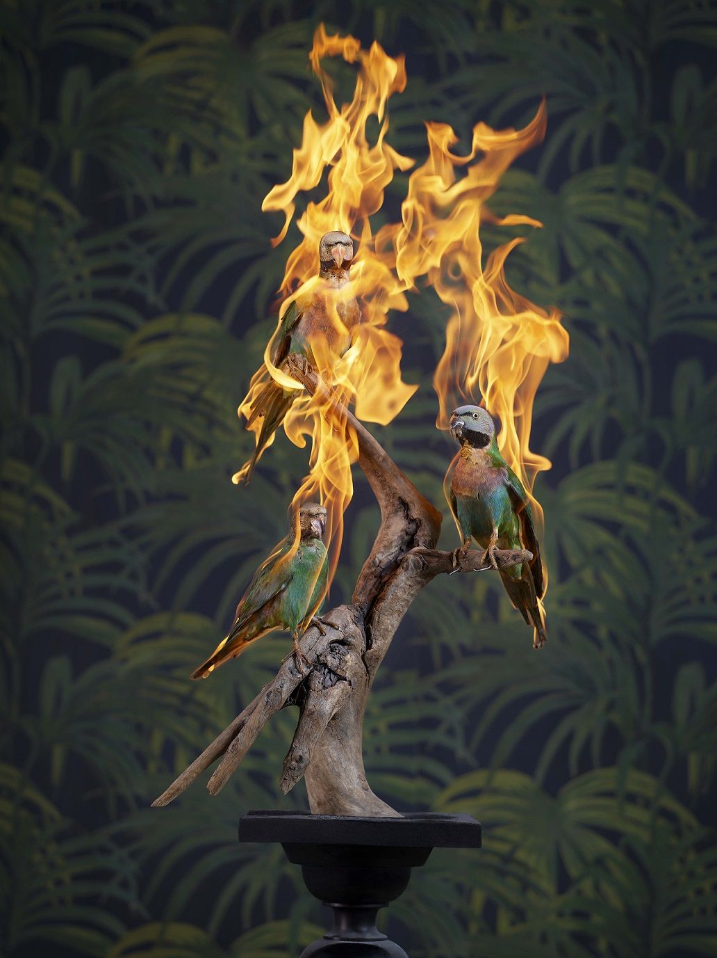 These photographs are areas of cultural and mythological reference through which Christian Houge creates. Immortalising the destructive fire, he celebrates the animal’s release from the condemned to a state of permanent and eternal degradation. This scene, disturbing as it is frightening, represents a passive triumph for the animals who gradually die out on a backdrop of a luxurious nature reproduced by Victorian tapestries. The latter were chosen by the photographer to embody the human century-old imperialism over nature and their fellow man.