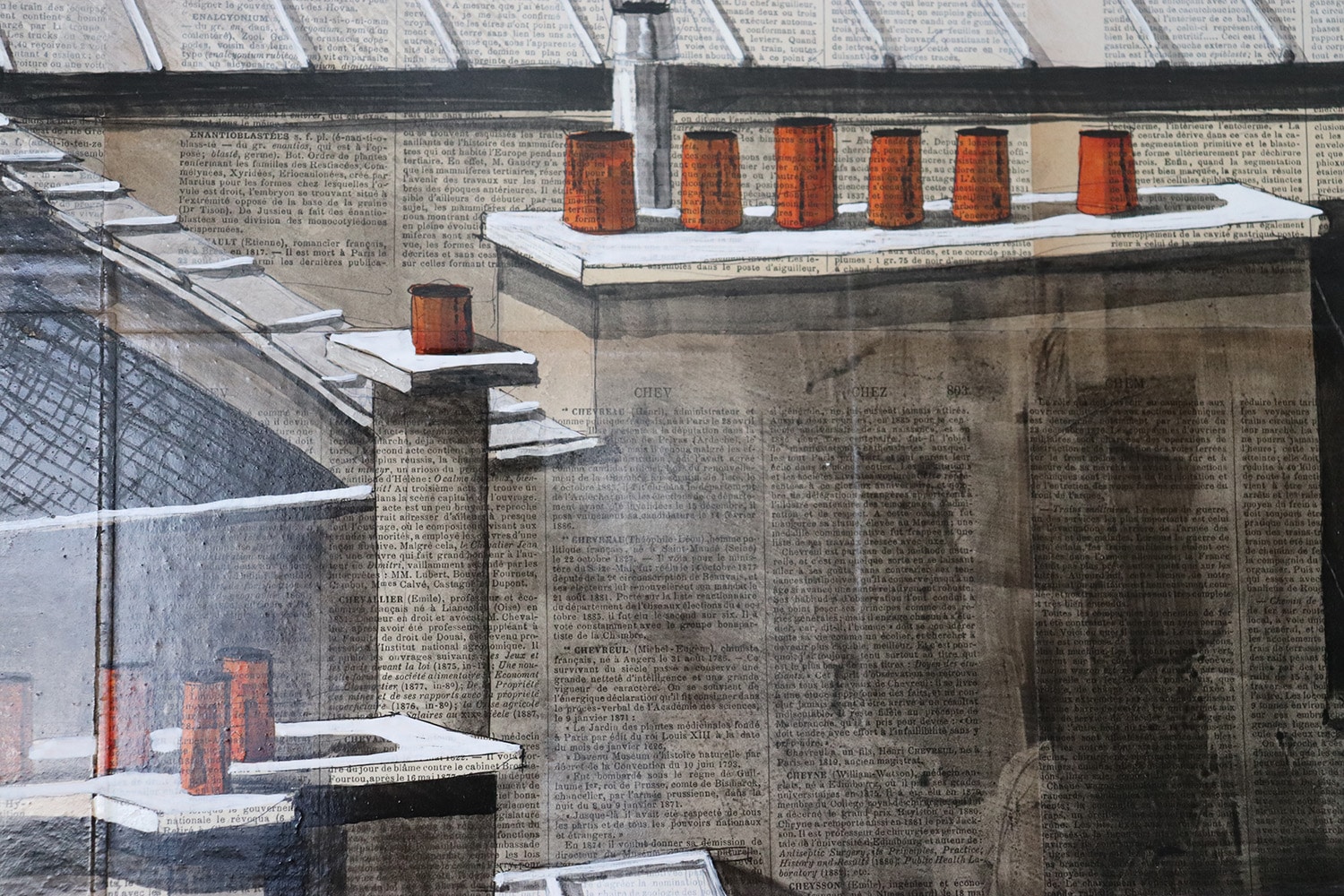 Megacities are the artist’s favorite subject. Through his paintings, Guillaume Chansarel attempts to capture the city’s graphic identity, as a photographer would press the shutter button on his camera. The uniqueness of the artist’s work lies in the realistic aspect of his work but also on the original use of an innovative support: pages of print from antique books onto which he draws and then paints, and consequently which tells a completely new story.