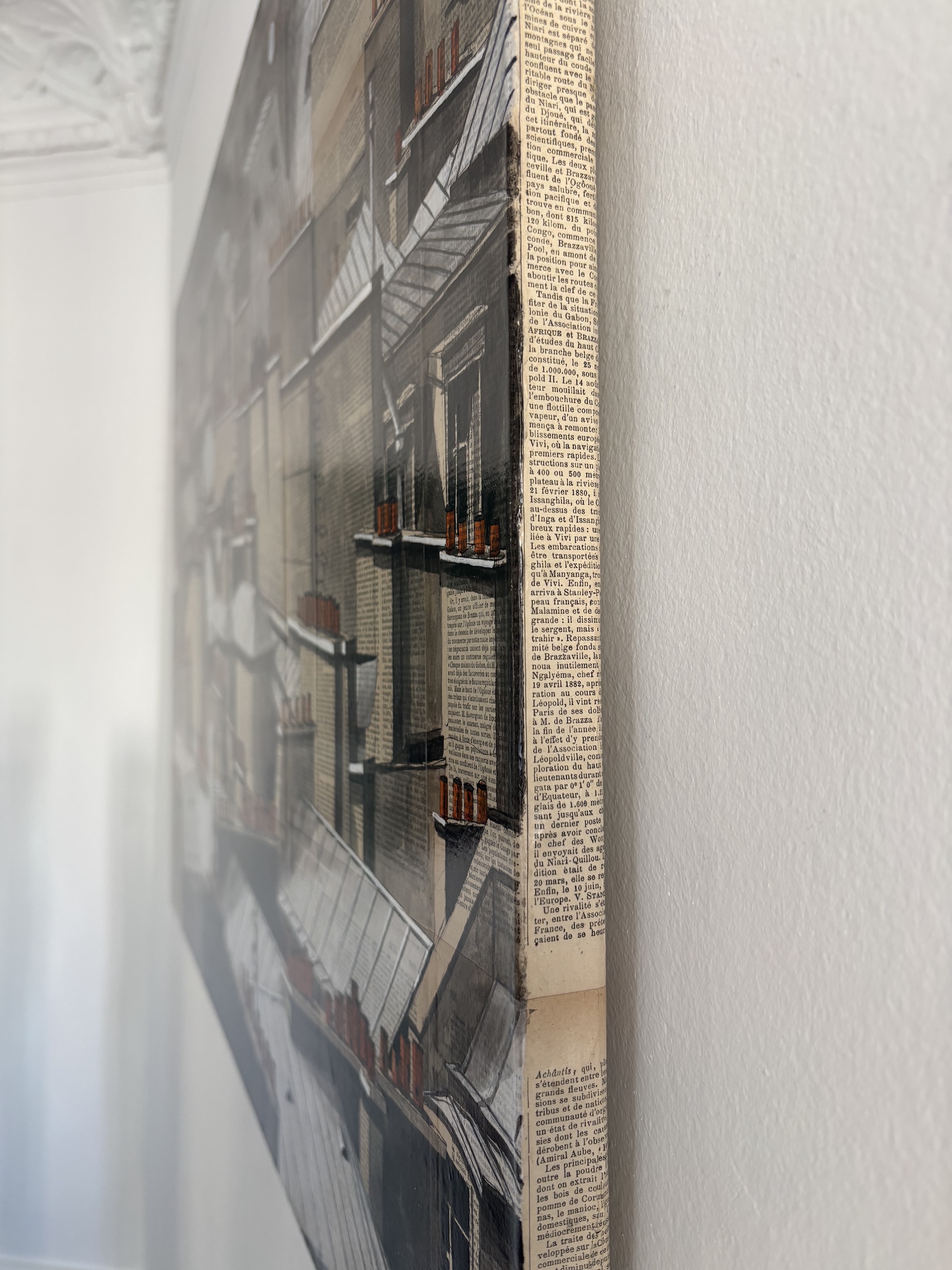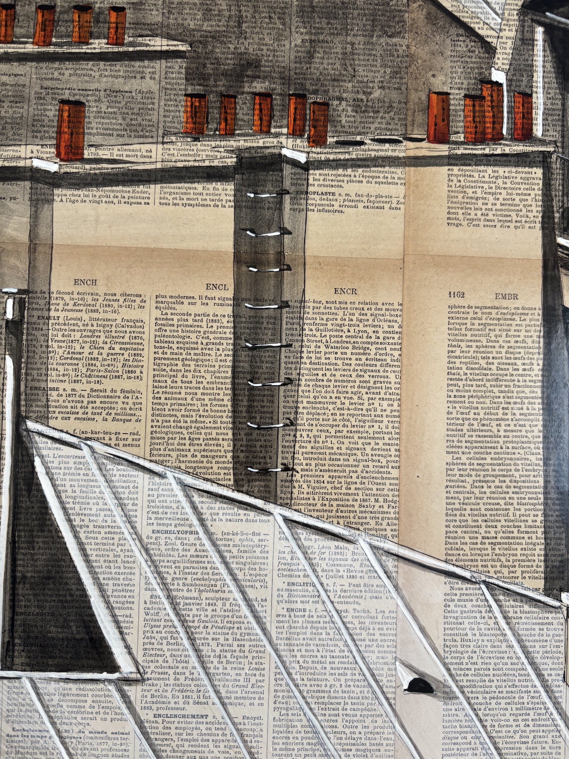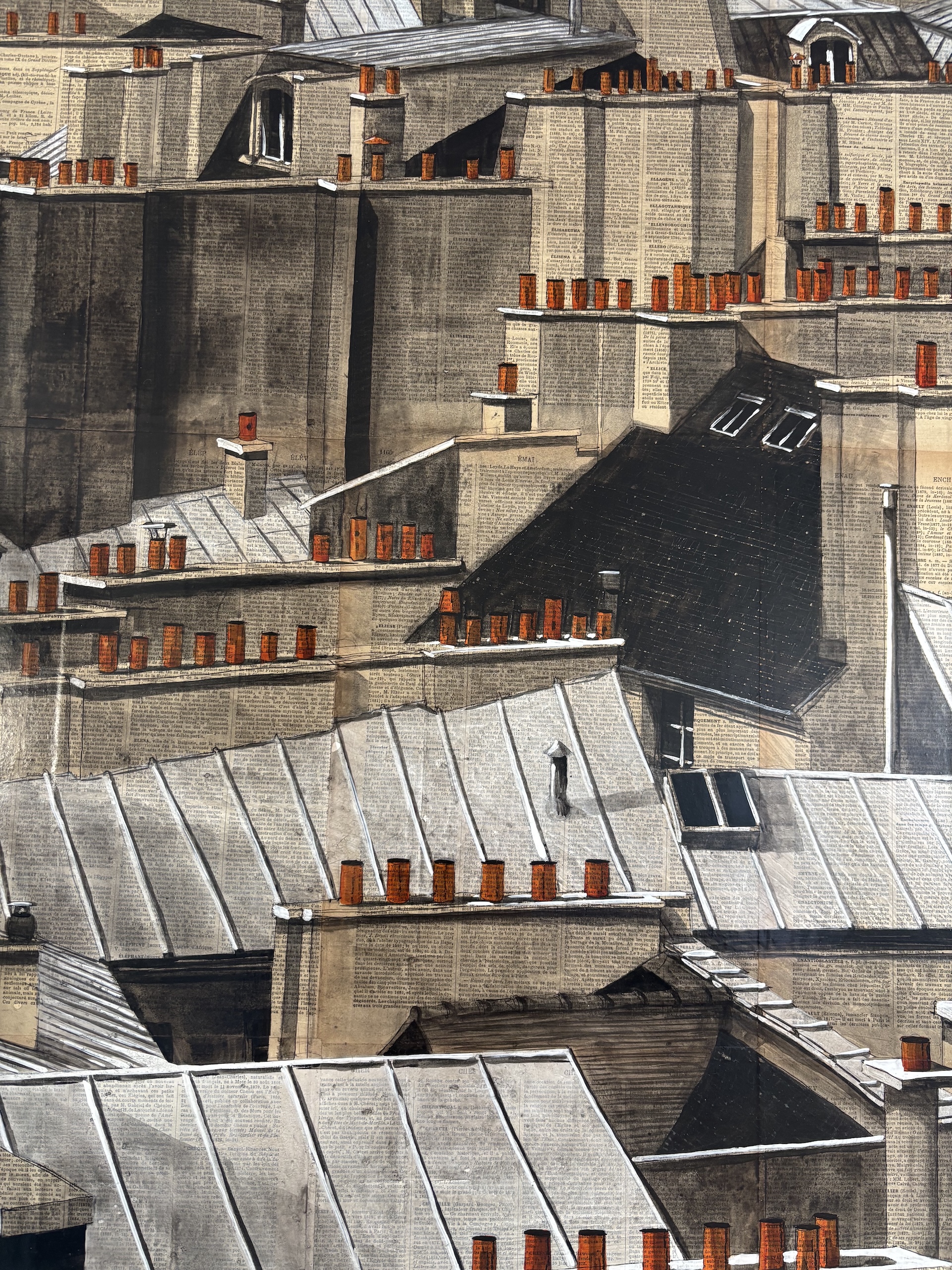 | Description | Ink and acrylic on old book pages mounted on canvas |