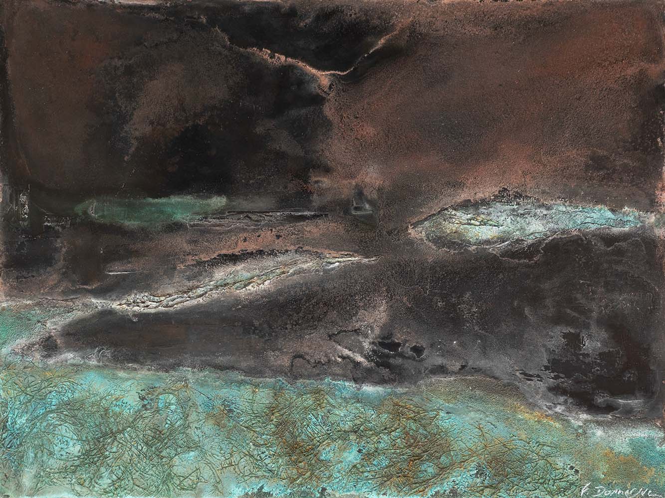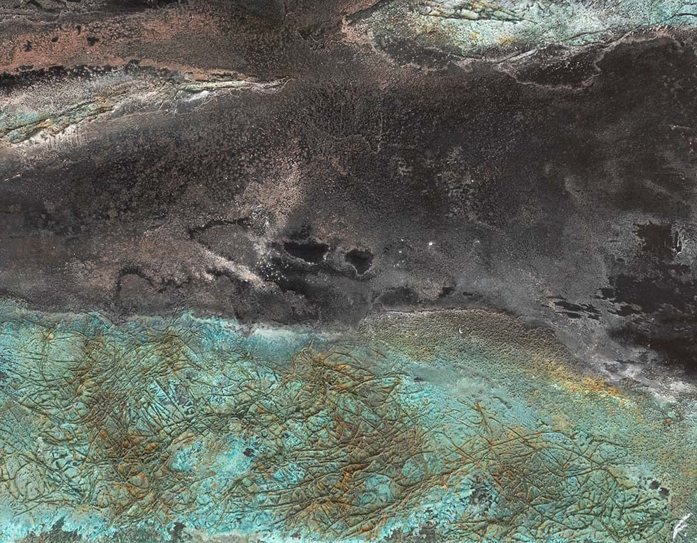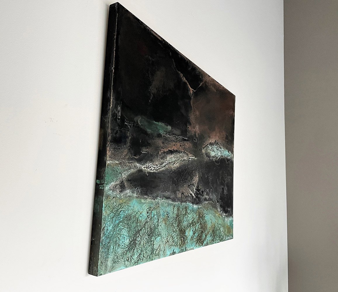 Frédérique Domergue finds her inspiration in nature and at the seaside. Her paintings evoke landscapes, skies and seas that are sometimes calm and tranquil, sometimes dark and turbulent. The different oxidations with green and copper hues create powerful contrasts within the composition.