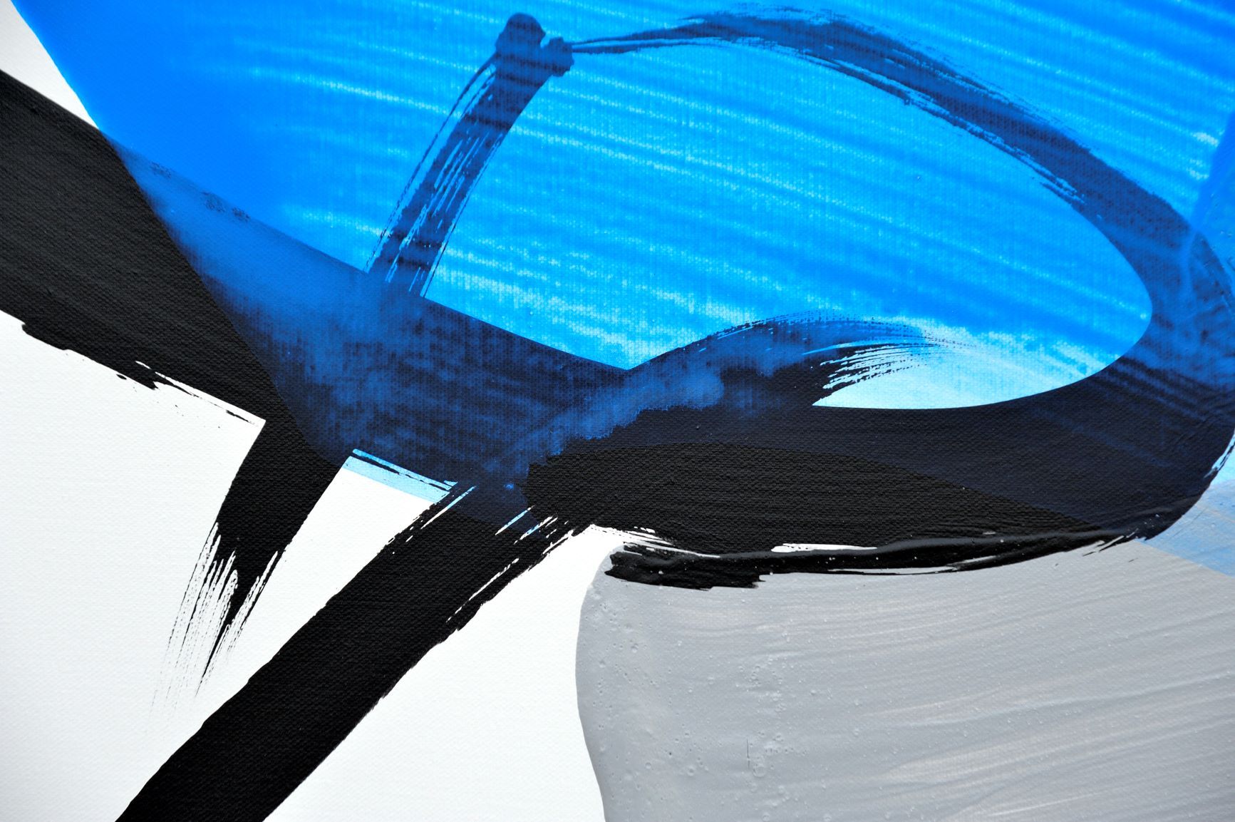 This artwork belongs to an abstract register and draws its influences from Japanese calligraphy. The brushstrokes, vigorous and yet elegant, are clearly visible and suggest the painter’s gestures. The black, grey and blue colors intersect on the canvas, creating layers and transparencies. This painting, created with ink and acrylic, seems to spread a sort of energy and at the same time it invites to meditation.