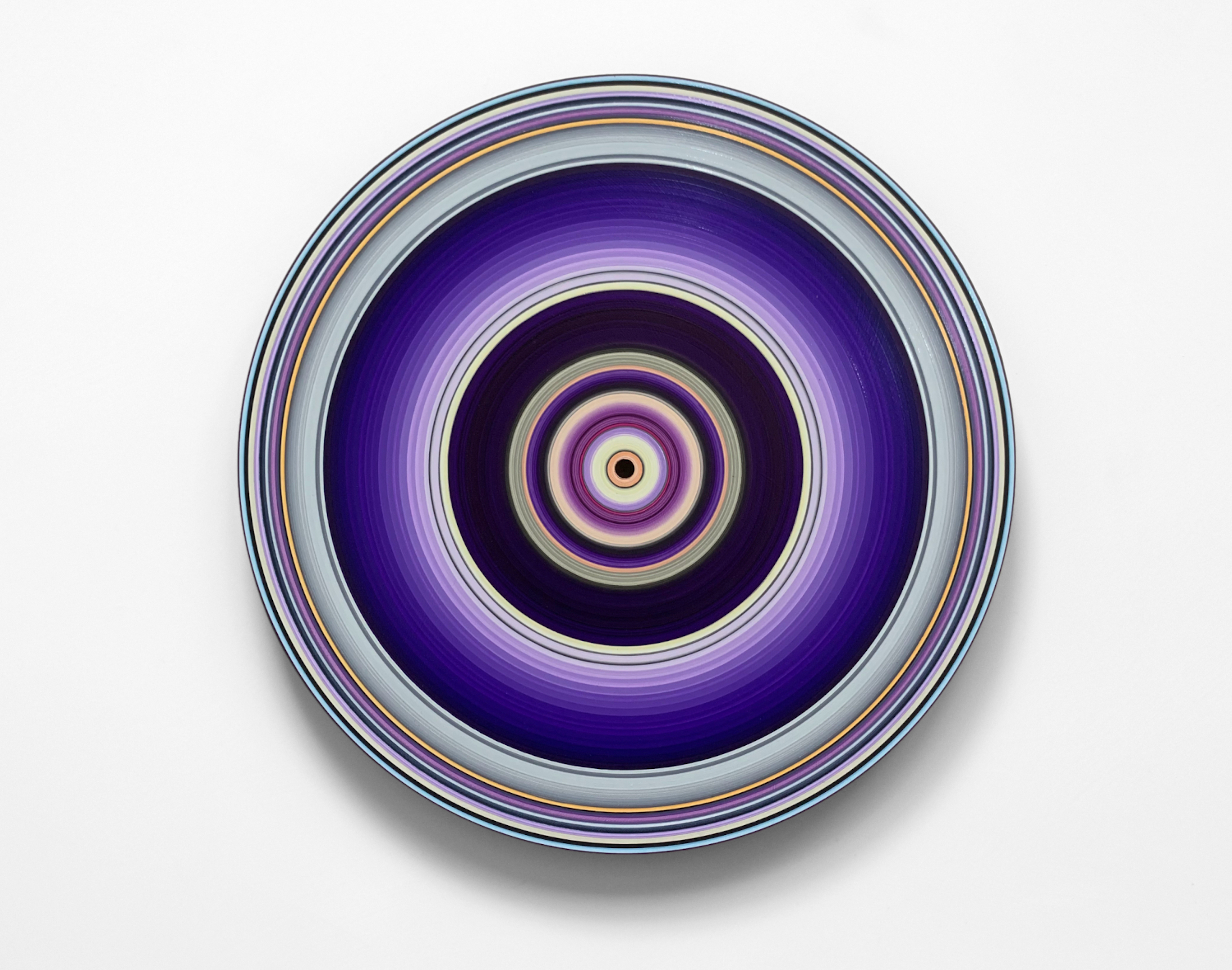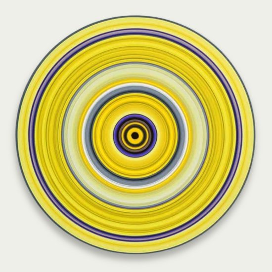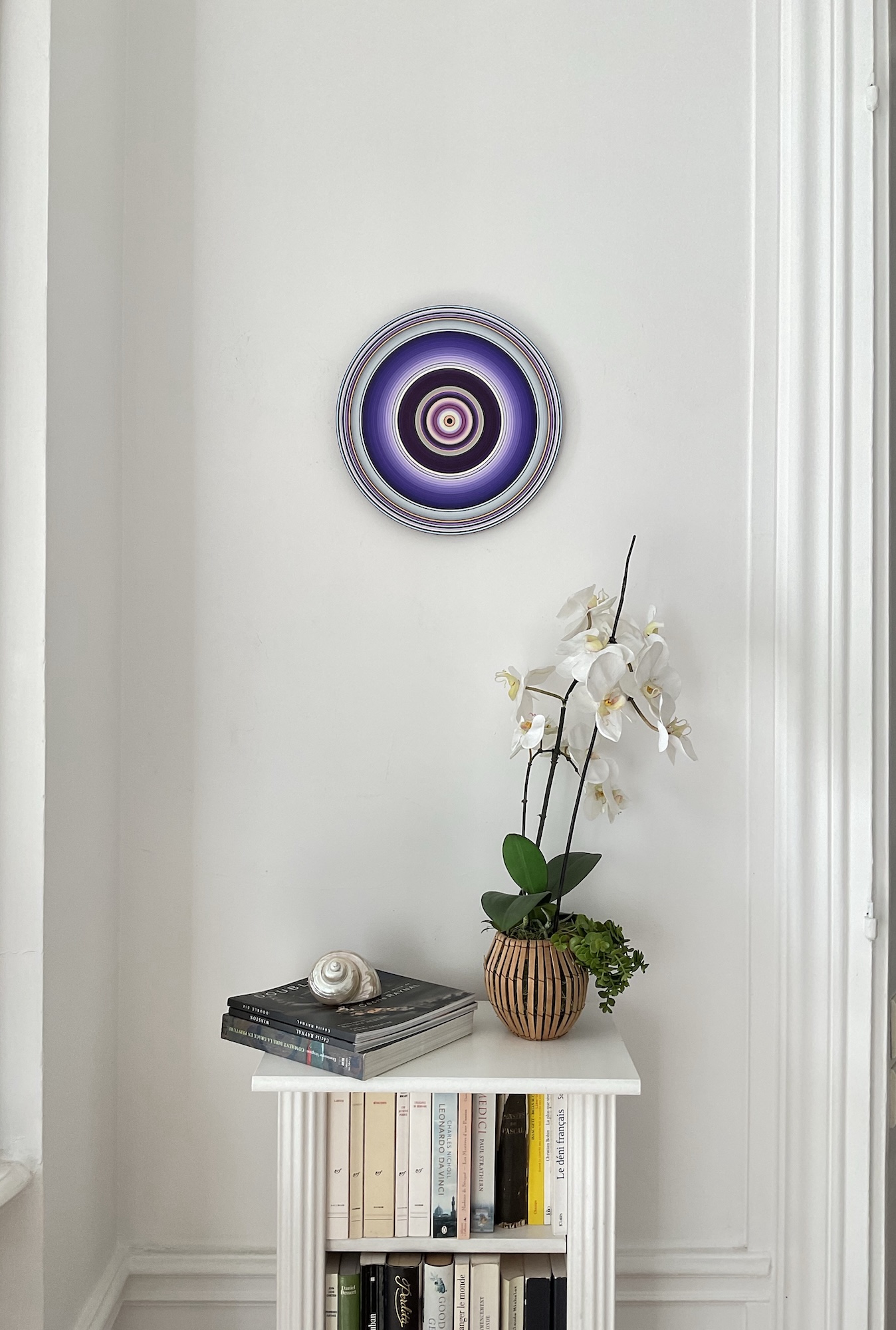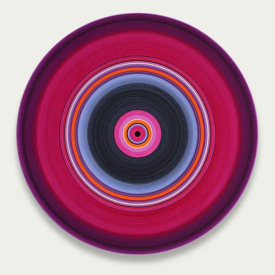 In this last series Sound and Vision, the line remains the only motif of the compositions, but it is illustrated on a new medium which is none other than a vinyl disk. In painting on a turntable, the artist transformed these acoustic data carriers into visual aids: as if the musical pieces are replayed with a brush, in a sort of transformation of sound into image. Individually made in an enduring search for a balance between line, colour and rhythm, these paintings make up an alphabet from which the artist draws on to create different installations and collections.