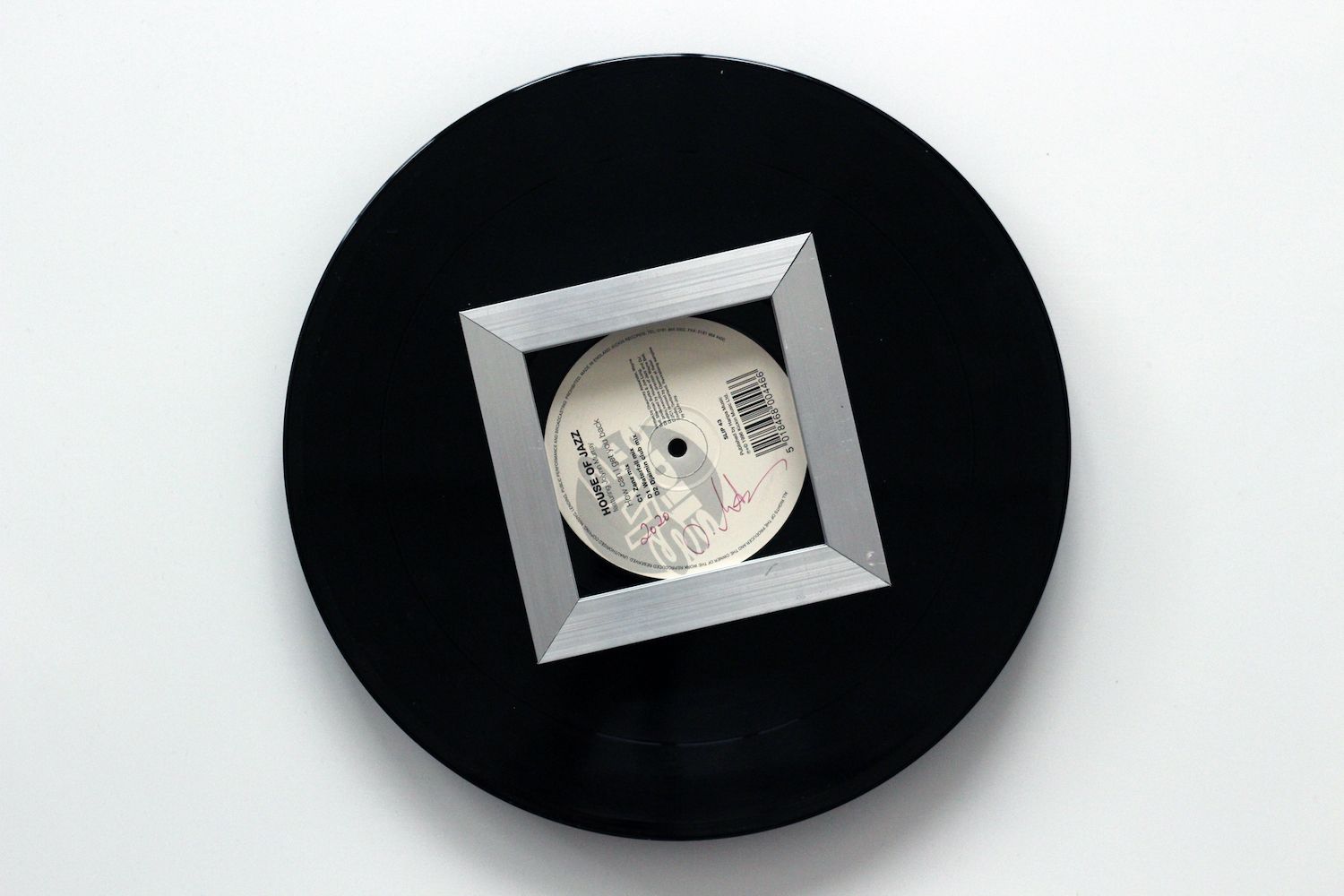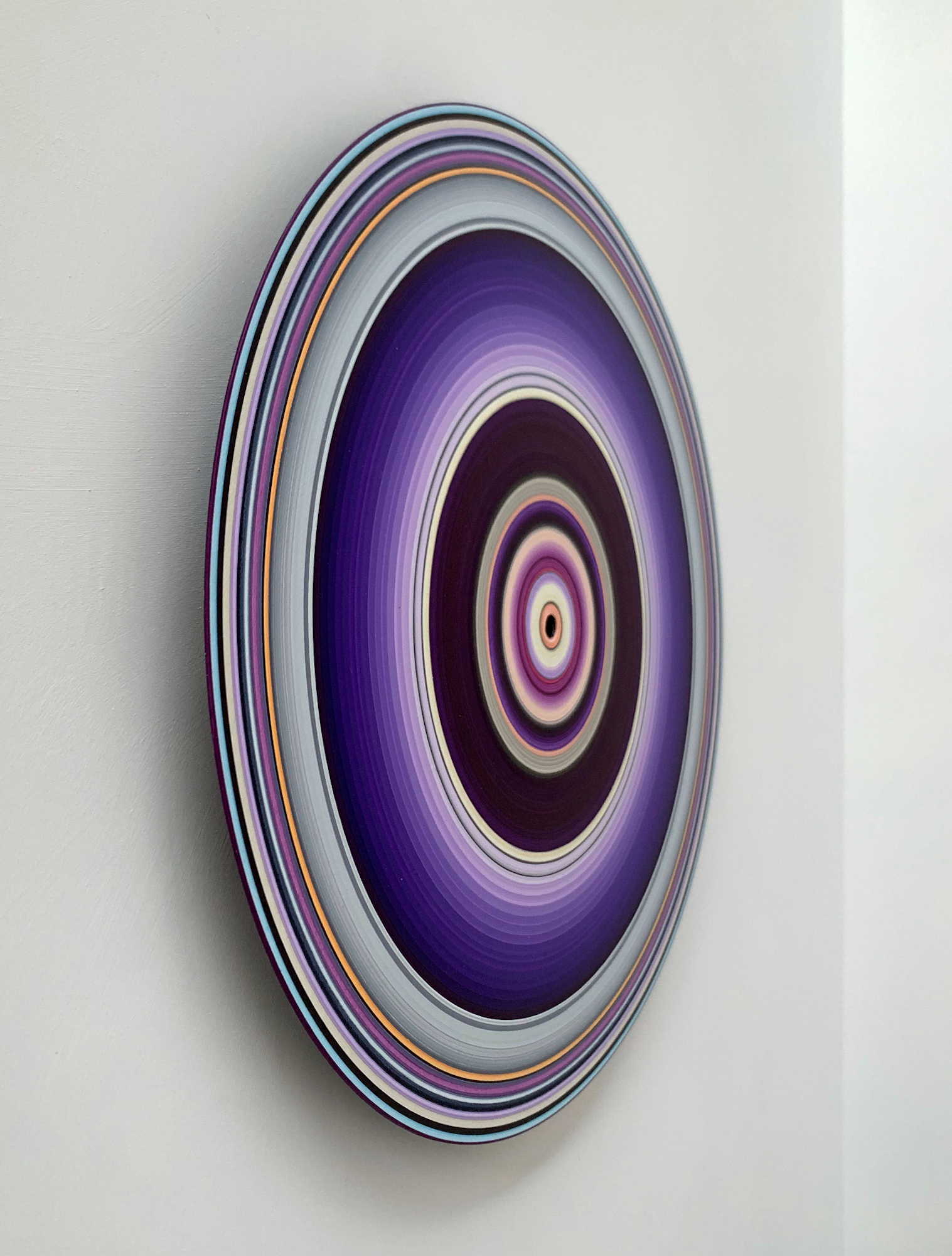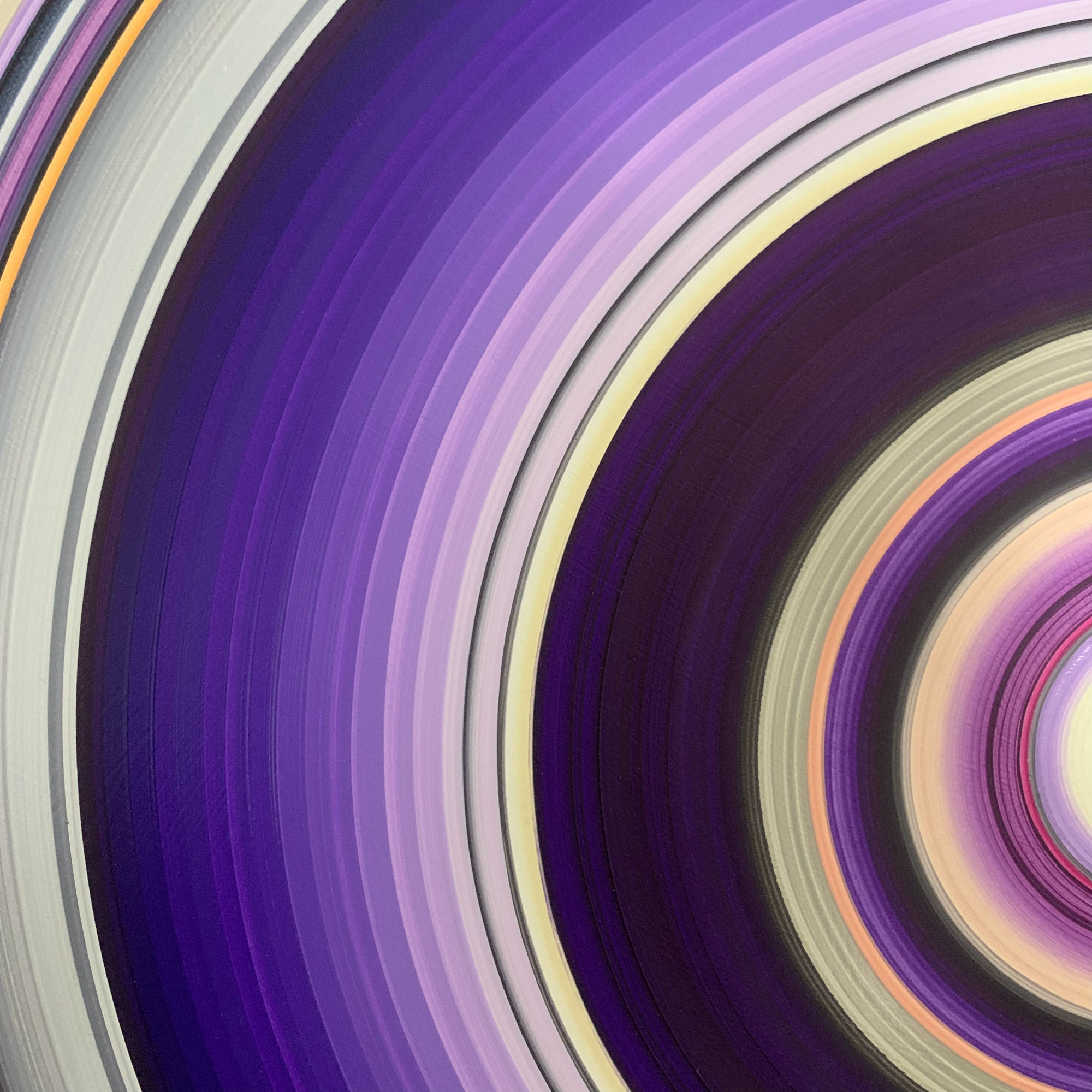 In this last series Sound and Vision, the line remains the only motif of the compositions, but it is illustrated on a new medium which is none other than a vinyl disk. In painting on a turntable, the artist transformed these acoustic data carriers into visual aids: as if the musical pieces are replayed with a brush, in a sort of transformation of sound into image. Individually made in an enduring search for a balance between line, colour and rhythm, these paintings make up an alphabet from which the artist draws on to create different installations and collections.