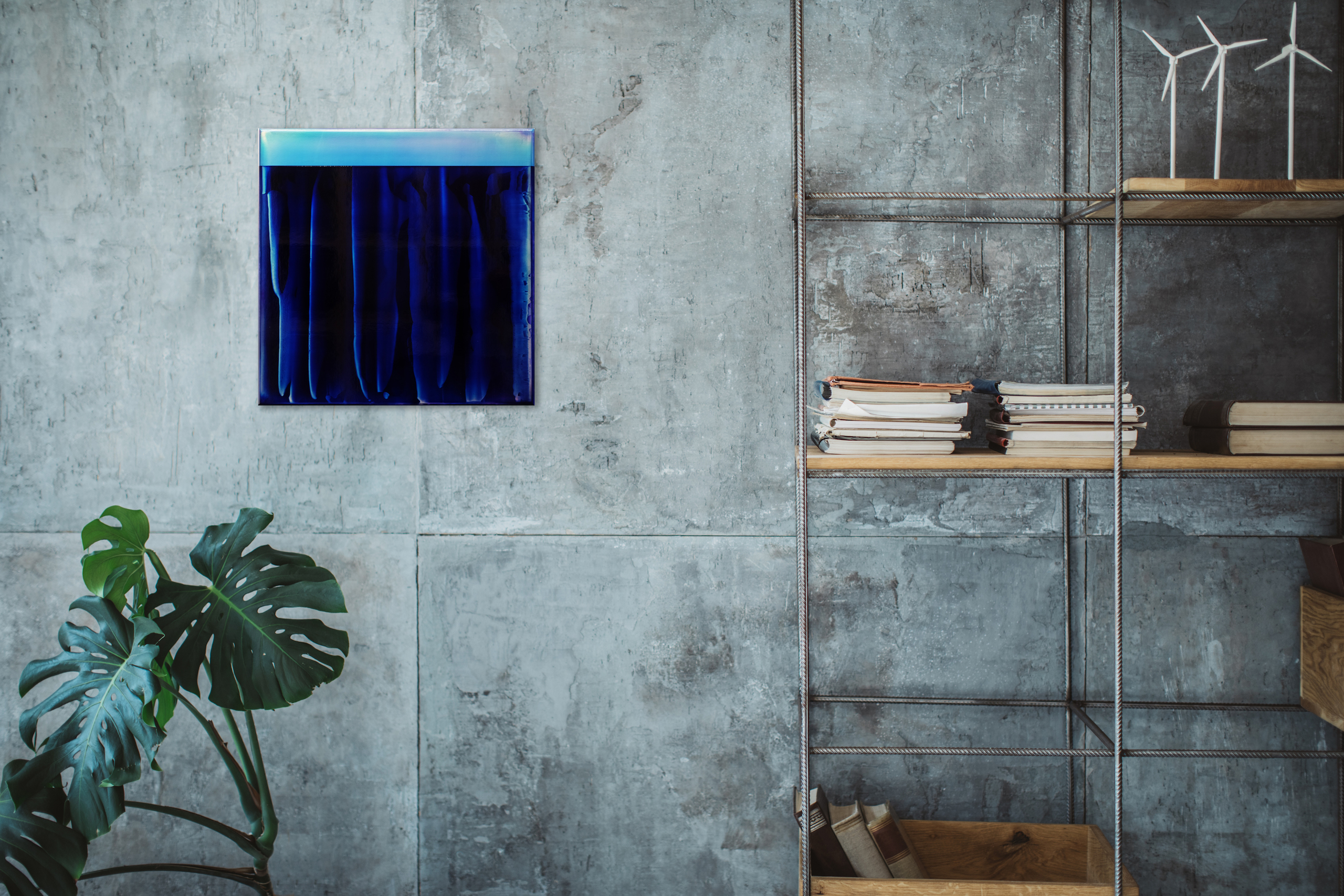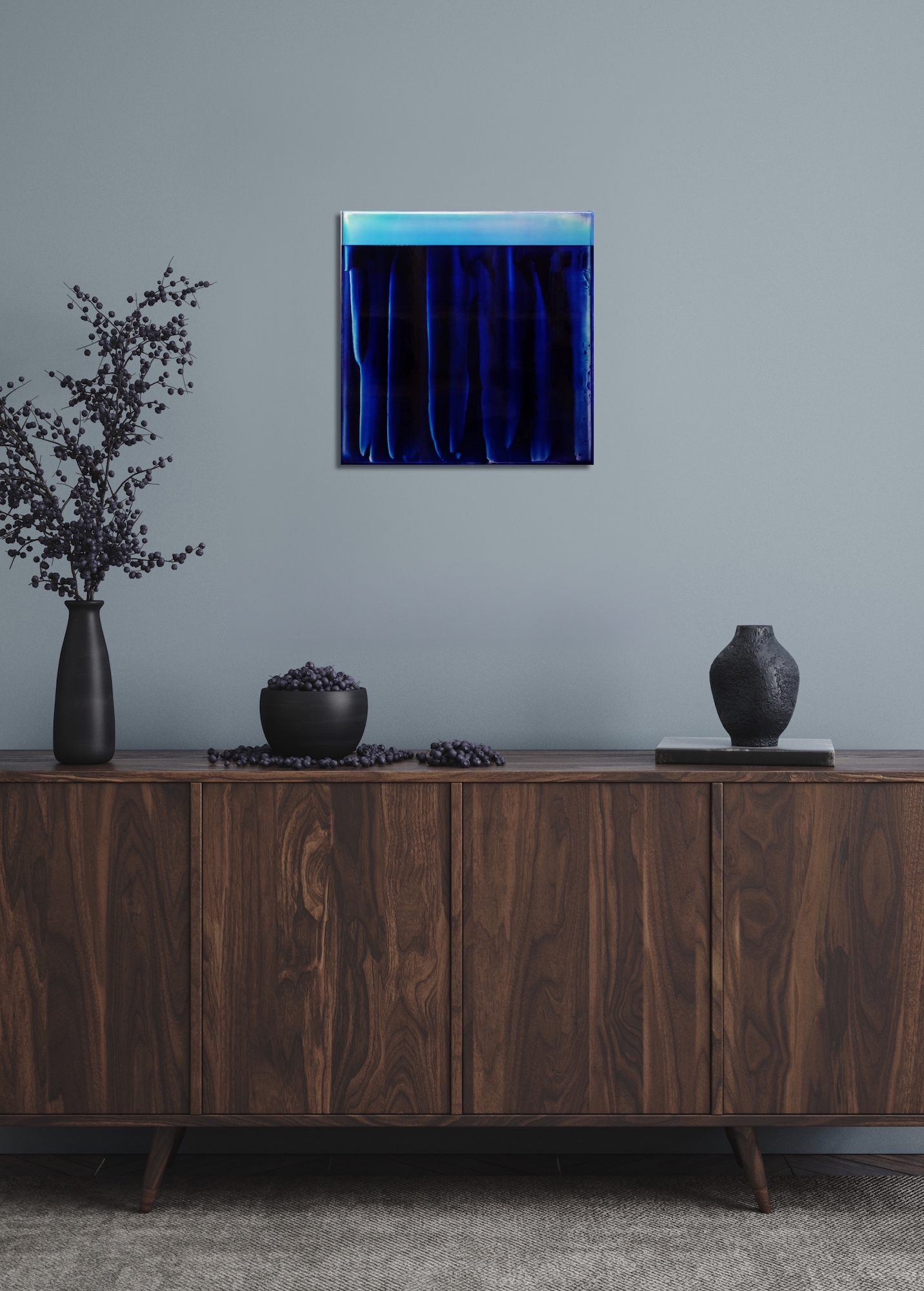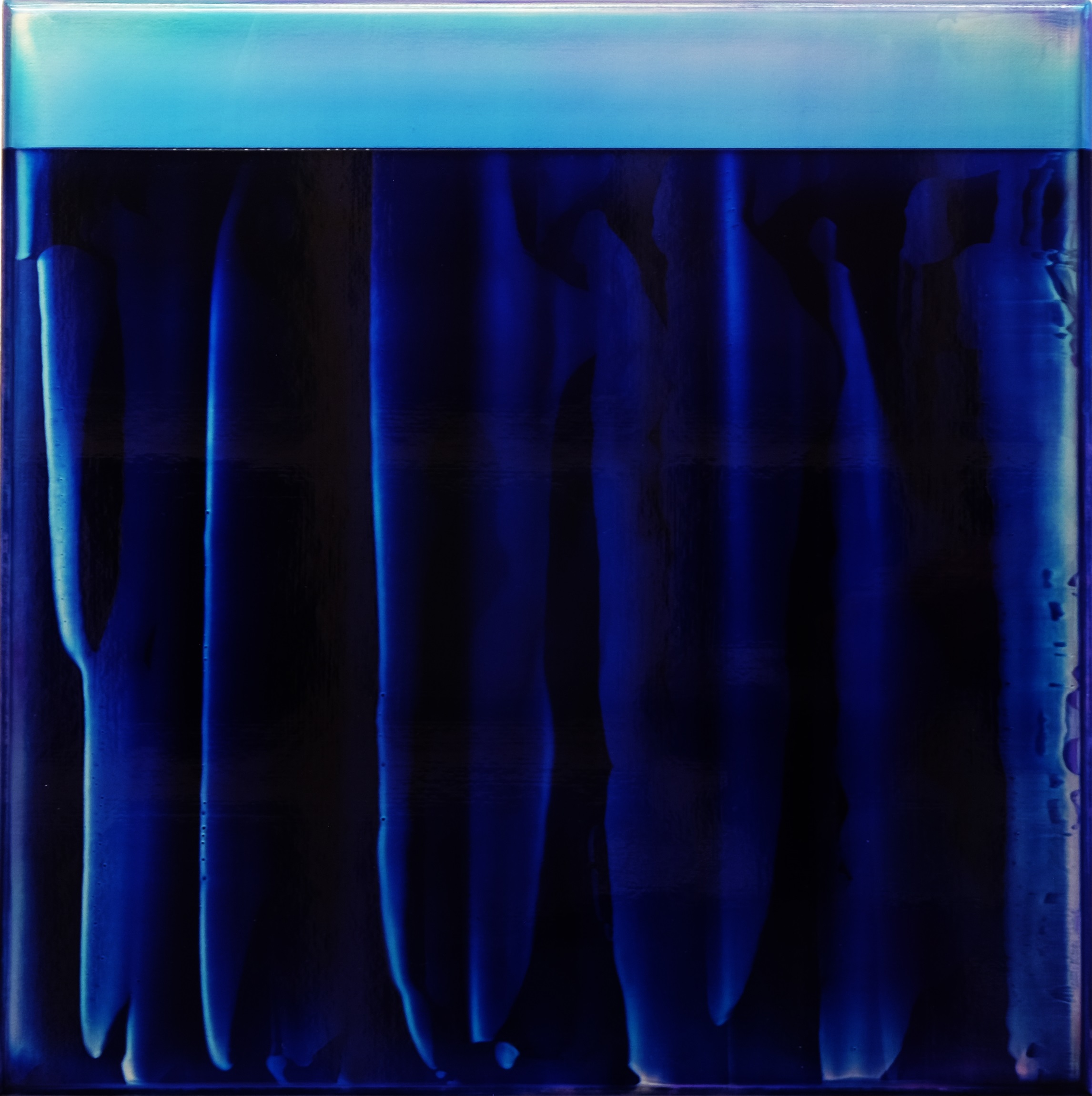 James Lumsden’s abstract paintings explore themes of light, colour and depth. His creative process involves superimposing dozens of thin layers of acrylic paint and gel gloss onto the canvas. This mixture is worked with specific tools to conceal or bring out traces and marks. Layer by layer, the artist succeeds in creating an illusion of depth and light within the painting, immersing the viewer in a mysterious and seductive universe.