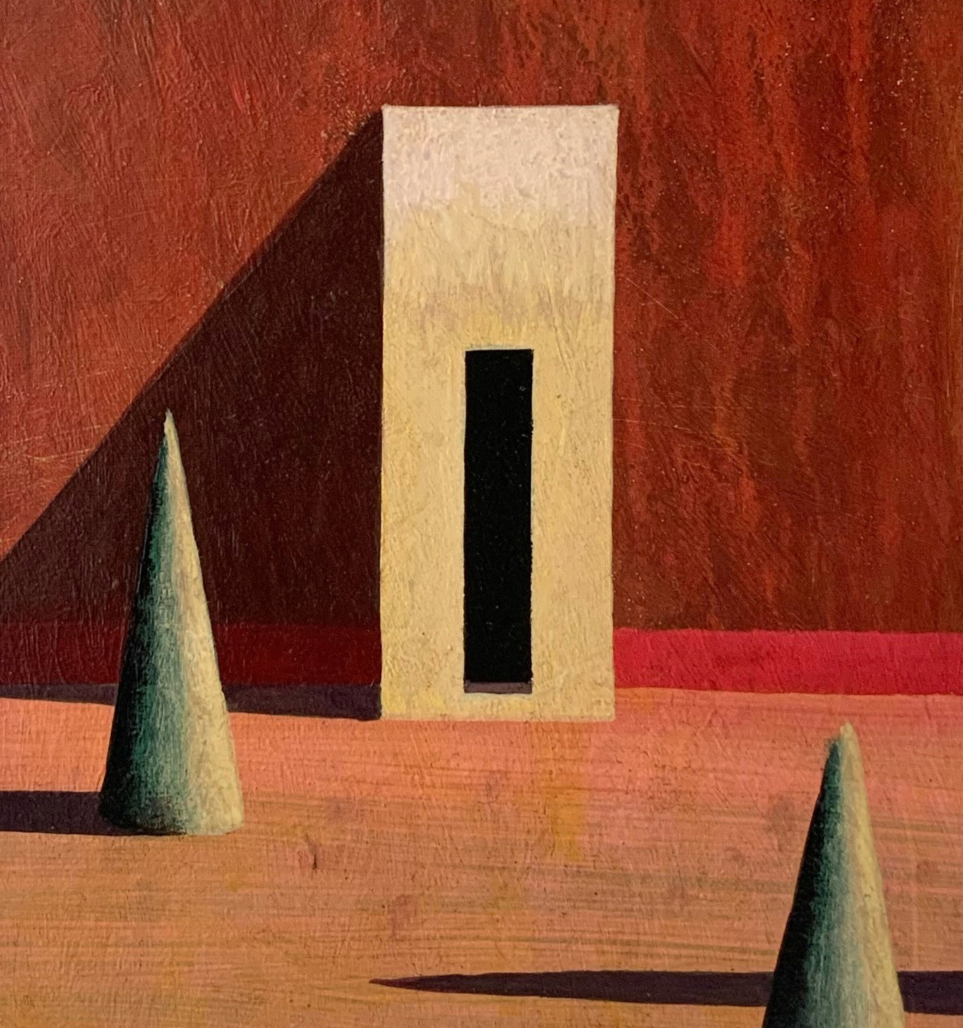 In these paintings, the artist establishes a conversation between architecture and landscape in a figurative work boasting geometric shapes and an enigmatic atmosphere. The landscapes and the simplicity of the forms (near abstract) make for a very theatrical view of architecture.