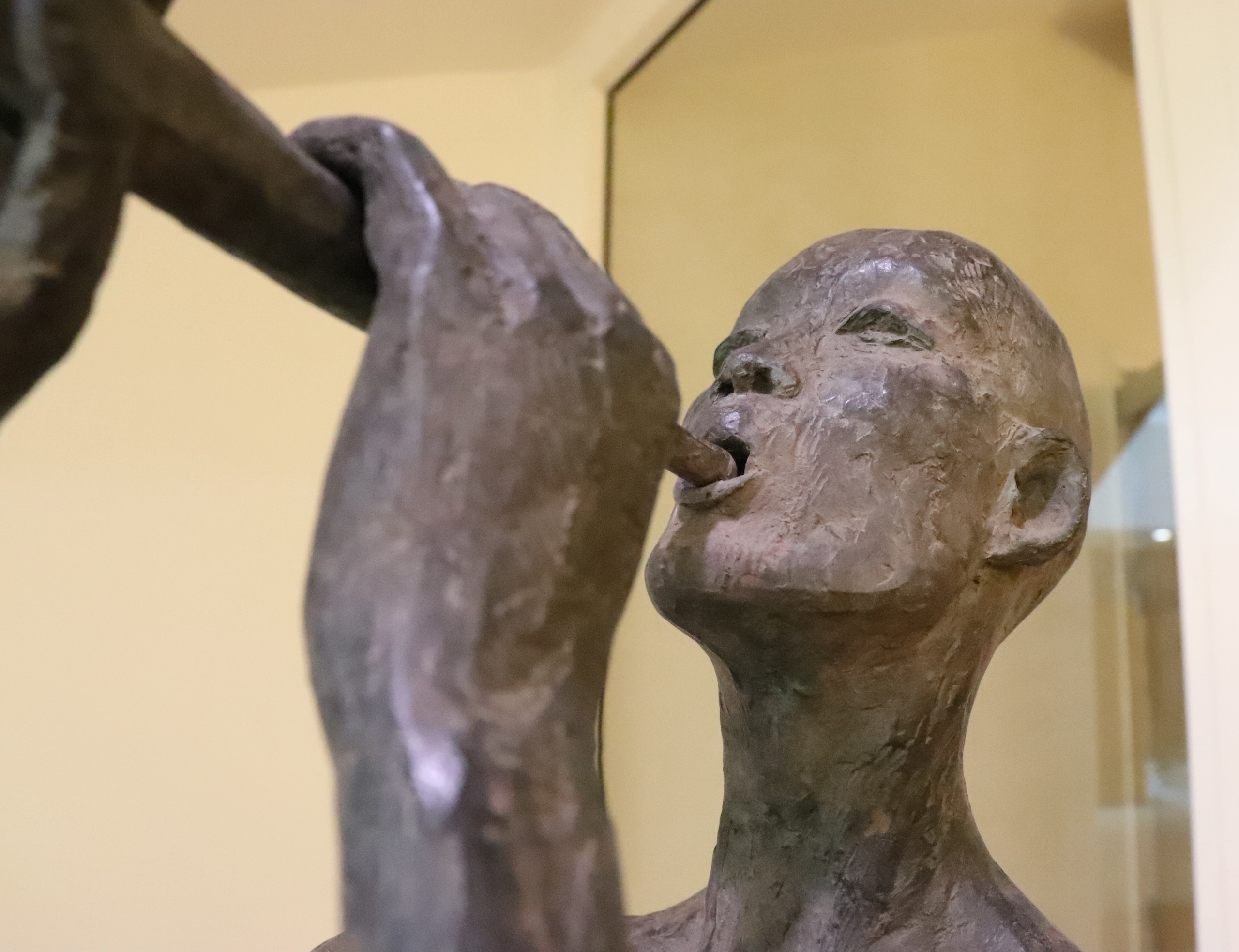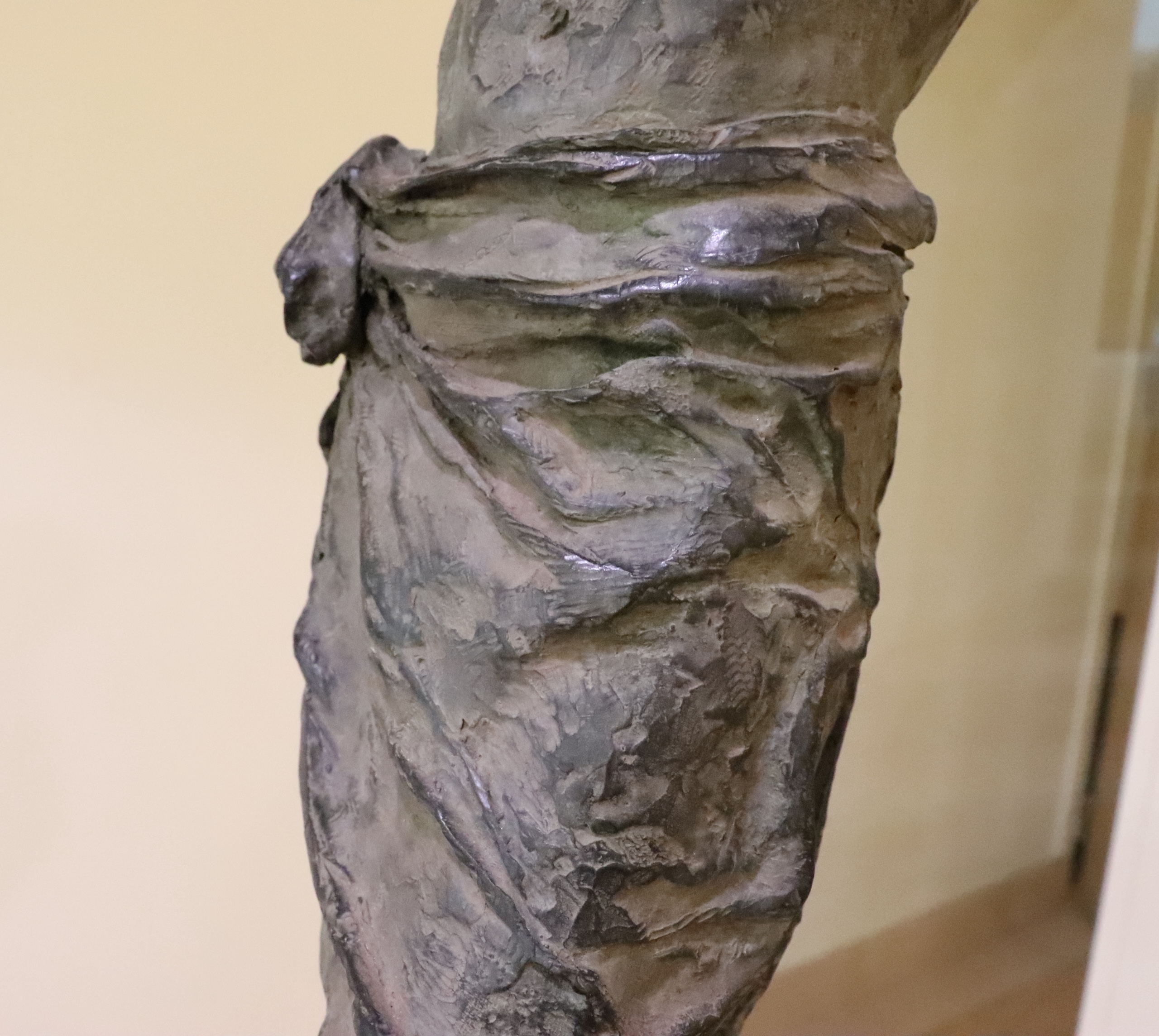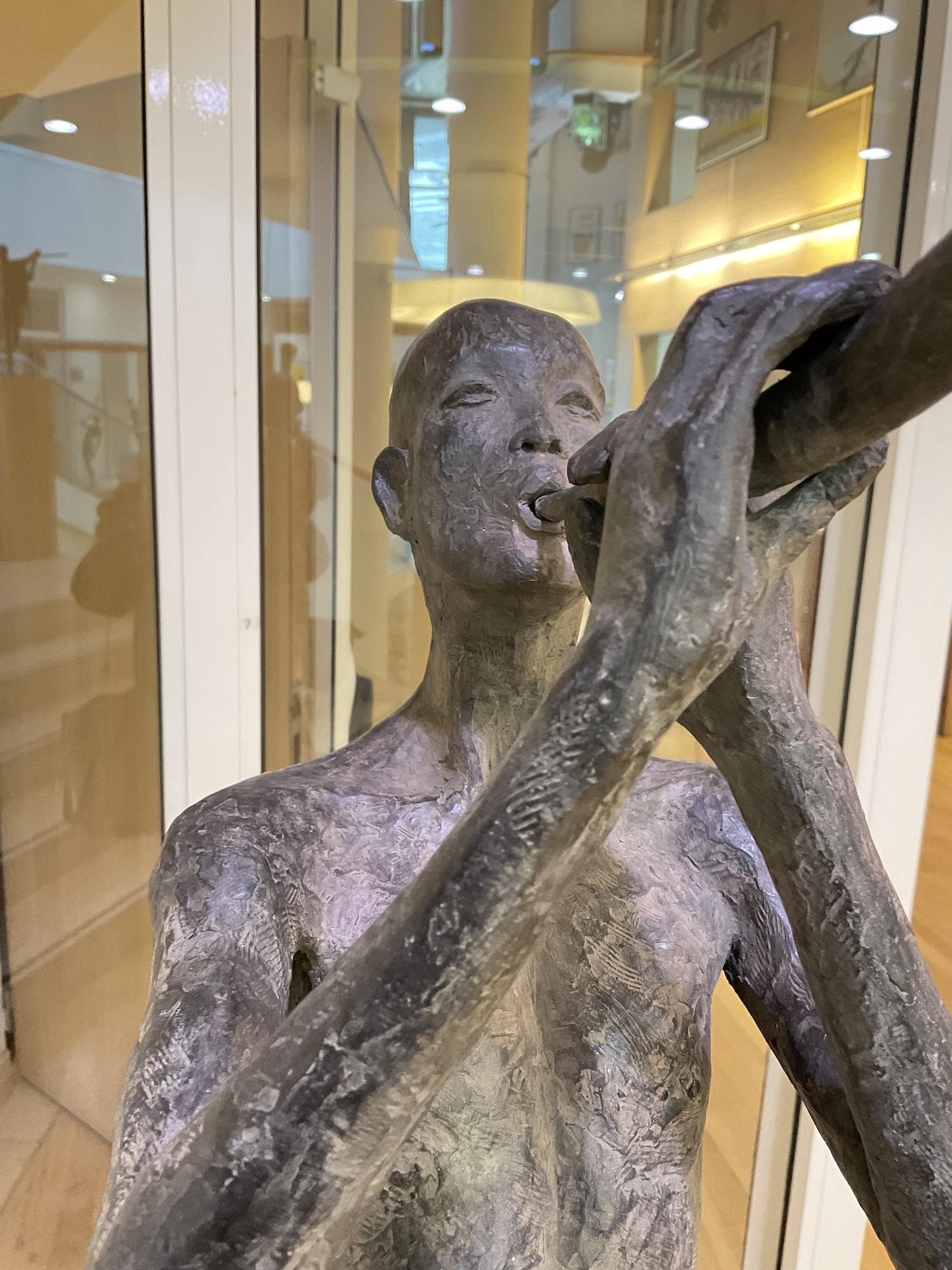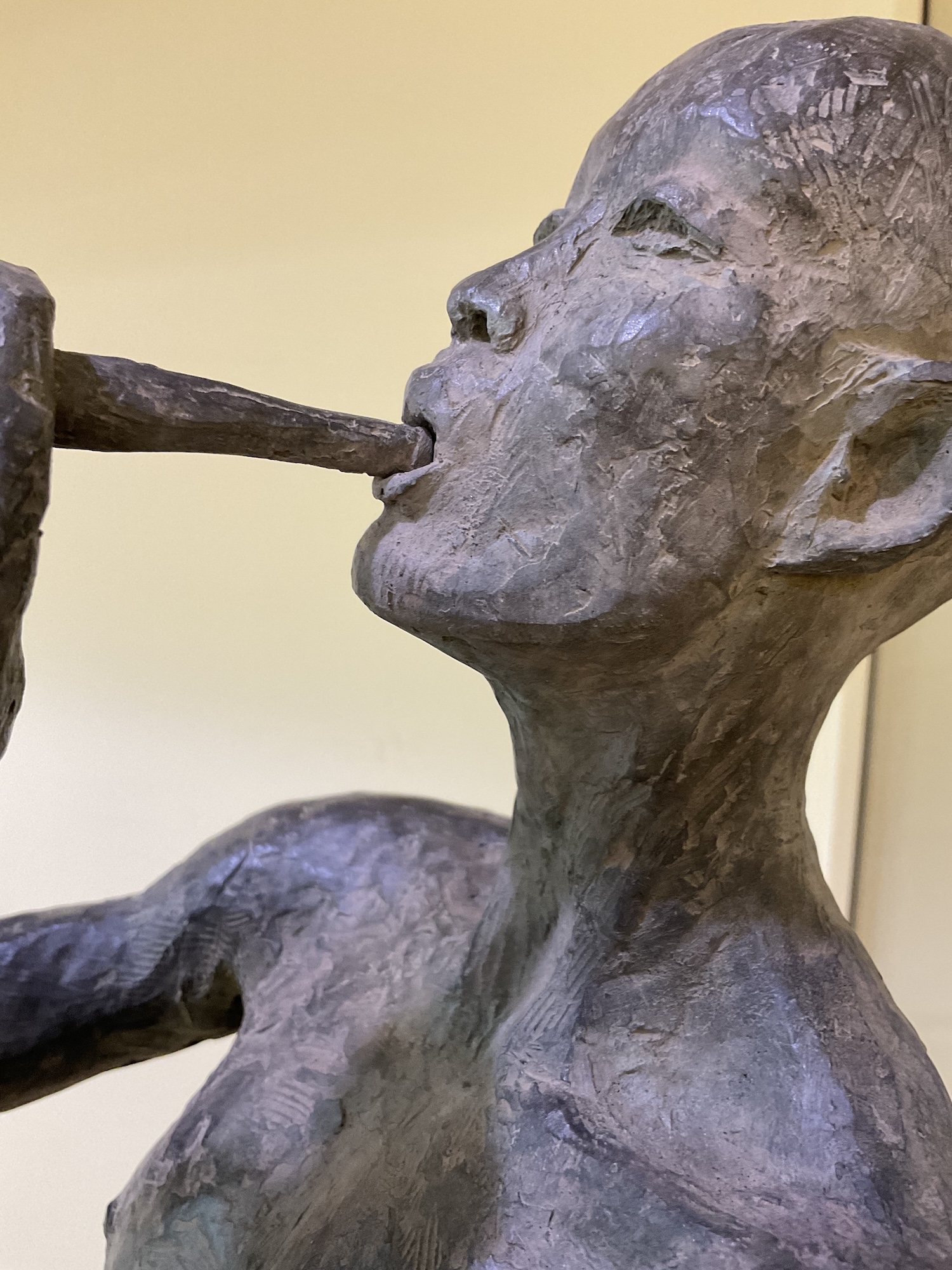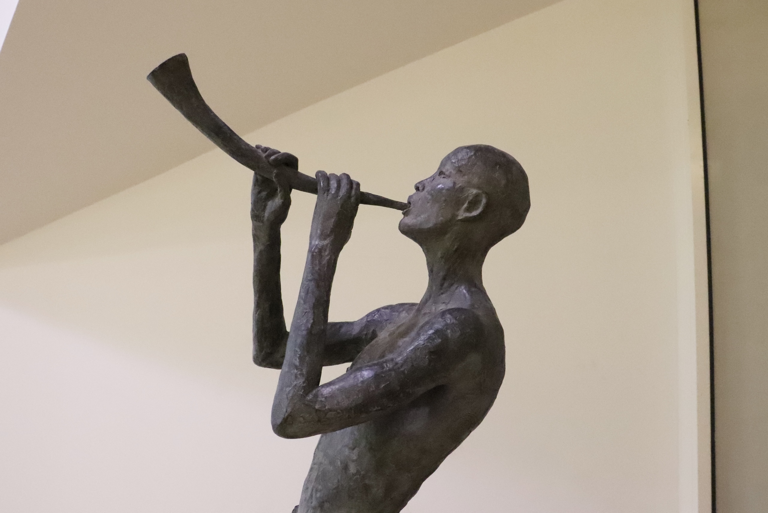 Promise at Dawn (Large) is an artwork by French contemporary sculptor Marine de Soos. This bronze sculpture is from the “Figures” series. This figurative artwork represents a man, simply dressed, blowing a horn. The artist gets her inspiration from real or imaginary scenes. This sculpture could be placed in an outside setting.