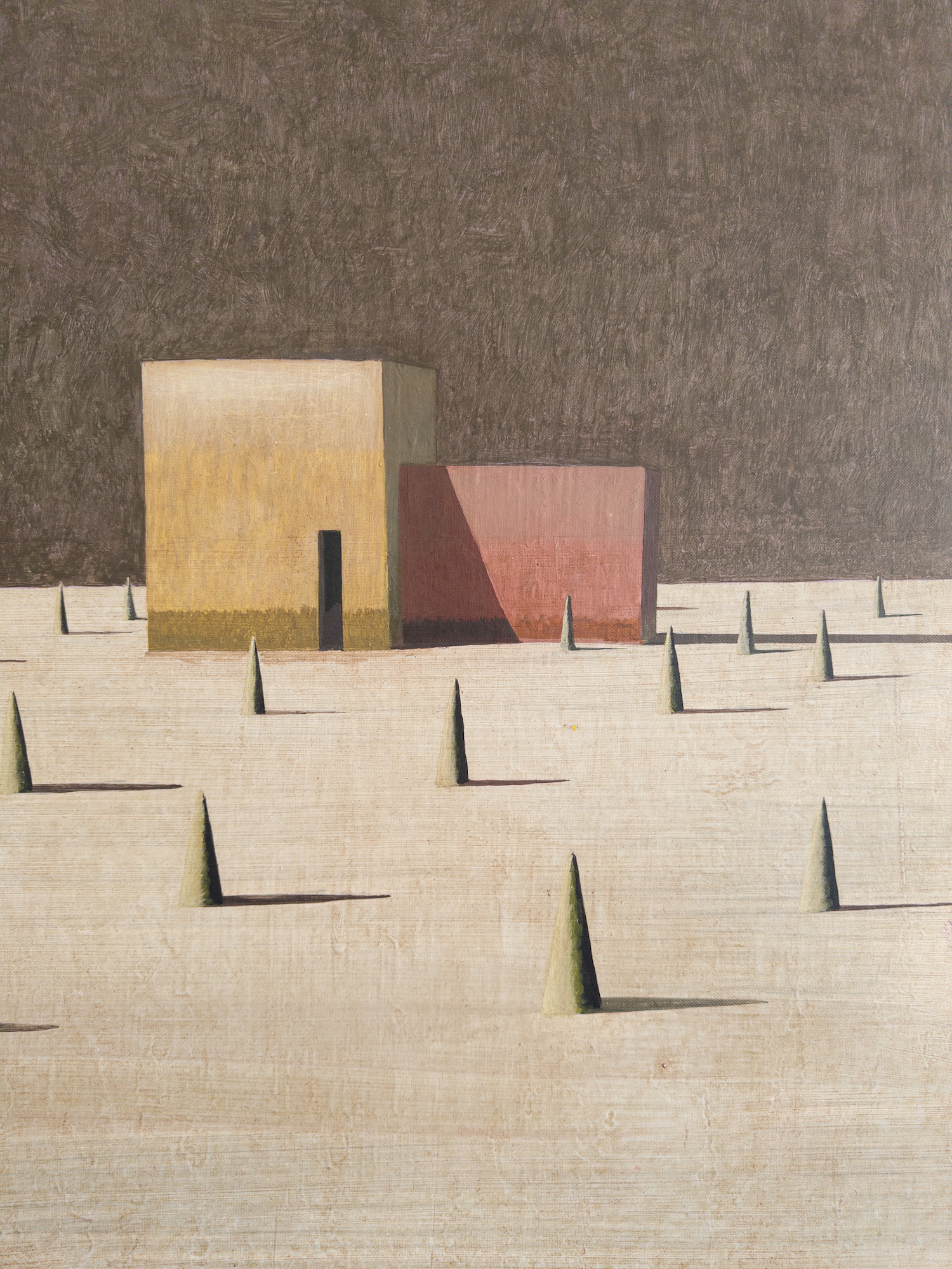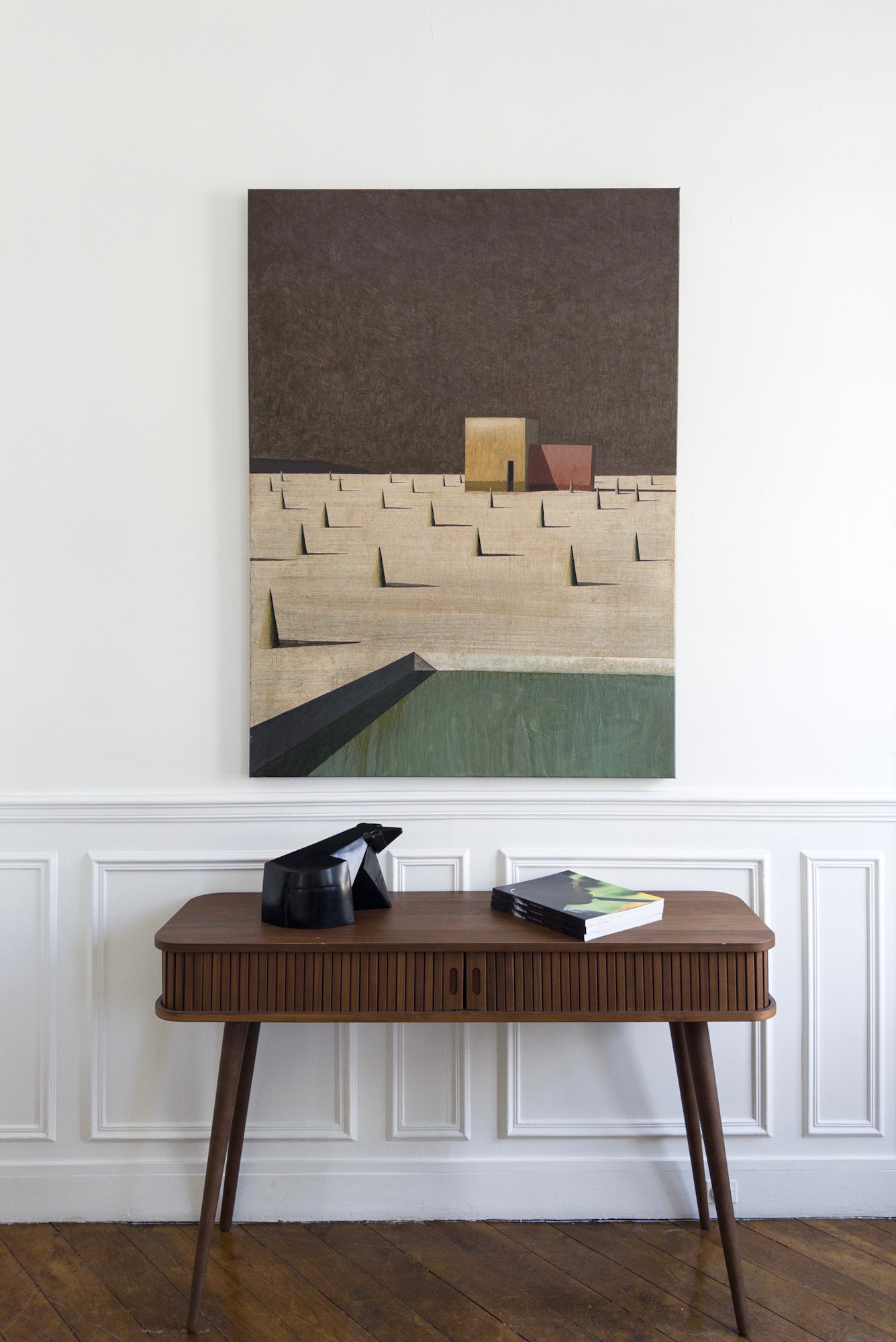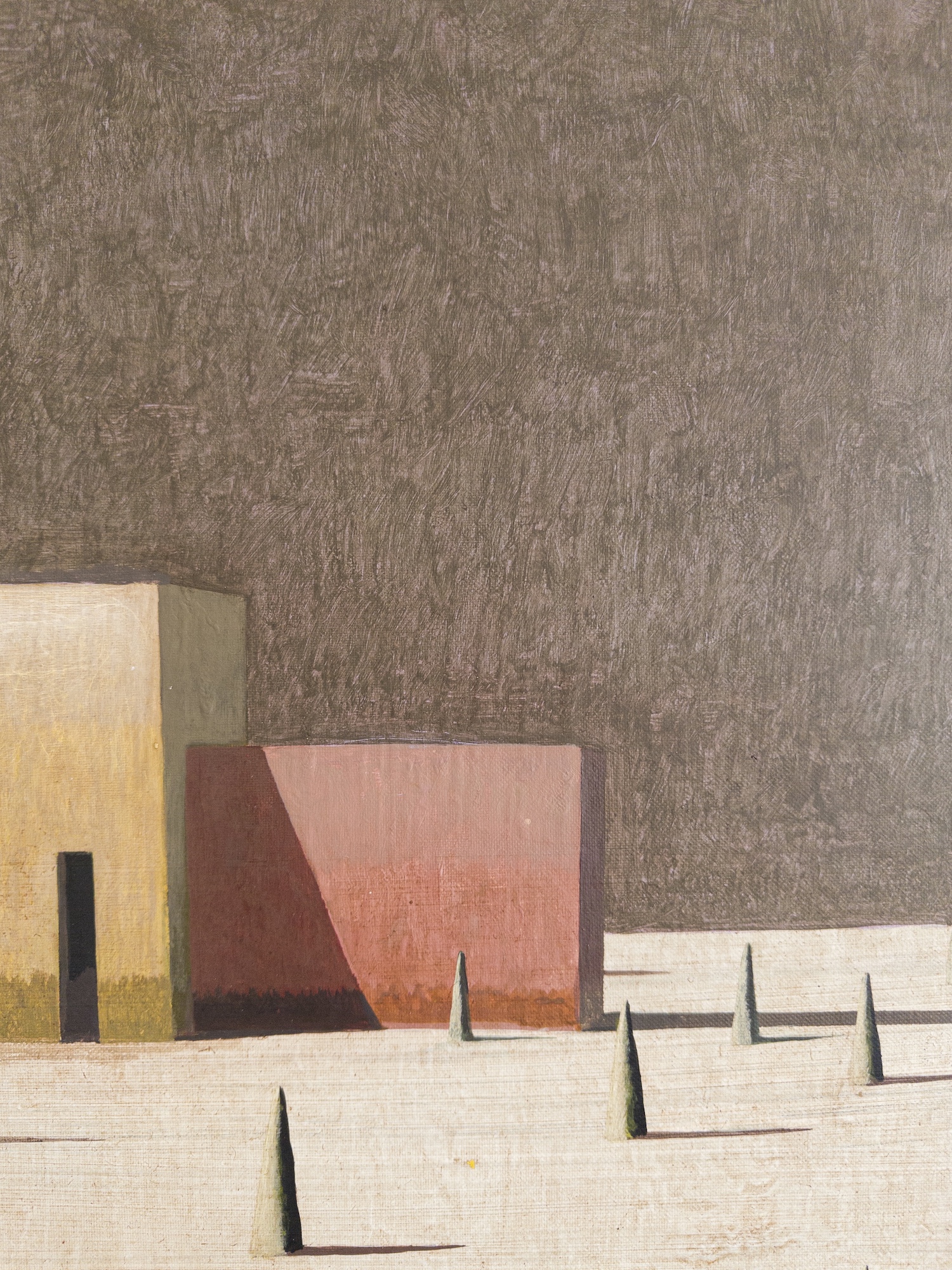 In these paintings, the artist establishes a conversation between architecture and landscape in a figurative work boasting geometric shapes and an enigmatic atmosphere. The landscapes and the simplicity of the forms (nearly abstract) make for a very theatrical view of architecture.