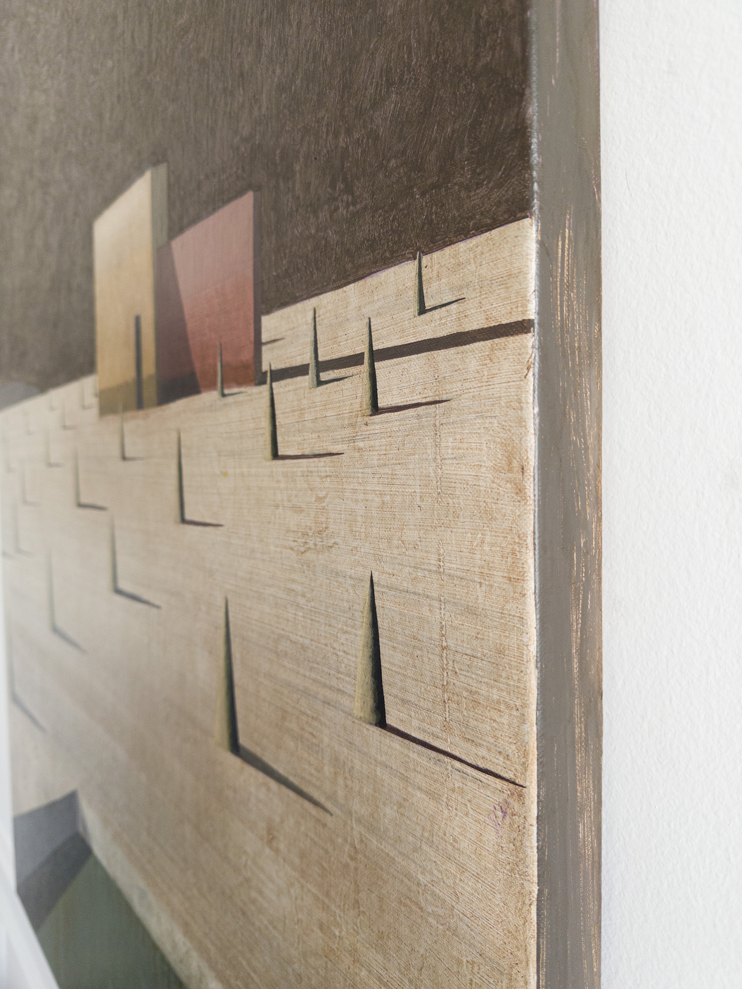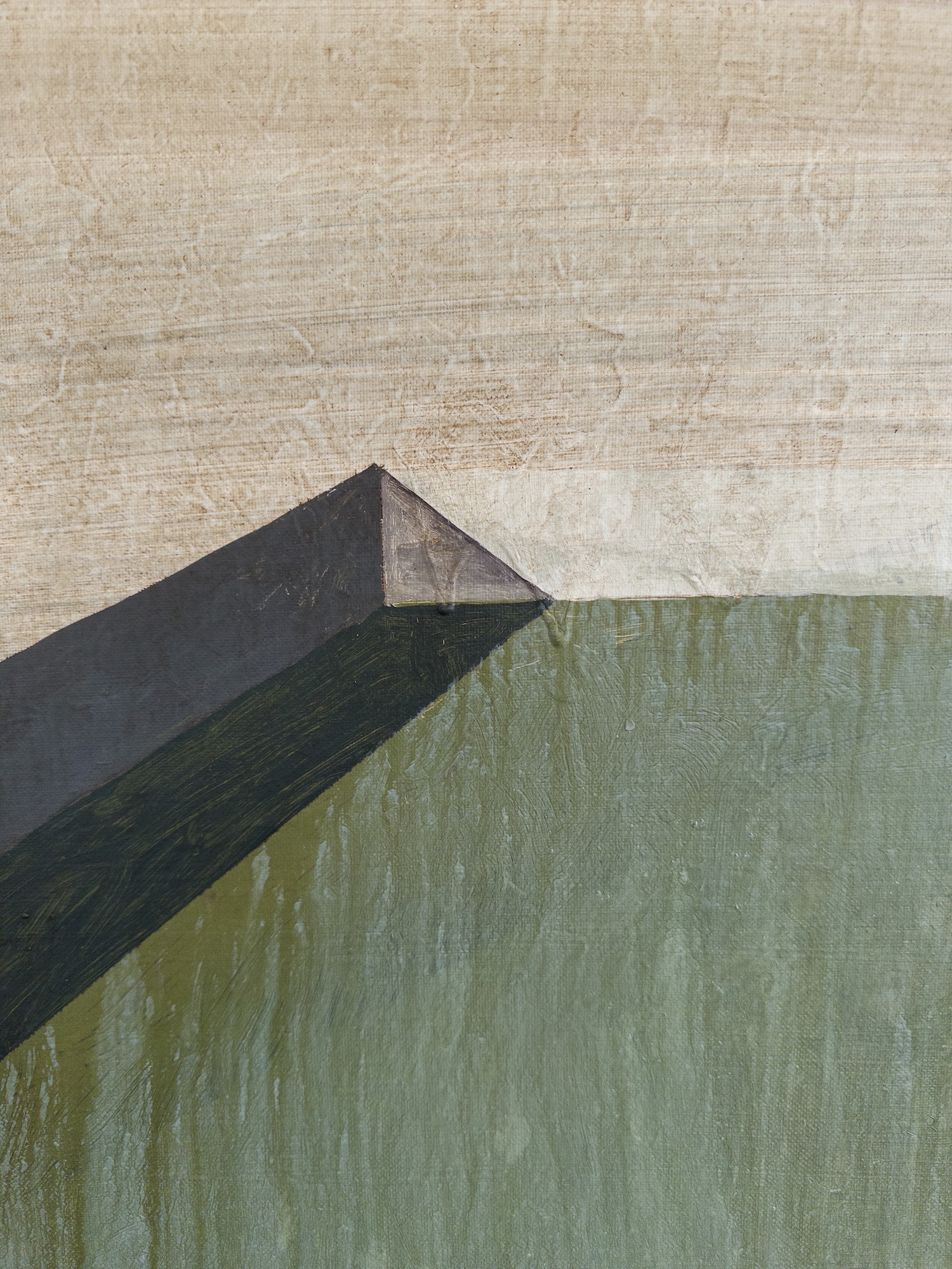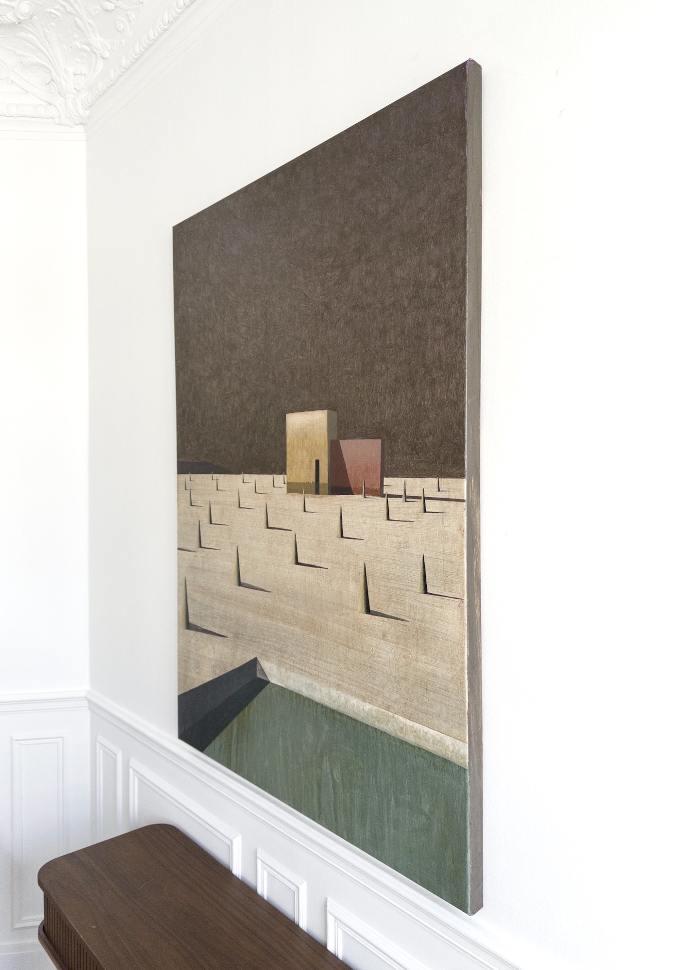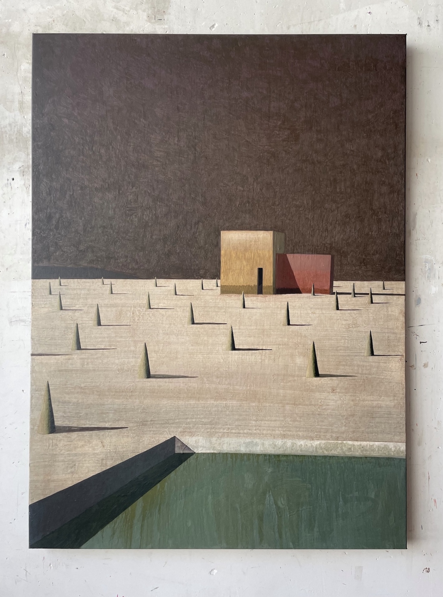 In these paintings, the artist establishes a conversation between architecture and landscape in a figurative work boasting geometric shapes and an enigmatic atmosphere. The landscapes and the simplicity of the forms (nearly abstract) make for a very theatrical view of architecture.