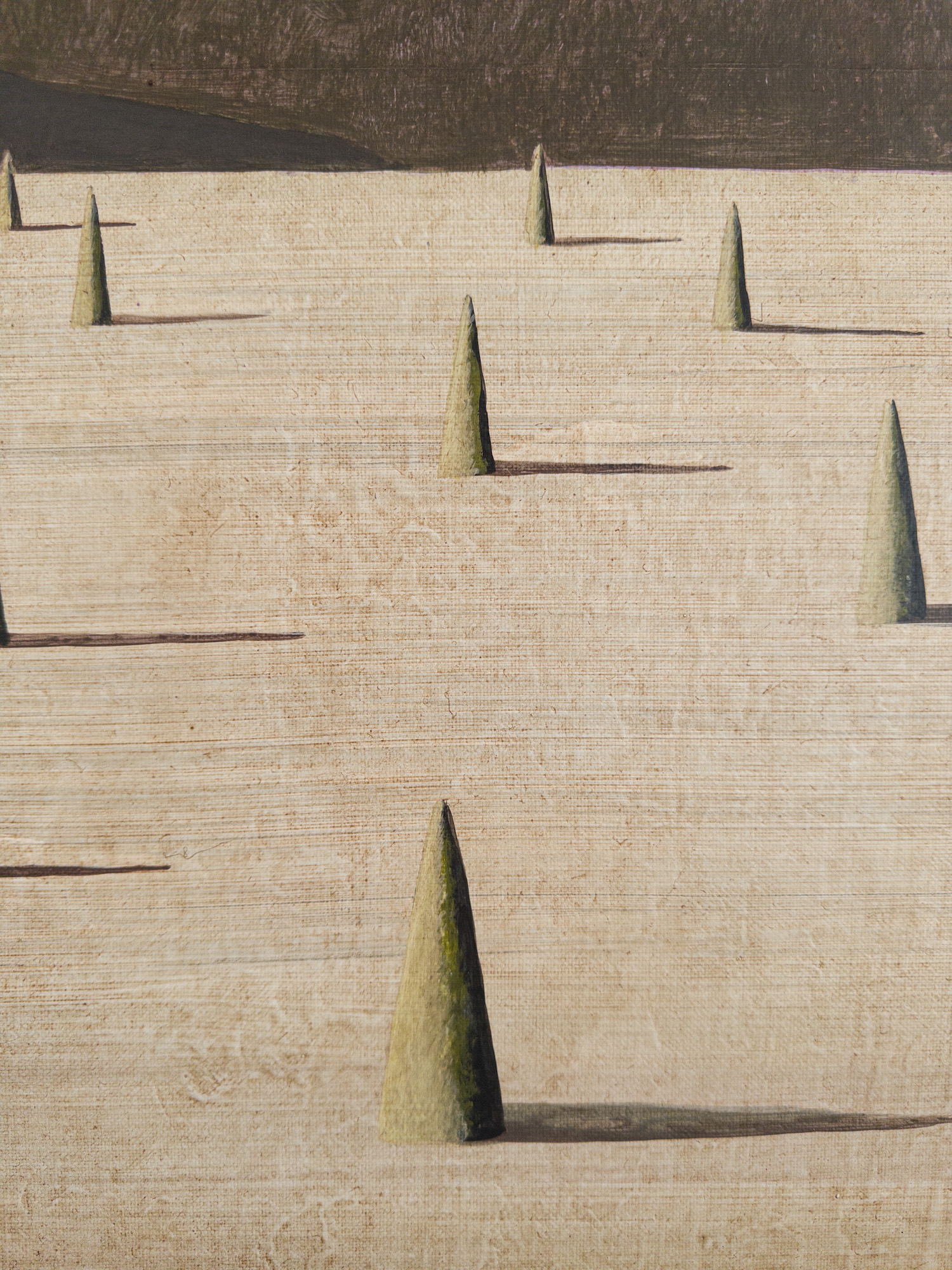 The painting depicts a minimalist landscape with two geometric buildings, cone-shaped trees arranged in a grid, and a green pool in the foreground under a dark textured sky.