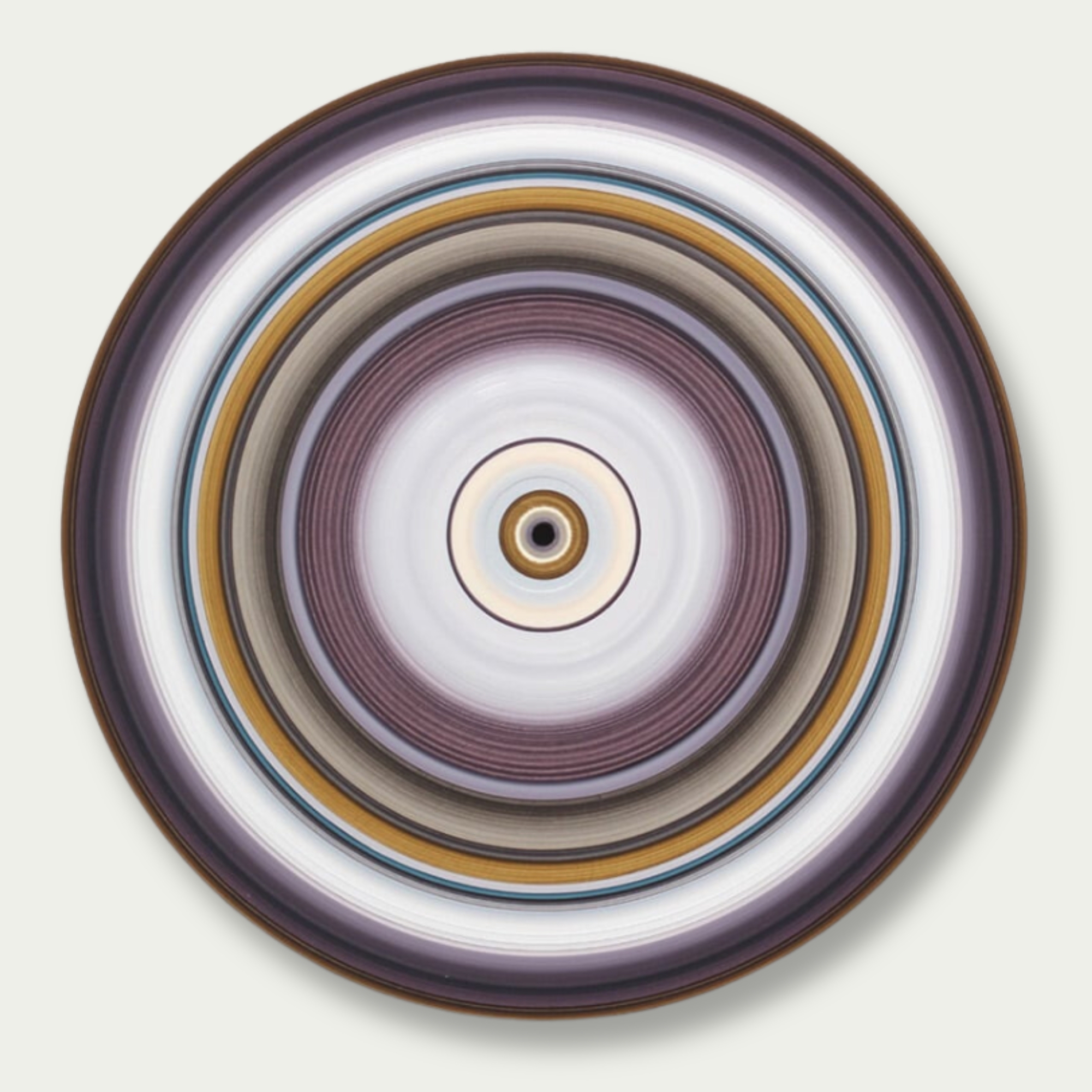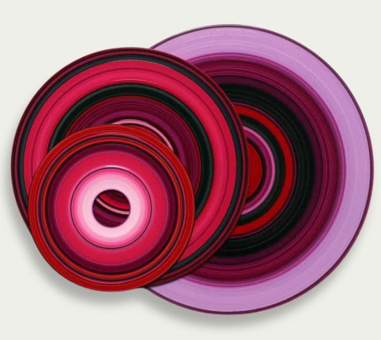 In this last series Sound and Vision, the line remains the only motif of the compositions, but it is illustrated on a new medium which is none other than a vinyl disk. In painting on a turntable, the artist transformed these acoustic data carriers into visual aids: as if the musical pieces are replayed with a brush, in a sort of transformation of sound into image. Individually made in an enduring search for a balance between line, colour and rhythm, these paintings make up an alphabet from which the artist draws on to create different installations and collections.