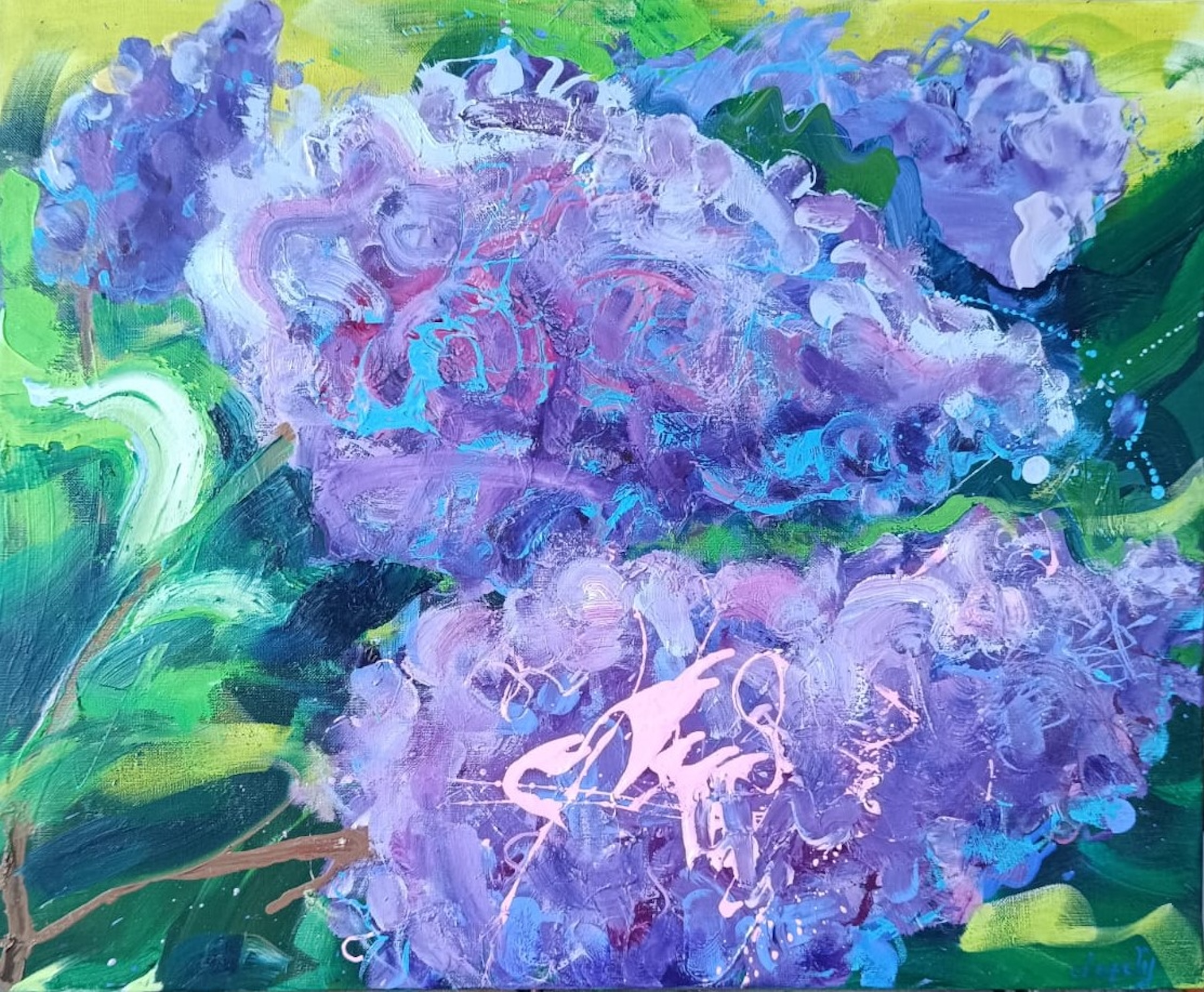 Reclining Lilacs is a painting by French contemporary artist Christophe Dupety. In this work, executed with oil on canvas, large, dense brushstrokes in shades of lilac, mauve, and deep purple dominate the foreground. The masses of flowers are animated by unexpected touches of bright pink and turquoise blue, creating a strong sense of texture. These rich floral forms are set against a luminous background of chartreuse and emerald green foliage, emphasizing the feeling of a lush, blooming garden.