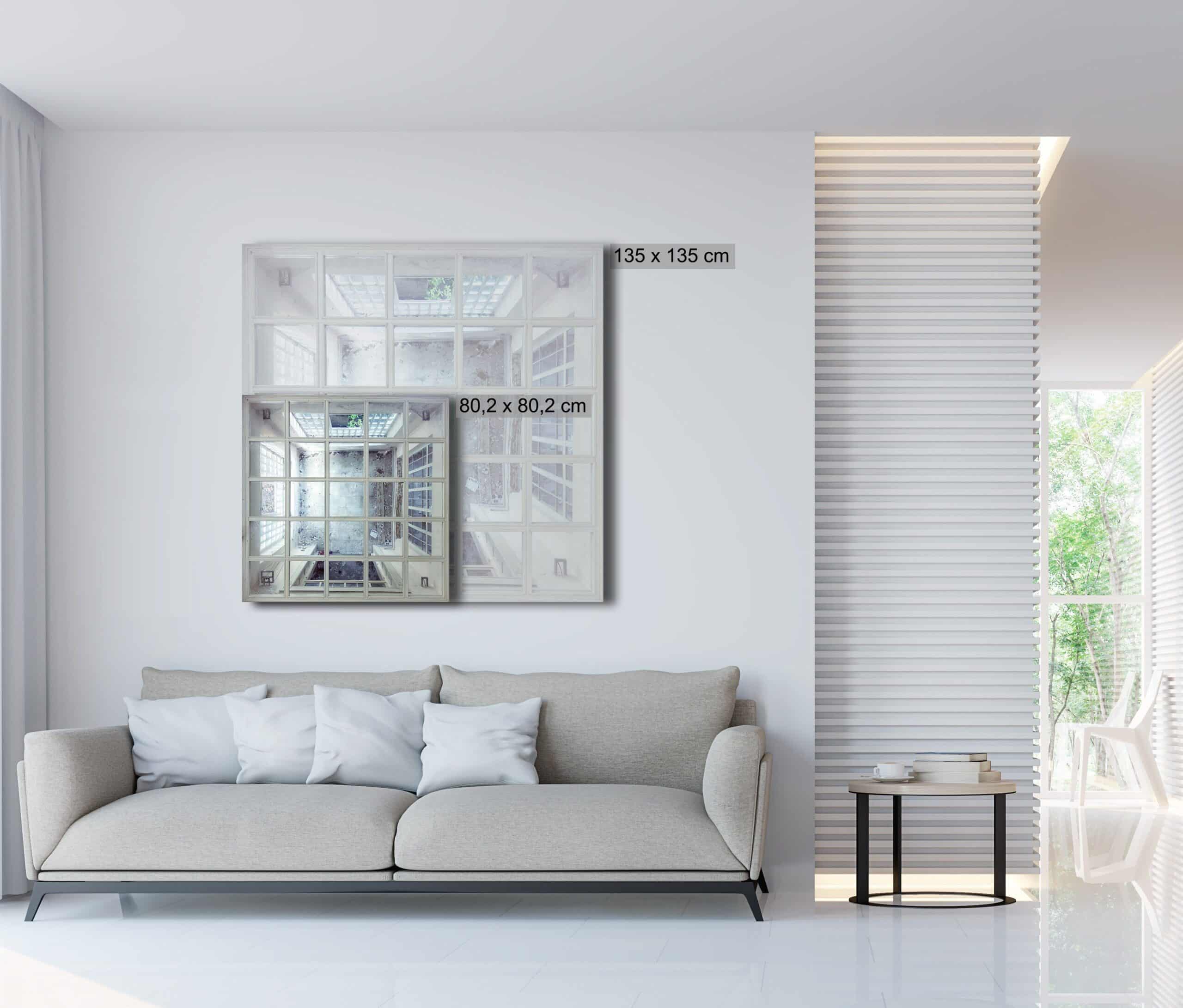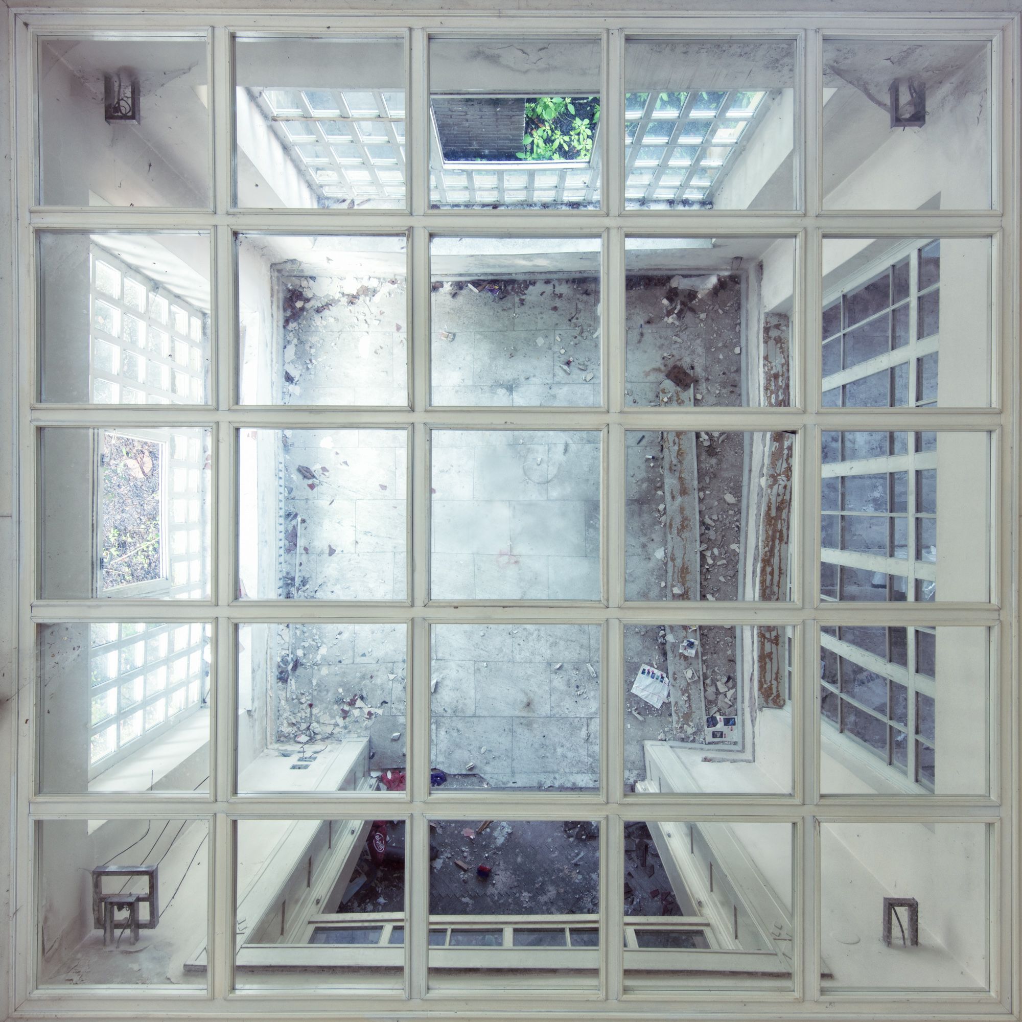 It was taken in an abandoned manor house in the Czech Republic. The artist narrates the creation of this photograph: “It was an unusual room full of glass blocks and a mirrored ceiling. I photographed the room while lying down on the floor looking up with a wide-angle lens and cropped the image later to frame as a square piece.”